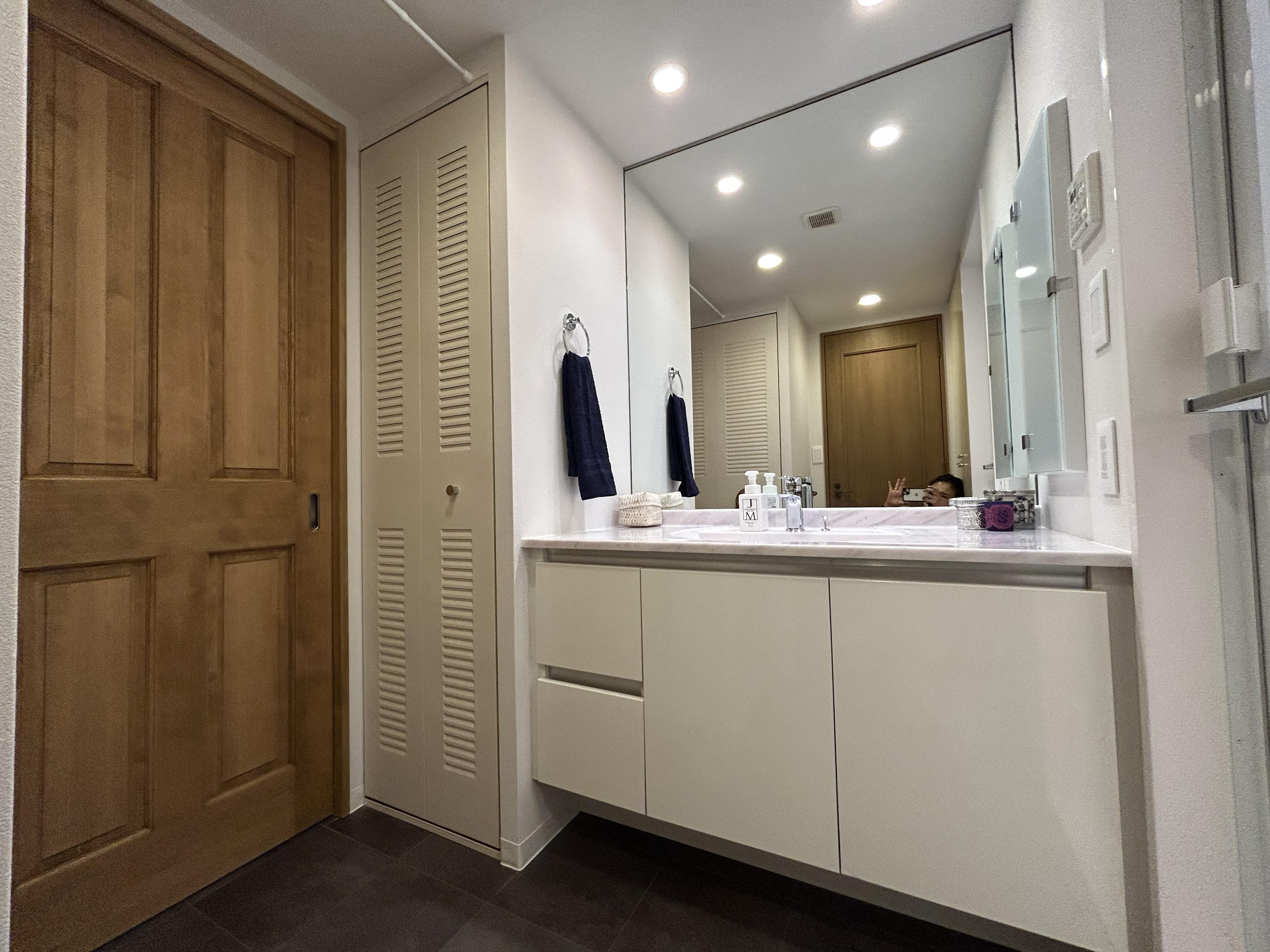 キッチンの扉を開けると広がる洗面化粧室。床はキッチンと合わせることで一体感が生まれ、扉を開けた際に一つの空間のように広く感じます。洗面化粧台の大きな鏡は既存のモノを活かし、下台だけLIXILのルミシスを採用。トップは浴室の壁に合わせた柄でボウル一体型のラピシアカウンターに。写真右側の埋込収納も新しく取り替えました。左側の収納の内部には可動棚を新たに設置。掃除機用のコンセントも収納時に充電できるよう高さや奥行にこだわり新しく設けました。洗面化粧台:LIXIL ルミシス ボウル一体型埋込収納:KAWAJUN メディシンボックス(埋込型) DE-03