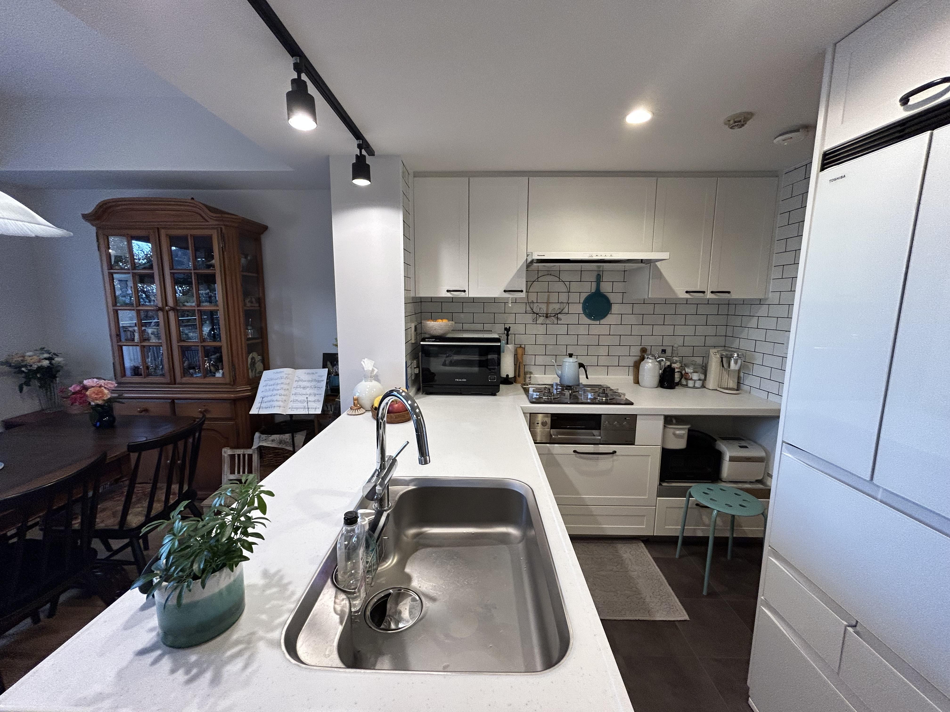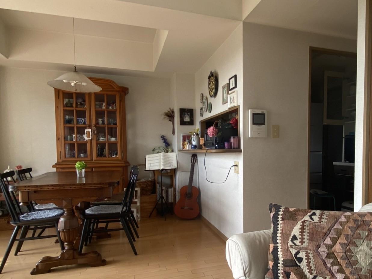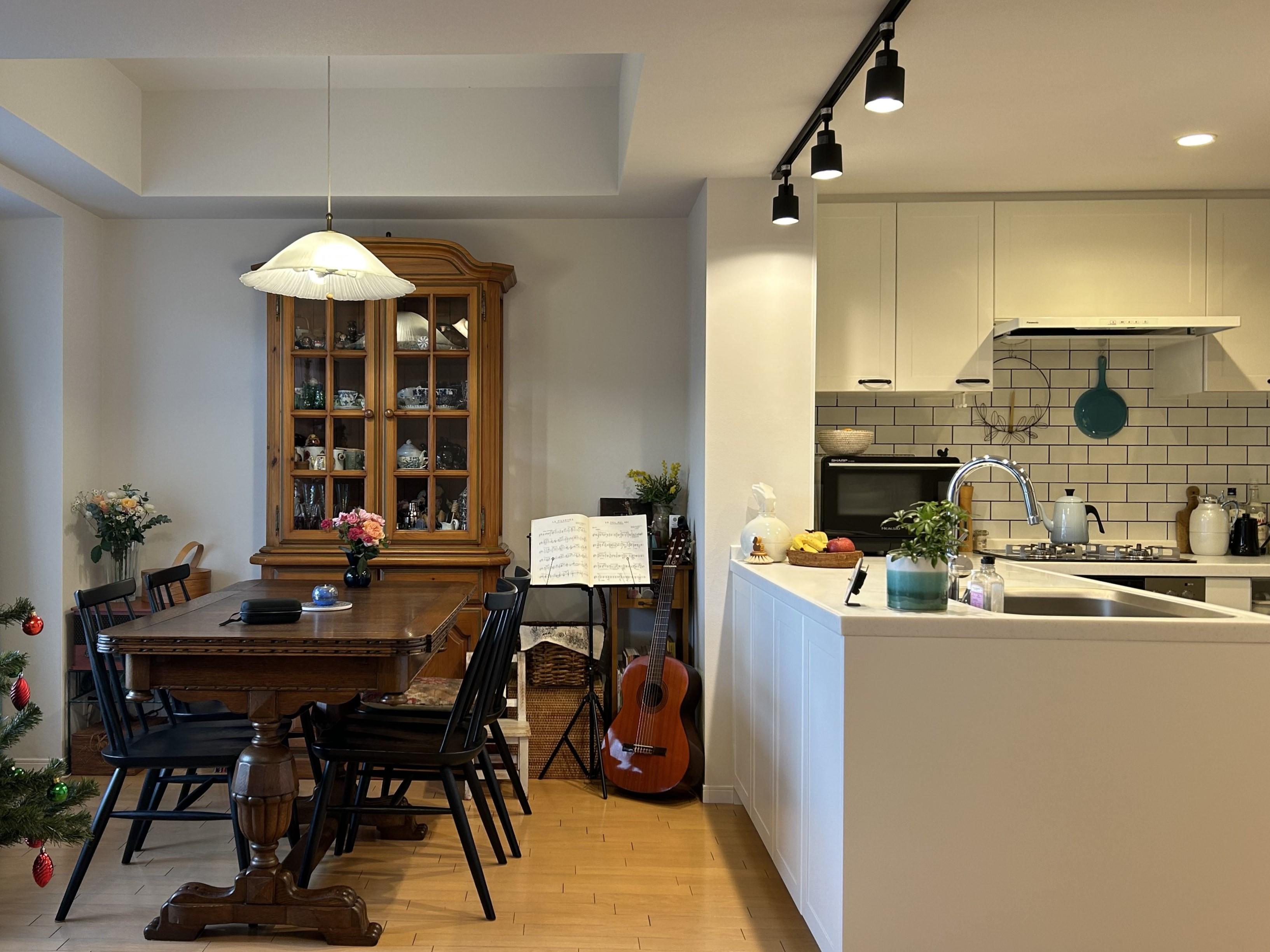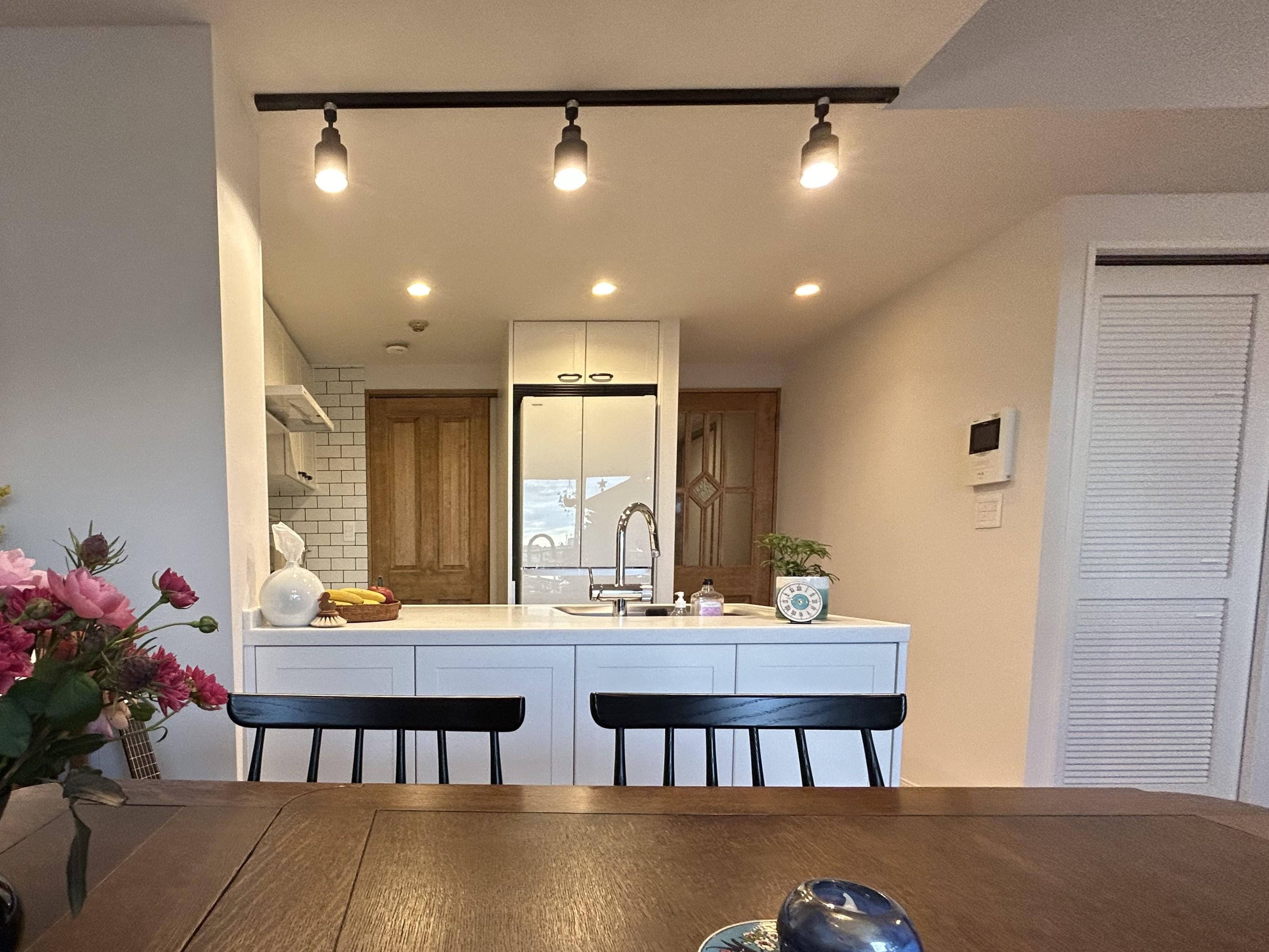 キッチンのライトは調色調光機能付き。温白色、昼白色、電球色と切り替えができるので、料理中は昼白色、読書中は温白色、リラックスタイムには電球色と用途に応じた使い分けが可能です。キッチン奥に見える扉はどちらも天然木材のオーダー品。冷蔵庫左の扉は引戸、右は開き戸になっています。開き戸には2種類のガラスがはめ込まれており、光の揺らめきを感じることができます。写真右側の白色の引戸は和室につながる扉。こちらも新しいものに交換。扉を閉めたままルーバーを開放して風の通り道をつくります。ベランダからの風が和室にも行き渡り、省エネにもつながる機能性に優れた通風タイプです。建具:【天然木材の扉】引戸・開き戸 ウッドセッション オーダー品 【和室への扉】引戸 LIXIL ラシッサS LTA(通風タイプ)