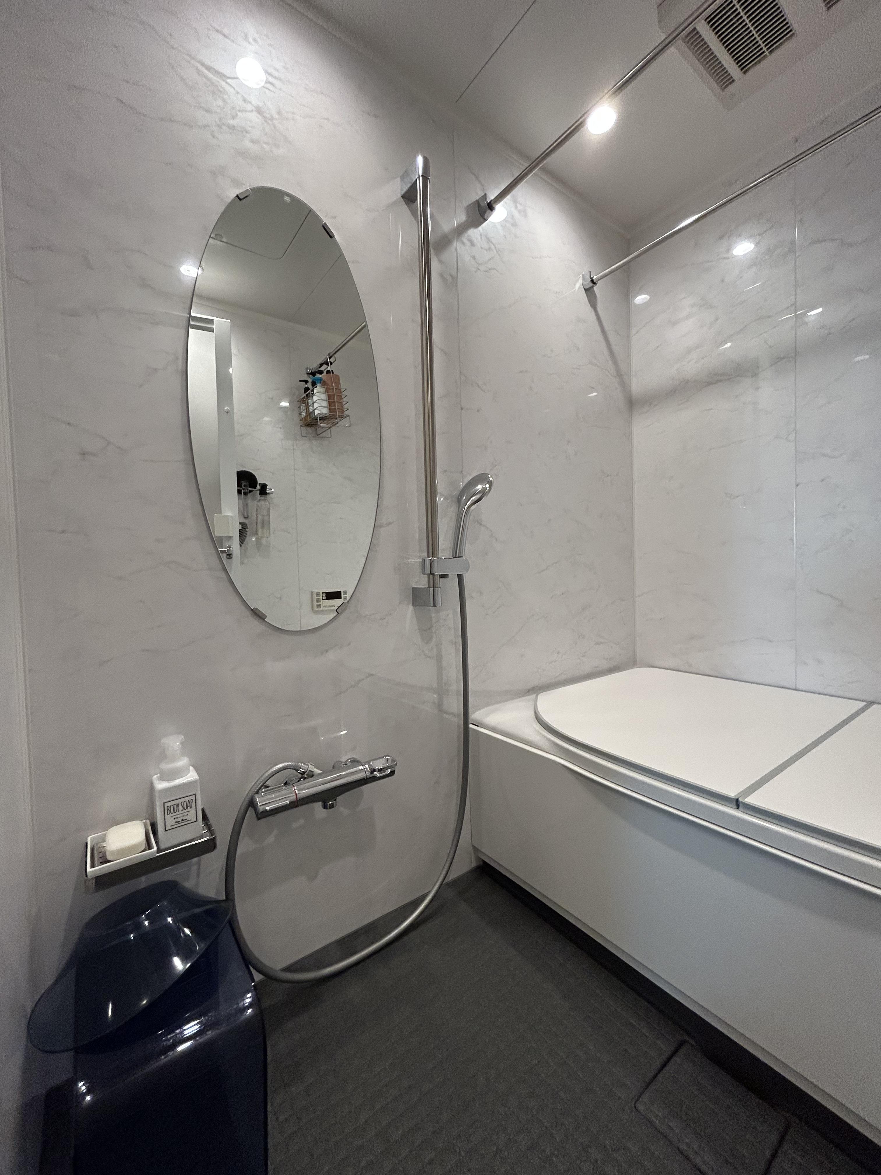 鏡を楕円形のものにしてシンプルながらにデザイン性をプラス。石鹸置き場のため、棚トレーを通常3段のものを1段のみ設置しました。ほかのシャンプーリンスなどのボトルは籠に入れ、パイプに掛けて収納。水切れもするのでボトルの下のヌメリ防止に。壁の柄は浴室横の洗面化粧室にある洗面台のトップカウンターの柄に近いデザインを選択。家事動線ひとつながりの水廻りに統一感が生まれます。浴室:LIXIL リノビオV