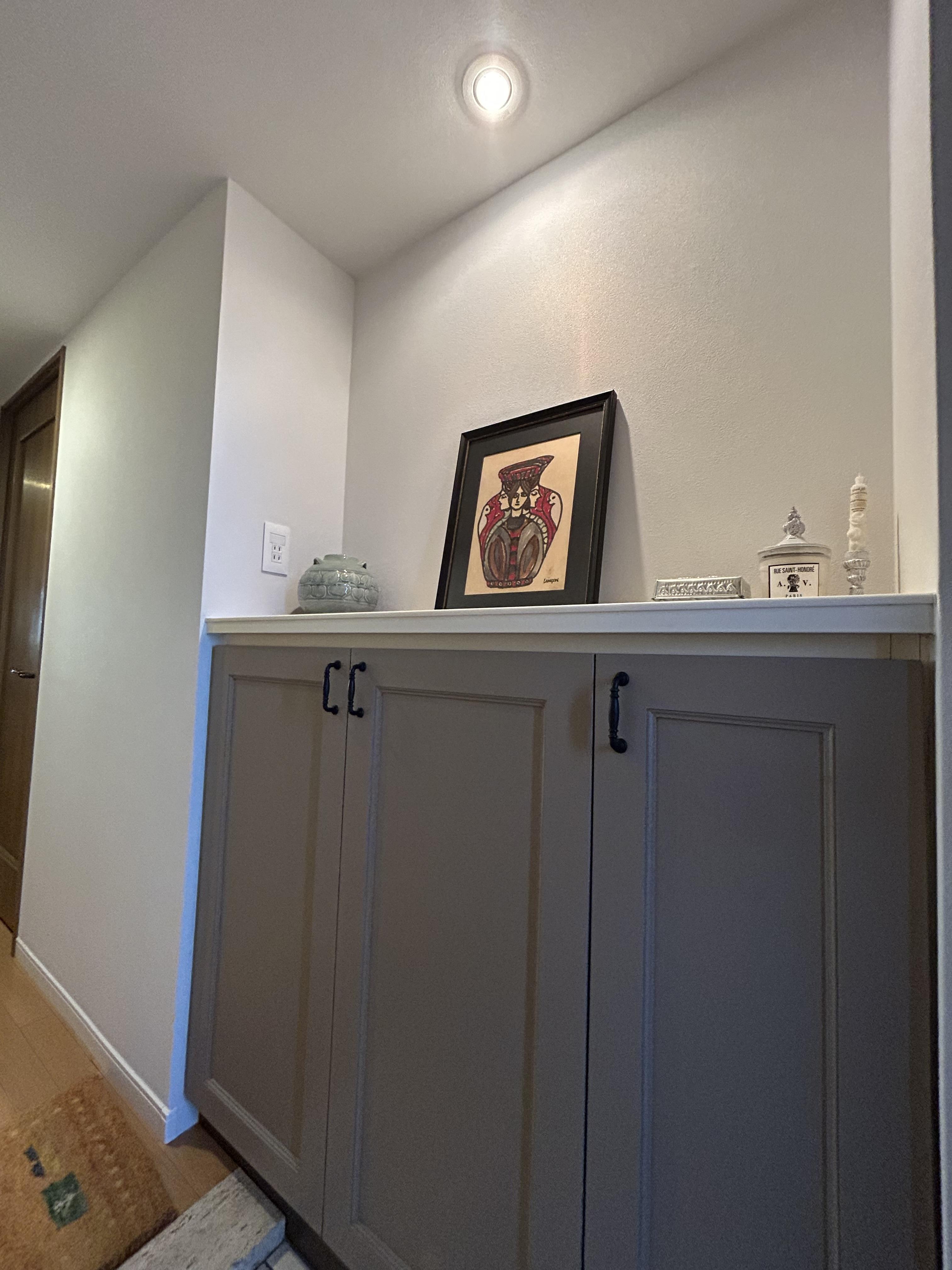 玄関収納扉も天然木材のオーダー品。玄関タイルやフローリングはそのままに、玄関から廊下にかけてクロスを張り替えました。収納扉:ウッドセッション オーダー品この他にも表札プレートの交換やサッシ廻りのシート貼り等もさせていただきました。