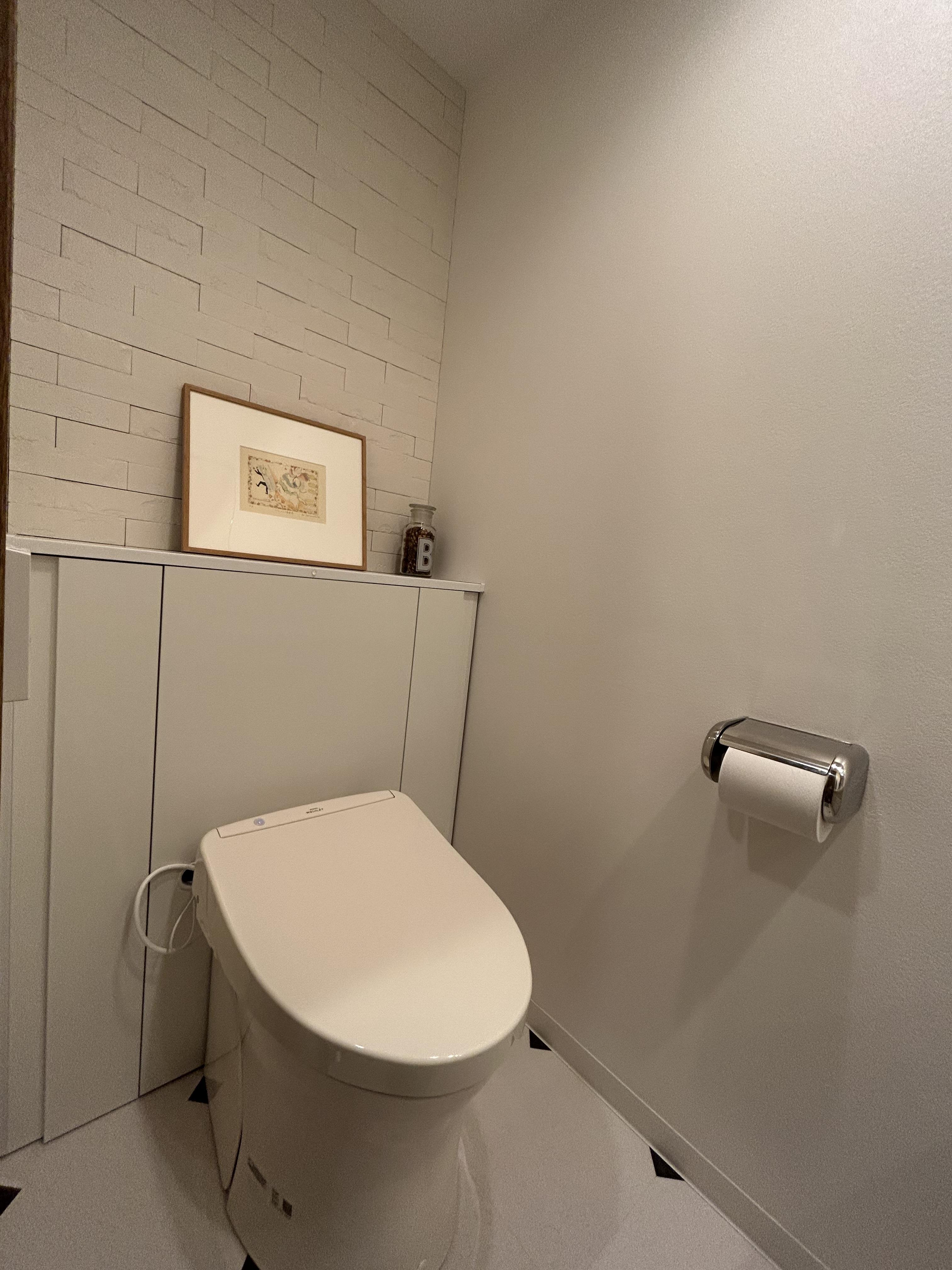 トイレは収納力とお掃除のしやすさが魅力のTOTOのレストパルを採用。床はフロアタイルを2種類用い、職人さんが1枚1枚切り貼りしてお好みの柄に仕上げました。壁には一面のみ「脱臭・調湿・有害物質抑制効果」のあるエコカラットプラスを採用。その反面には大きな鏡があり、トイレをする際に移り込んだエコカラットプラスをお楽しみいただけます。トイレ:TOTO レストパル床:【フロアタイル】MBE-149 MBE-174壁:【クロス】Sangetsu RE51586 【エコカラットプラス】グラナスハルト ECP-250/HRT1