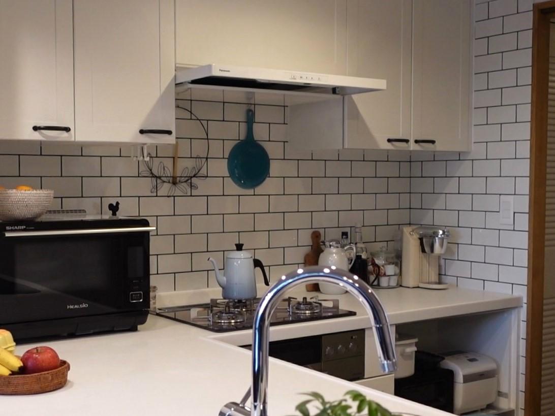 丸椅子に座りコーヒーを飲みながら、本を読んだり献立を考えたり、一日の多くを過ごす奥様お気に入りの場所。毎日欠かせないコーヒーメーカー用のコンセントも右奥に設置して使いやすく。もちろん電子レンジ用などのコンセントも各所に設置。白のタイルはDANTOのレクタン。白の光沢仕上のタイルに黒目地が映えるインテリアになっています。黒目地はアクセントにもなり、汚れも目立ちにくいのが良し!システムキッチン:Panasonic Lクラス床:【フロアタイル】田島ルーフィング MCR-745(洗面化粧室も同様)壁:【タイル】DANTO レクタン BE001 【クロス】Sangetsu RE53052(LDK、洗面化粧室、玄関・廊下も同様)スイッチ・コンセント:Panasonic アドバンスシリーズ(全てこれで統一)