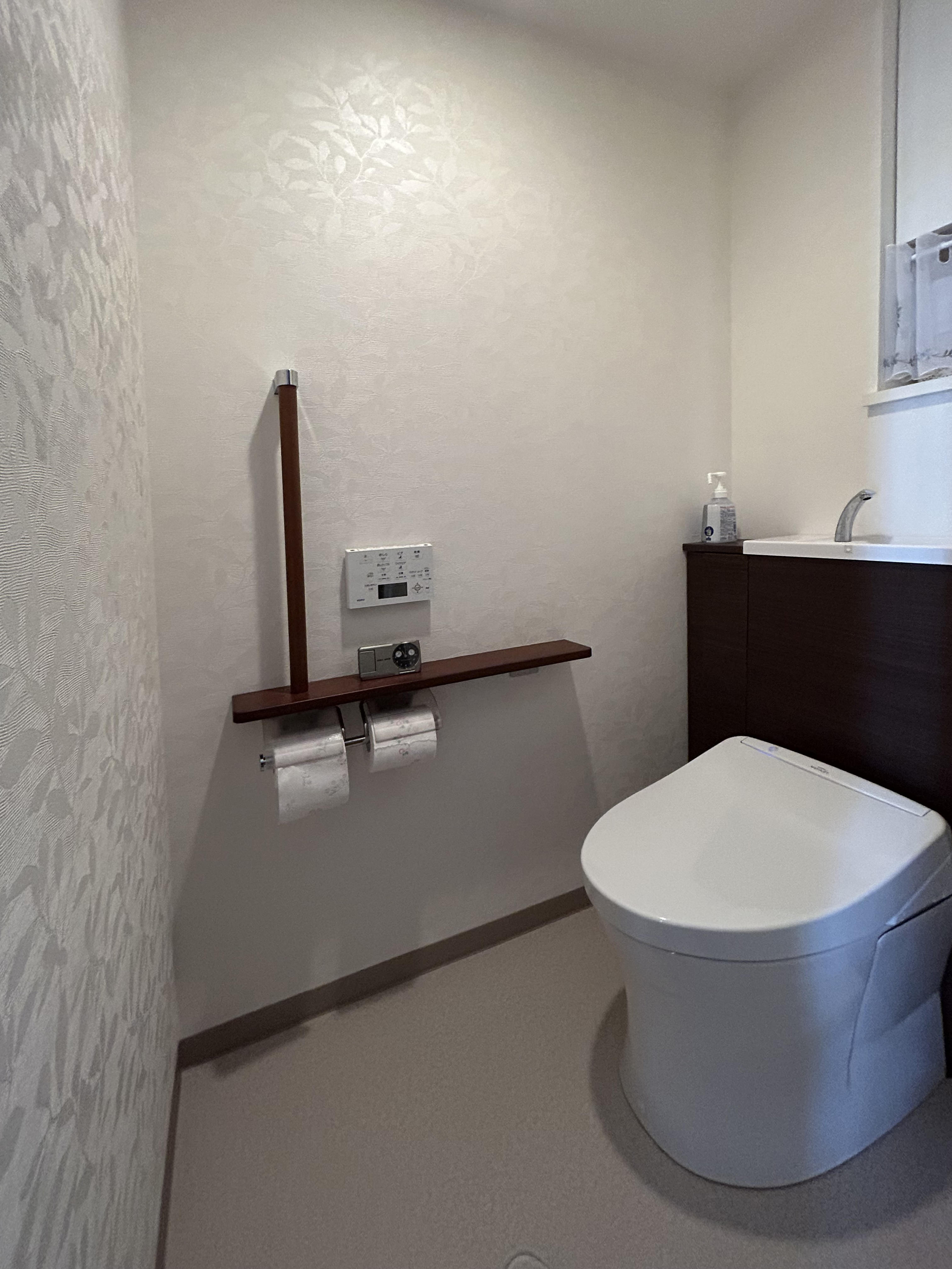 収納キャビネット付きのトイレ、TOTOレストパル。収納内は引出ラックや稼働できる棚で、容量に応じて無駄なくスッキリとお使いいただけます。またトイレ後ろにすき間がないのでお手入れ簡単、更に掃除用具類などの小物が収納でき床にモノがないため、掃除の際の煩わしさがありません。床はクッションフロアで適度な柔らかさと清掃性を備えます。壁は柄のある白を選択。見る角度によって表情を楽しめますし、光に煌めく柄がスッキリとした空間を演出してくれます。トイレ:TOTO レストパル壁・天井(クロス):RE53824・RE51736床(クッションフロア):HM10152