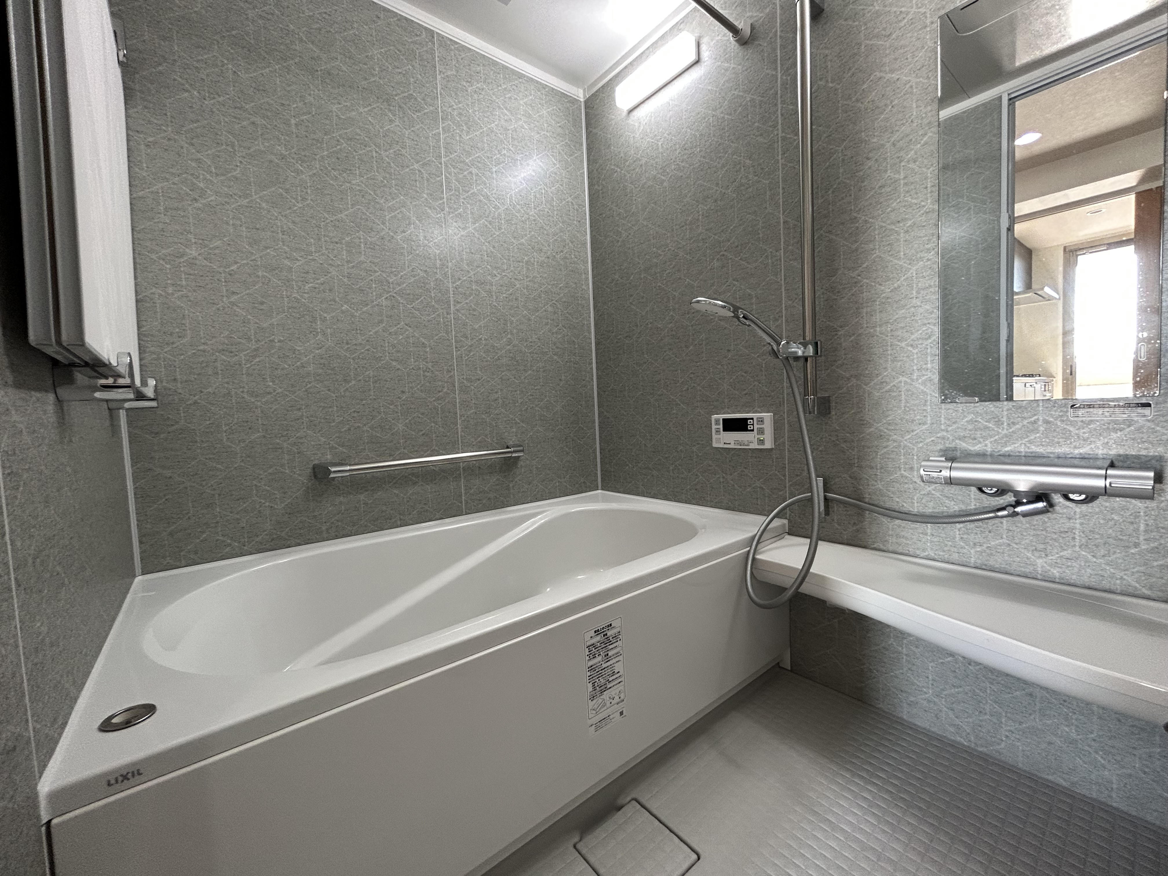 当初他のデザインに決めていましたが、カタログを再度見ていてこちらのデザインに一目惚れ。優しい風合いの幾何学模様が和の風合いを醸し出す癒し空間になりました。浴槽は大理石のような上質な光沢と華やかな煌めきをまとう人造大理石のホワイトカラー。お湯をはった時の美しさはひと際でリラックス効果もUPしそうですね。出入口のドアは無駄のないスッキリとした形状で汚れにくいキレイドアの開き戸タイプ。曲線が特徴的なカウンターは浴室内の動線や水切れの良さ、清掃性など、機能性にも配慮したデザインで取り外して丸洗いも可能です。浴室:LIXIL リノビオV 壁)グレースパターン(全面張り) 床)キレイサーモフロア・グラニックライトグレー 浴槽)エコベンチ浴槽・ルフレトーン