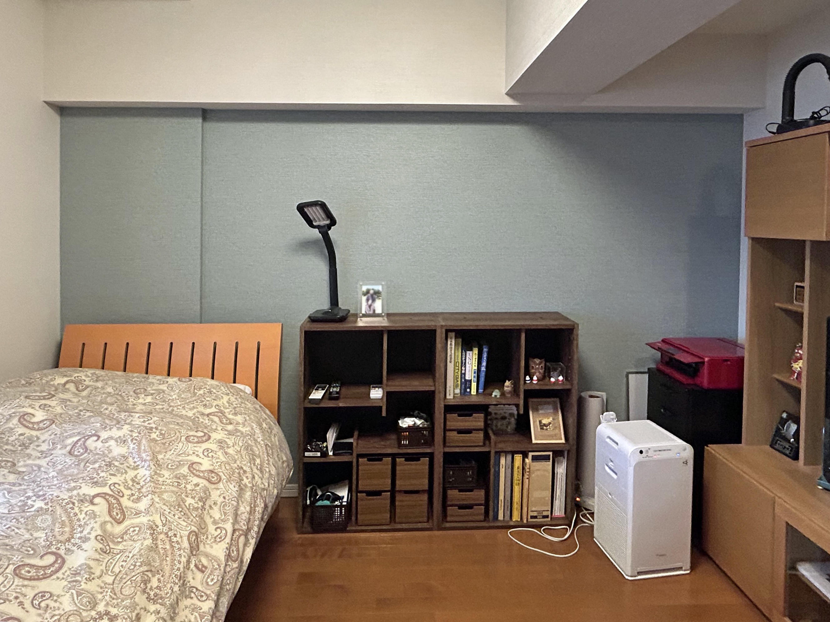 寝室としてご使用のこちらの洋室には、麻素材のヨコ糸の走る織物調の落ち着いた色合いのブルーでナチュラルながらも高級感あるテイストのアクセントクロスを用いました。アクセントクロス:RE53174他クロス:RE53171・53064