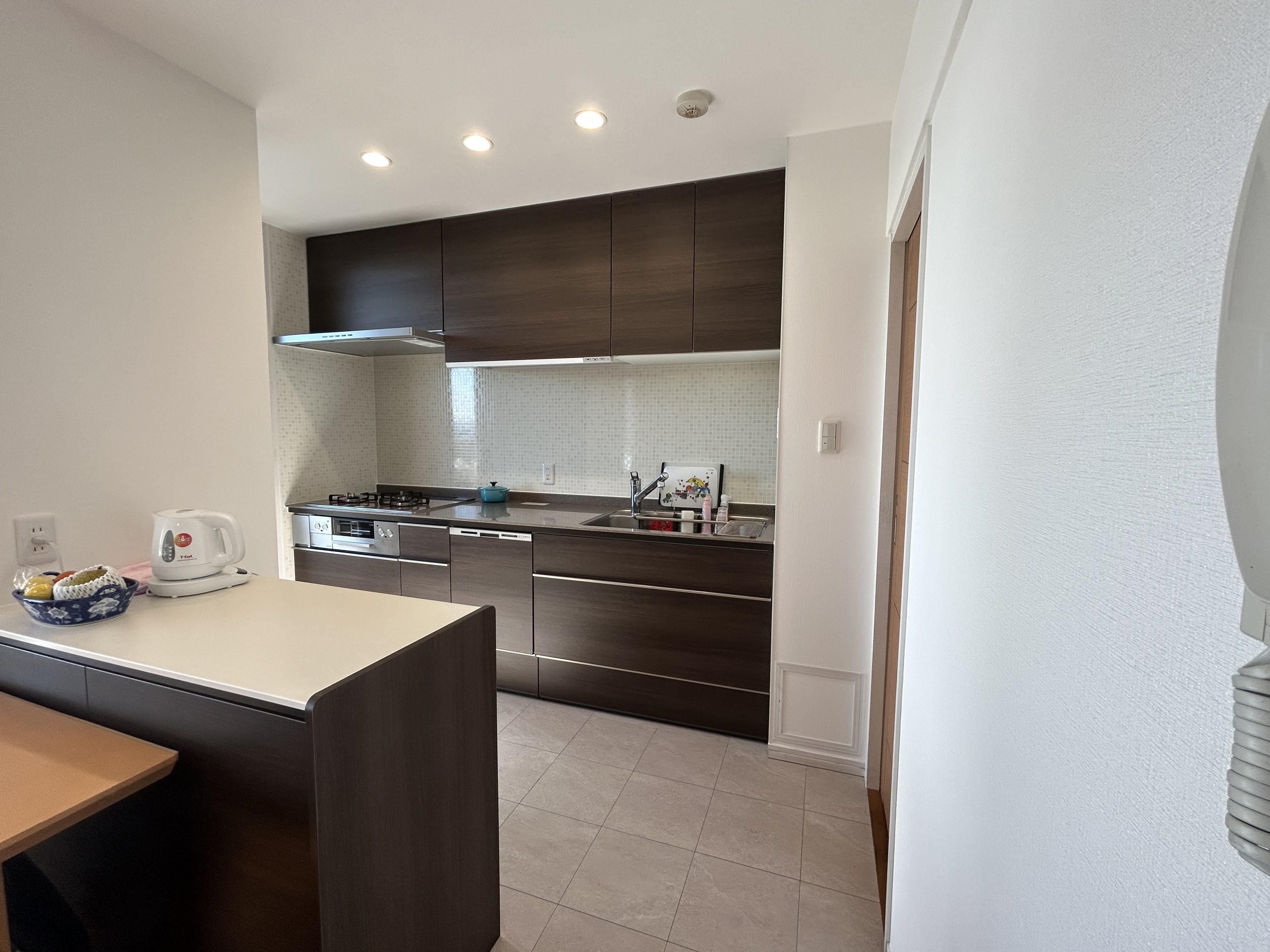 深みのある質感と鏡面仕上げの透明感が特徴的なカウンターはボウル一体型。継ぎ目がなく形成されており、汚れの溜まりにくい形状です。フルスライドタイプの収納に加えミラーキャビネットで収納力も抜群。上部にはライン照明もついており、ご使用されるときに顔元を明るくみせてくれます。下台のデザインカラーは扉を隔てて隣り合わせに位置するキッチンと合わせてショコラオークを選択。複数箇所リフォームをする際、デザインや色に迷うことがあると思います。このように他の空間と合わせると一体感がでるのでおススメです。洗面化粧台:LIXIL ルミシス 【色】扉)ショコラオーク カウンター)ラピシアブラック キャビネット本体)ブラック壁・天井(クロス):RE53690・RE53444床(クッションフロア):HM10097