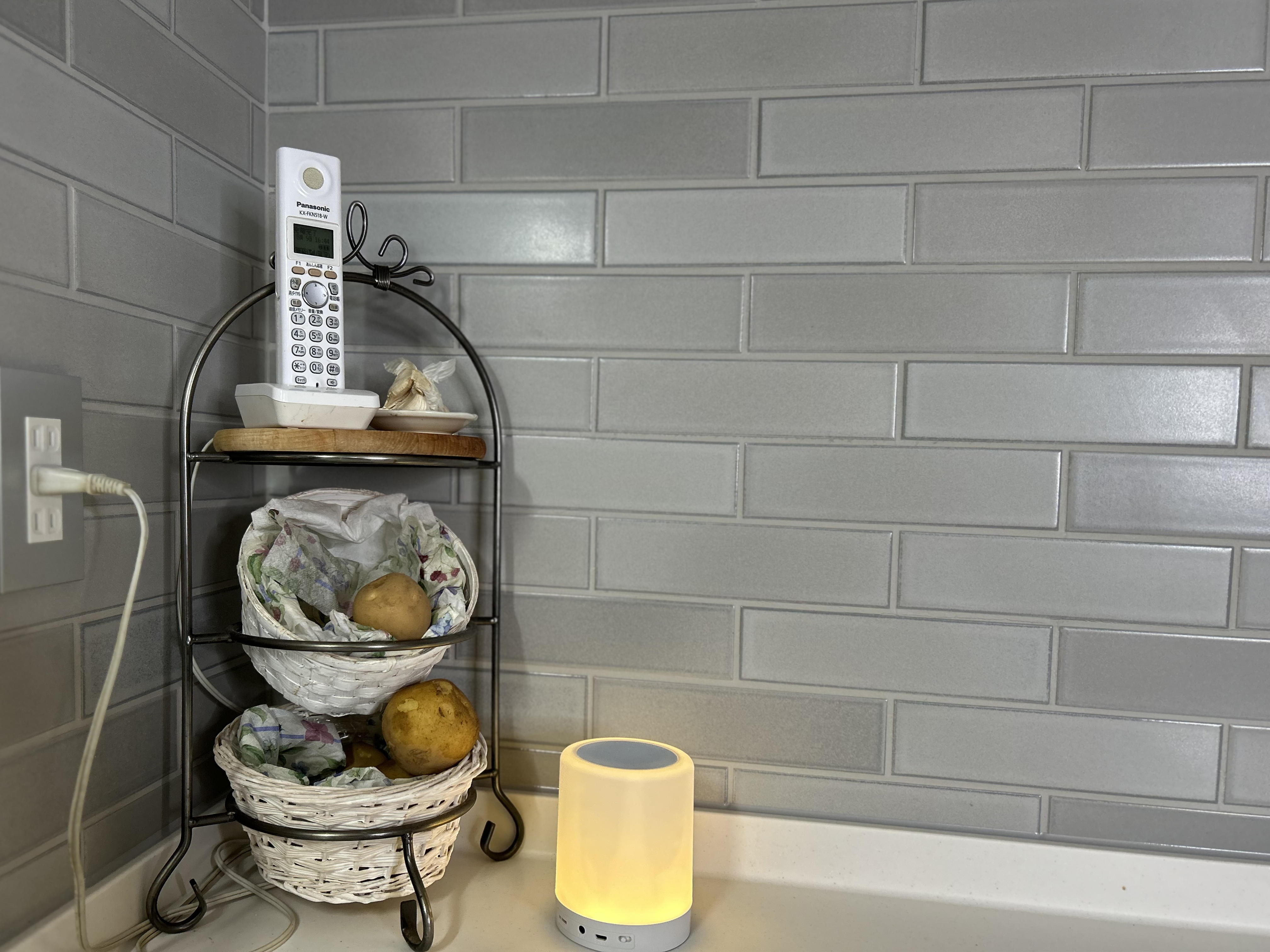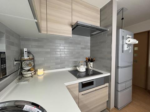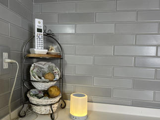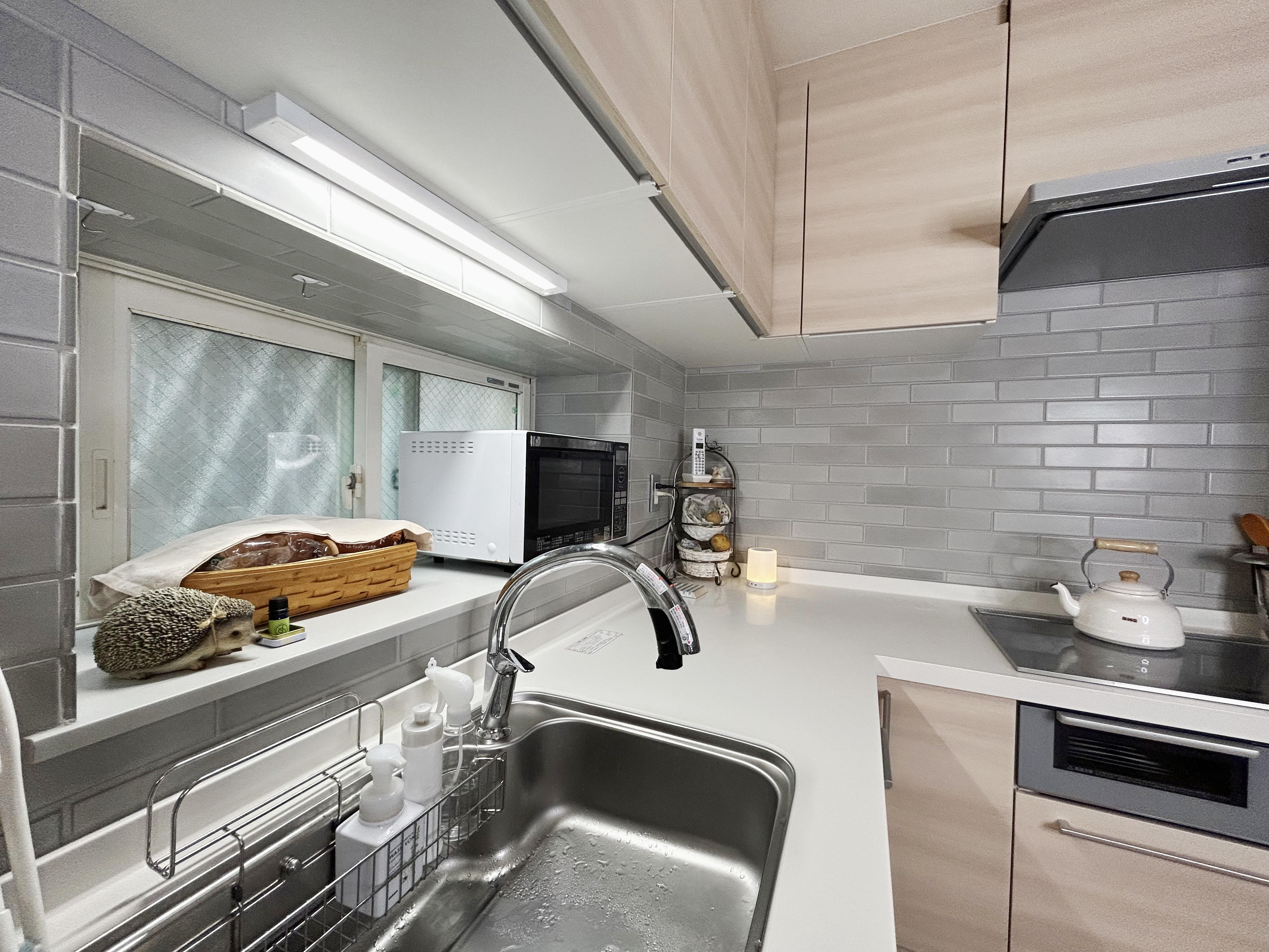 キッチンの壁は名古屋モザイクタイルのクラフトタイル“ミステール”を採用。ミステールを含め数種類のタイルのサンプルを色違いで取り寄せ、お部屋の雰囲気に合うお気に入りのタイルを厳選しました。目地は白に比べ汚れも目立ちにくく、タイルの色にも合うライトグレーを使用しています。また、写真左にみえるコンセントも新調。以前は2口コンセントにタコ足をつけてご使用でしたので、安全性・利便性を考慮し3口に変更しました。キッチンは意外と家電が多くコンセントを必要とする場所です。リフォームの際、コンセント位置・個数の検討をお忘れなく!