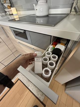 よく使用する調味料を使い勝手の良い容器に入れてコンロ横の収納へ。使いやすいよう設計されているノクトの収納ですが、そこにお客様の工夫・アイディアが追加されていて、更に使用しやすい素敵なキッチンにカスタマイズされています。