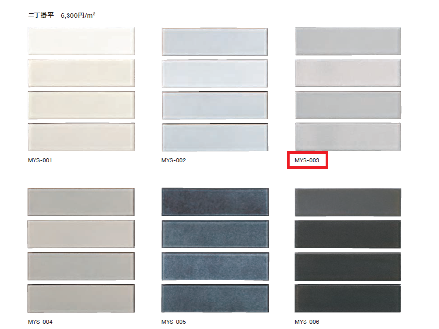 程好い艶感にこだわった上品なセミマットで、穏やかな色幅が特徴のミステール。全6種類ありますが、今回施工したのはMYS-003。ちなみにキッチン以外にも屋内や浴室の壁に使用いただけるタイルです。