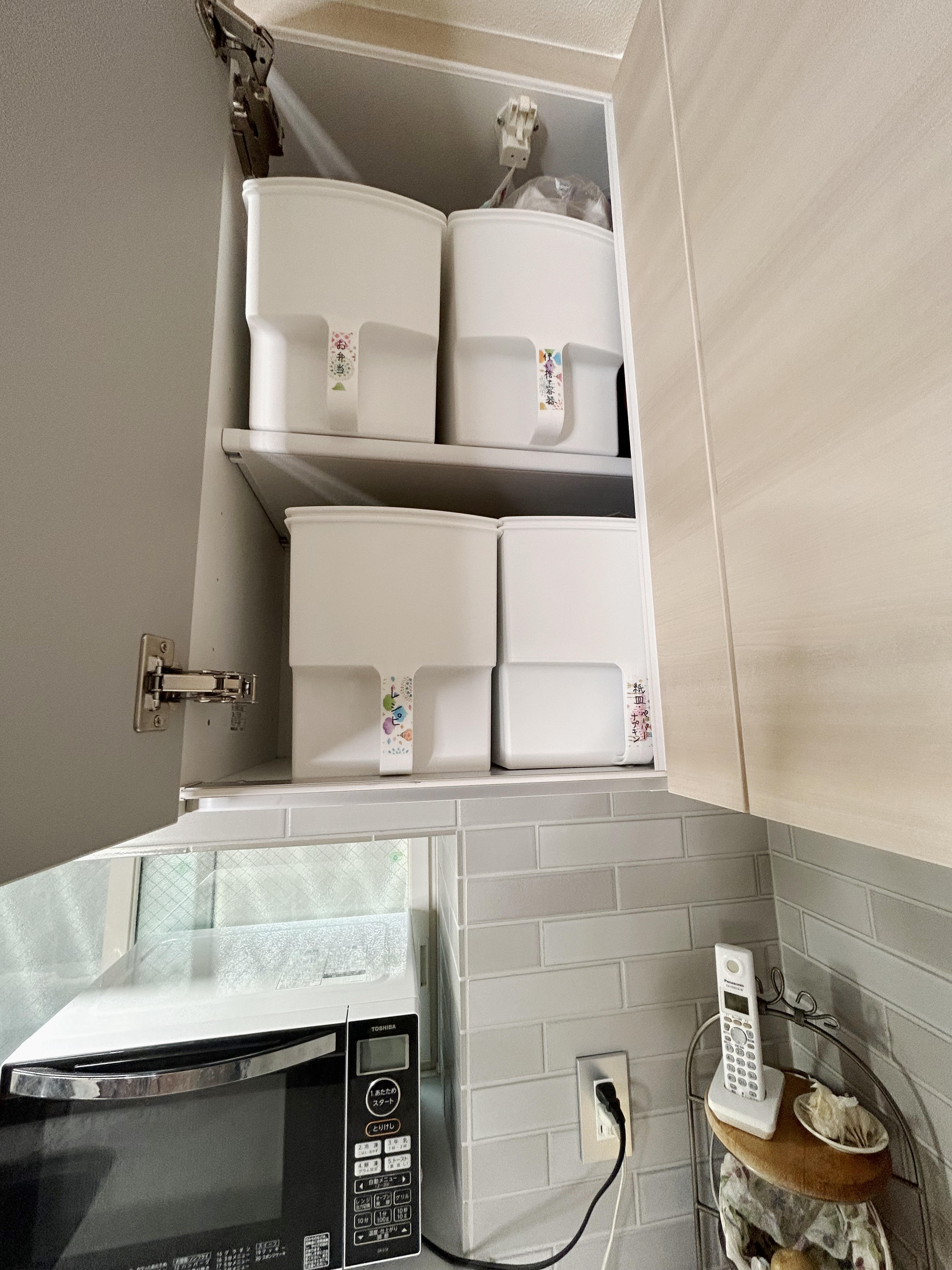 L型キッチンの収納の悩みどころであるコーナー収納。取手付きのボックスにラベリングをし、種類ごとに収納されています。片手でパッと取り出せてとても便利ですね。うちも見習いたい!吊戸棚の位置も以前より低く設置しているのでより取り出しやすくなっています。