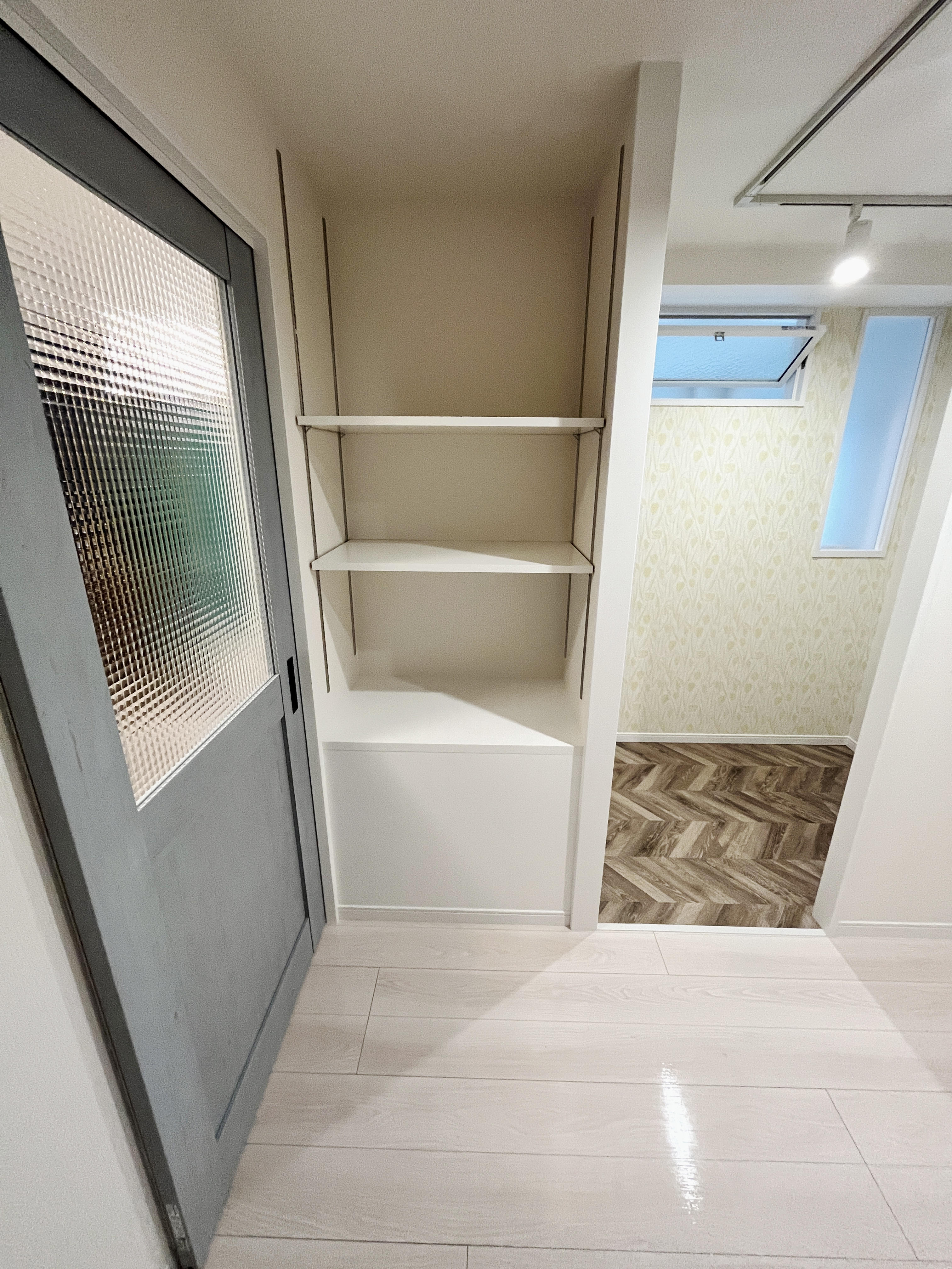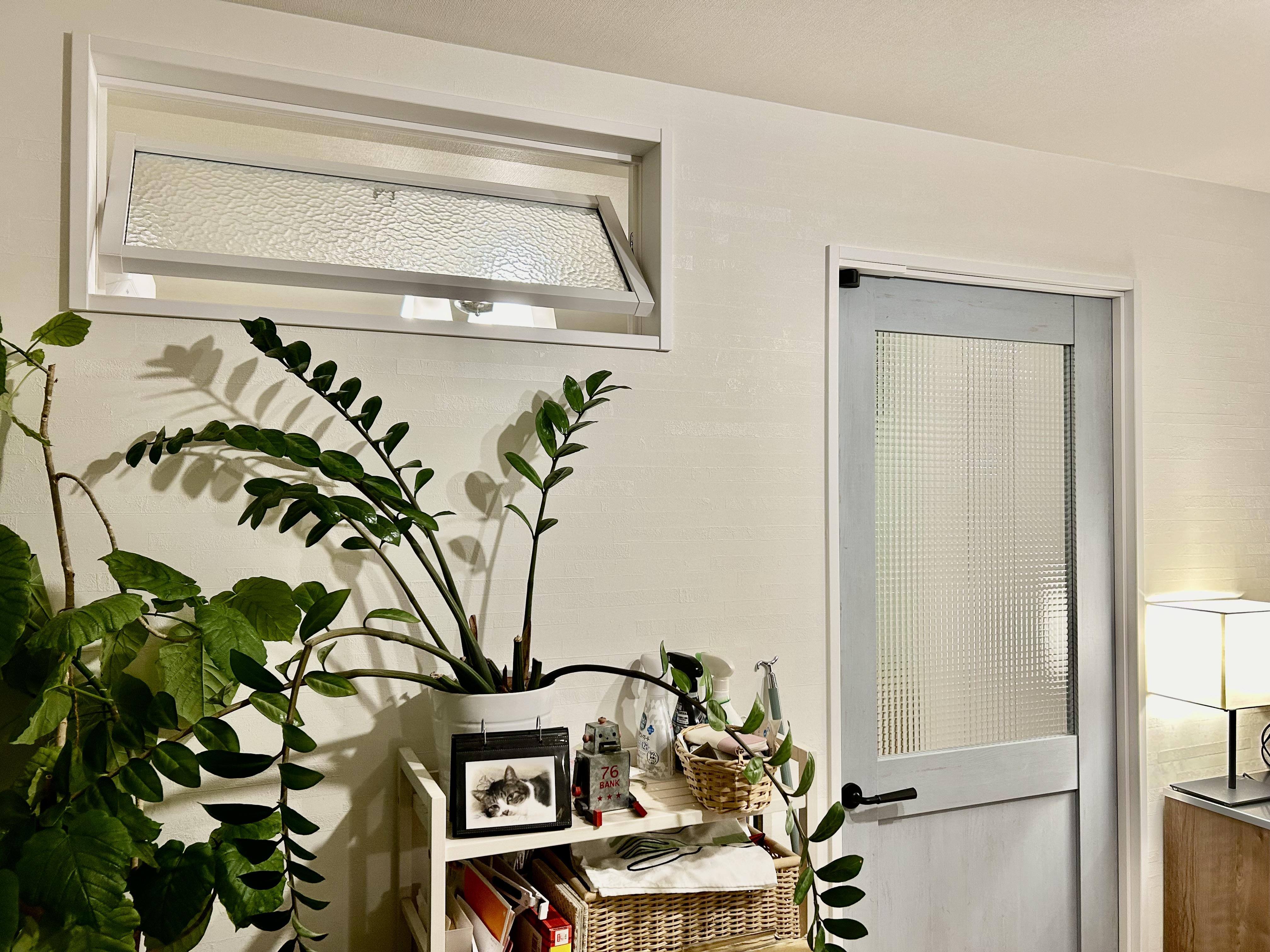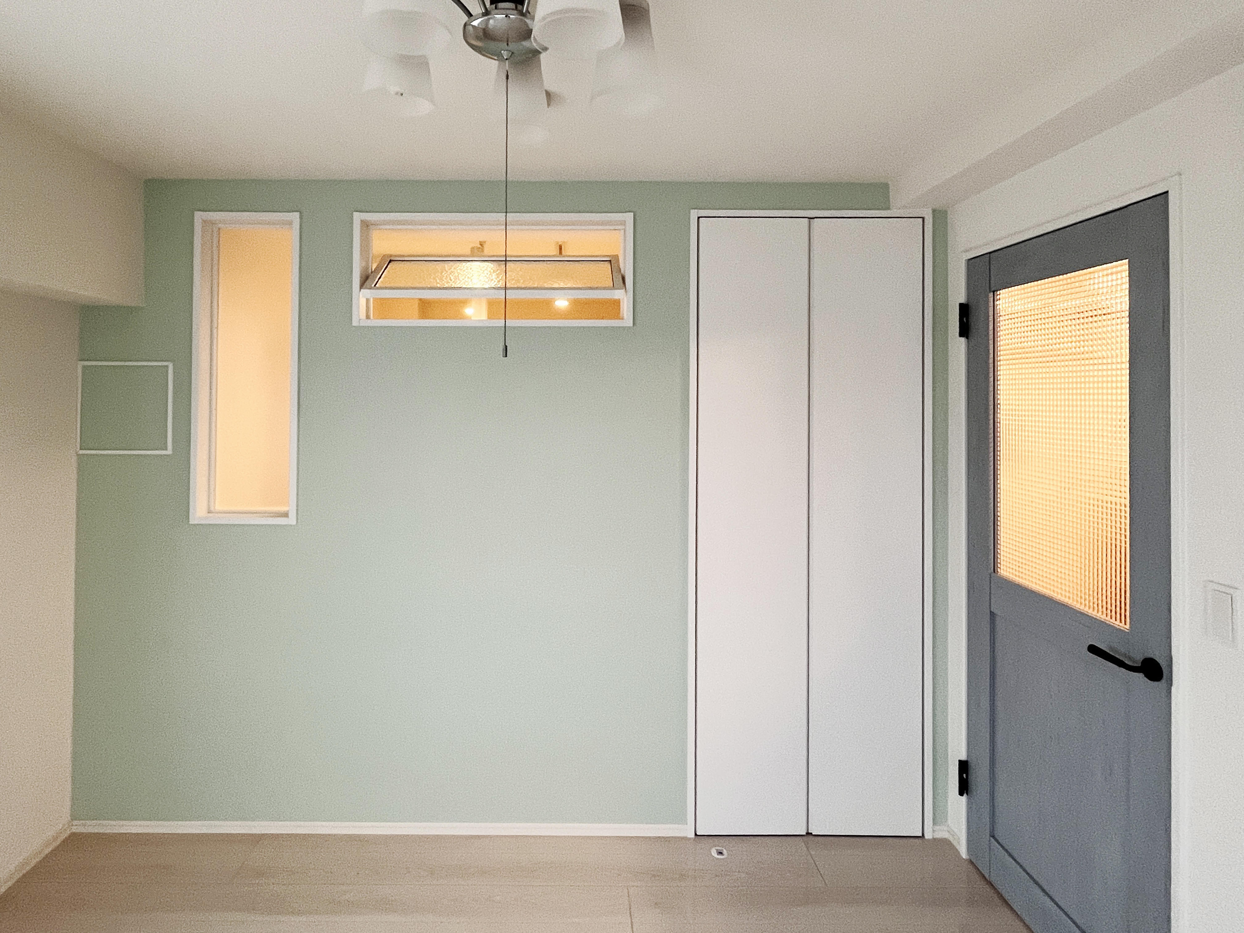 洋室2(WICとワークスペースにしたお部屋)に面した壁にあったクローゼットを取り除き、室内窓を設置。その横には新たに収納スペースを設けました(詳細は別写真参照)。1つはFIX窓、もう1つはランマ用窓で開閉が可能です。室内窓やくすみブルーのガラス付の扉からこぼれる温かみのある明かりが、柔らかなグリーンのクロスとともに、部屋を温もりある明るい空間に演出してくれます。眺望が素晴らしいこちらのお部屋。ゆくゆくはゆっくりお茶や読書を楽しみたいそう。素敵です。