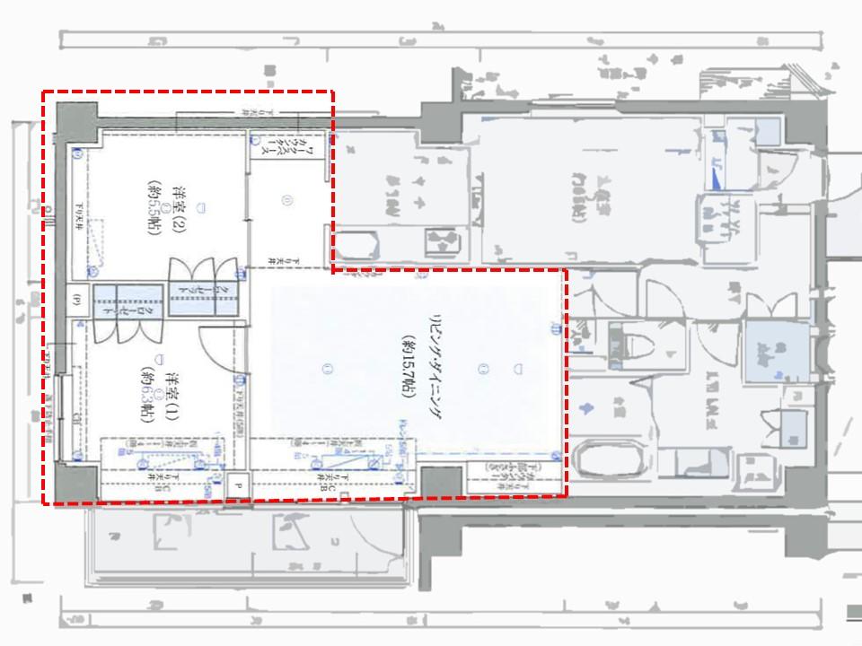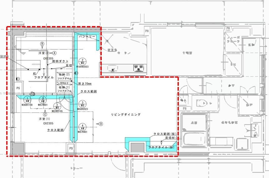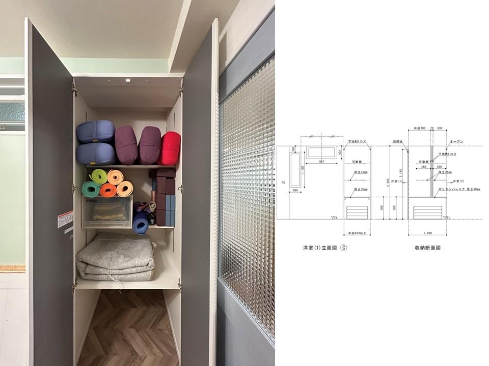 場所も大きさも新たに、クローゼットを設置。上段3段は可動棚。奥様の趣味であるヨガのマットなどが収納できる奥行を確保いたしました。下段は棚板はなく、床にフロアタイルのヘリンボーン柄を採用。上段は隣の部屋(洋室2)に収納棚を設置するための奥行を残したのに対し、下段は目一杯まで奥行をのばし、3枚折した布団が収納できるようになっています。