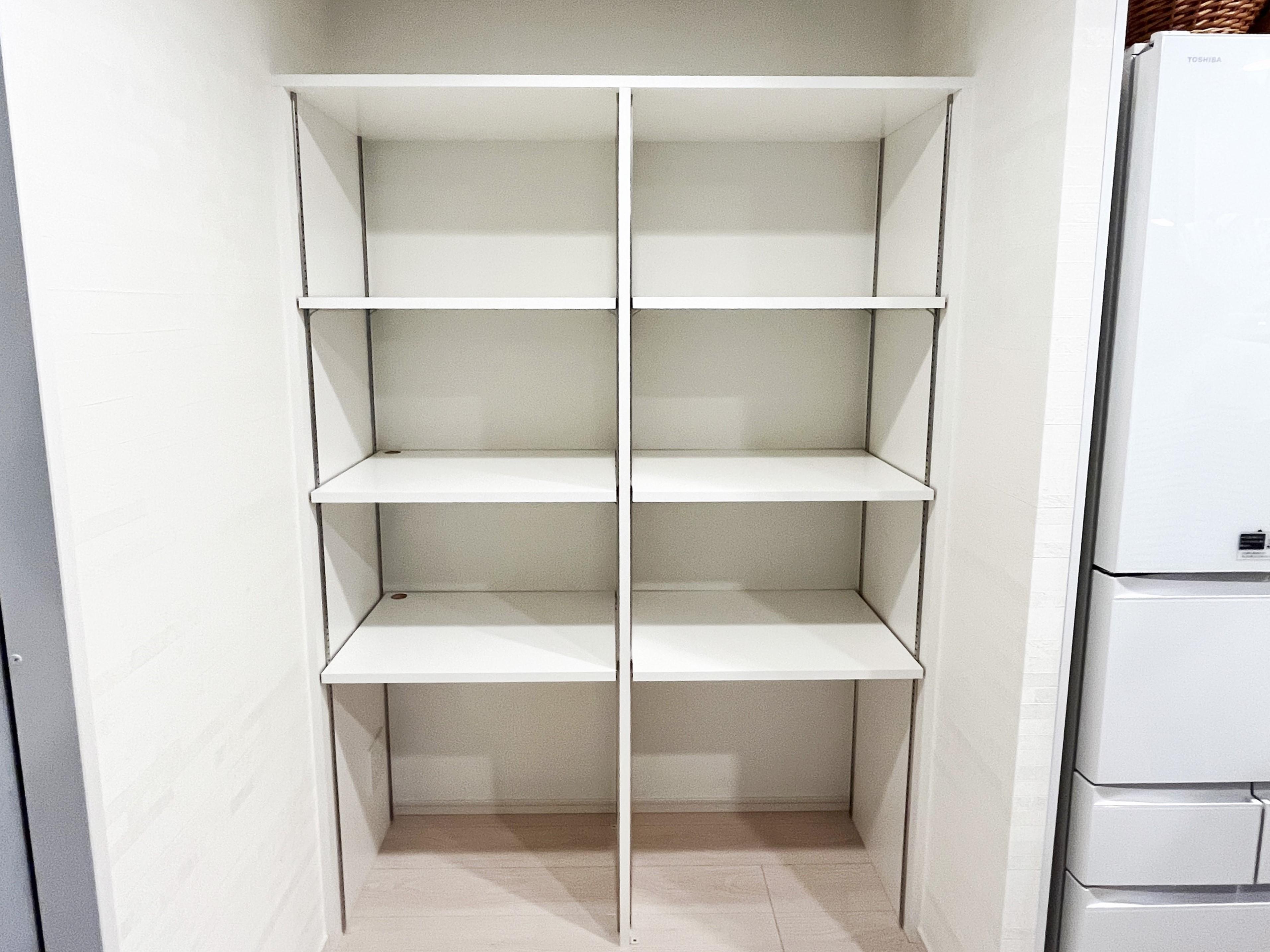 キッチンすぐ横のワークスペースだった場所に念願のパントリーも実現!コンセント側の棚板にはコンセント用の穴を開けました。動線的にも使いやすい位置ですね。