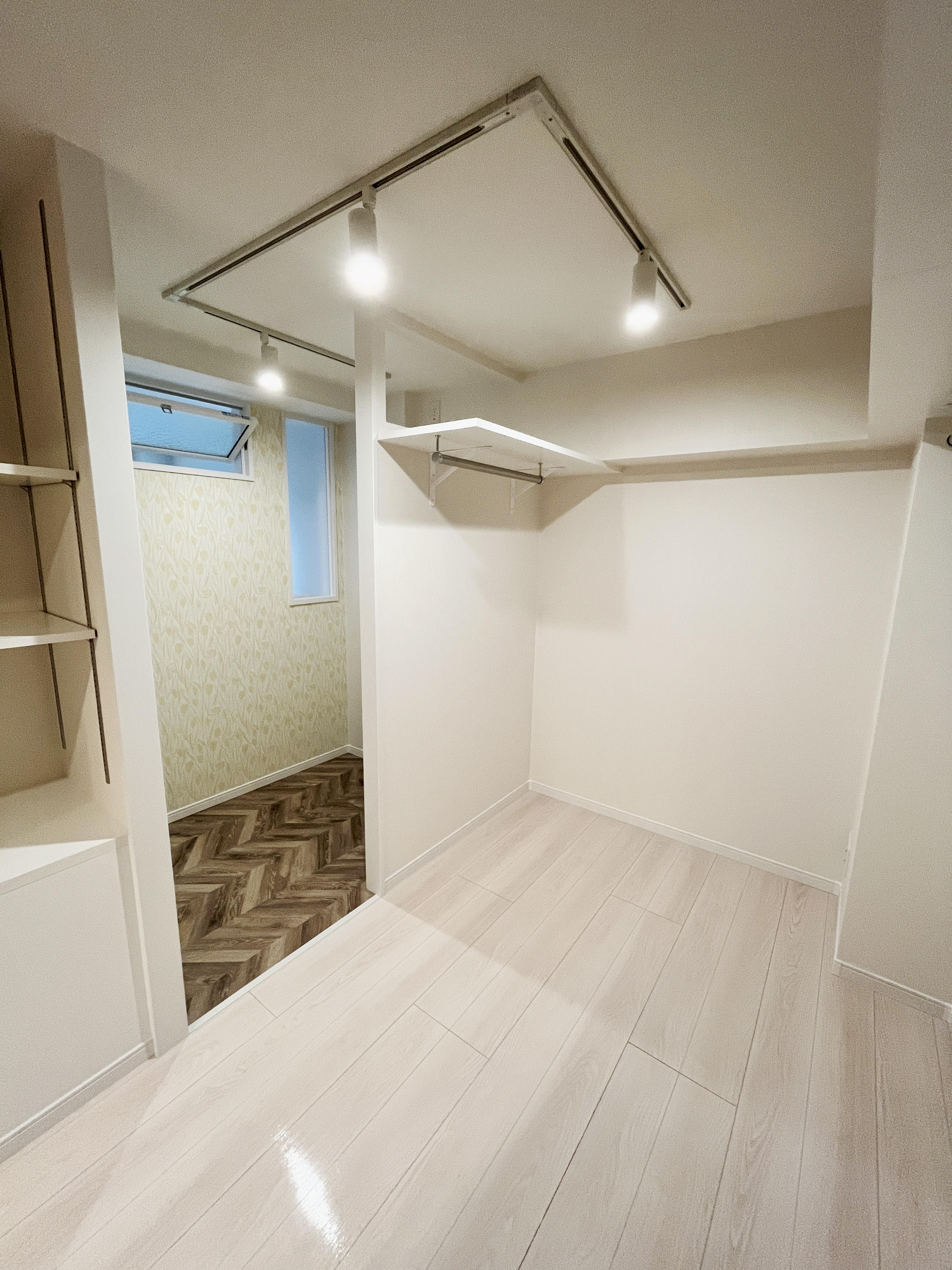 洋室1のクローゼットに面した壁に作った収納。収納するものに合わせて無駄なくスペースを活用できる可動棚です。隣りに見えるヘリンボーン柄のフロアの空間はワークスペース。壁のクロスもほんのり黄色でWICスペースのクロスとは違う色・柄を採用。違う材質や色、柄にすることで別の空間だという区切りにもなり、デザイン的なアクセントとしても素敵なコーディネートになっています。