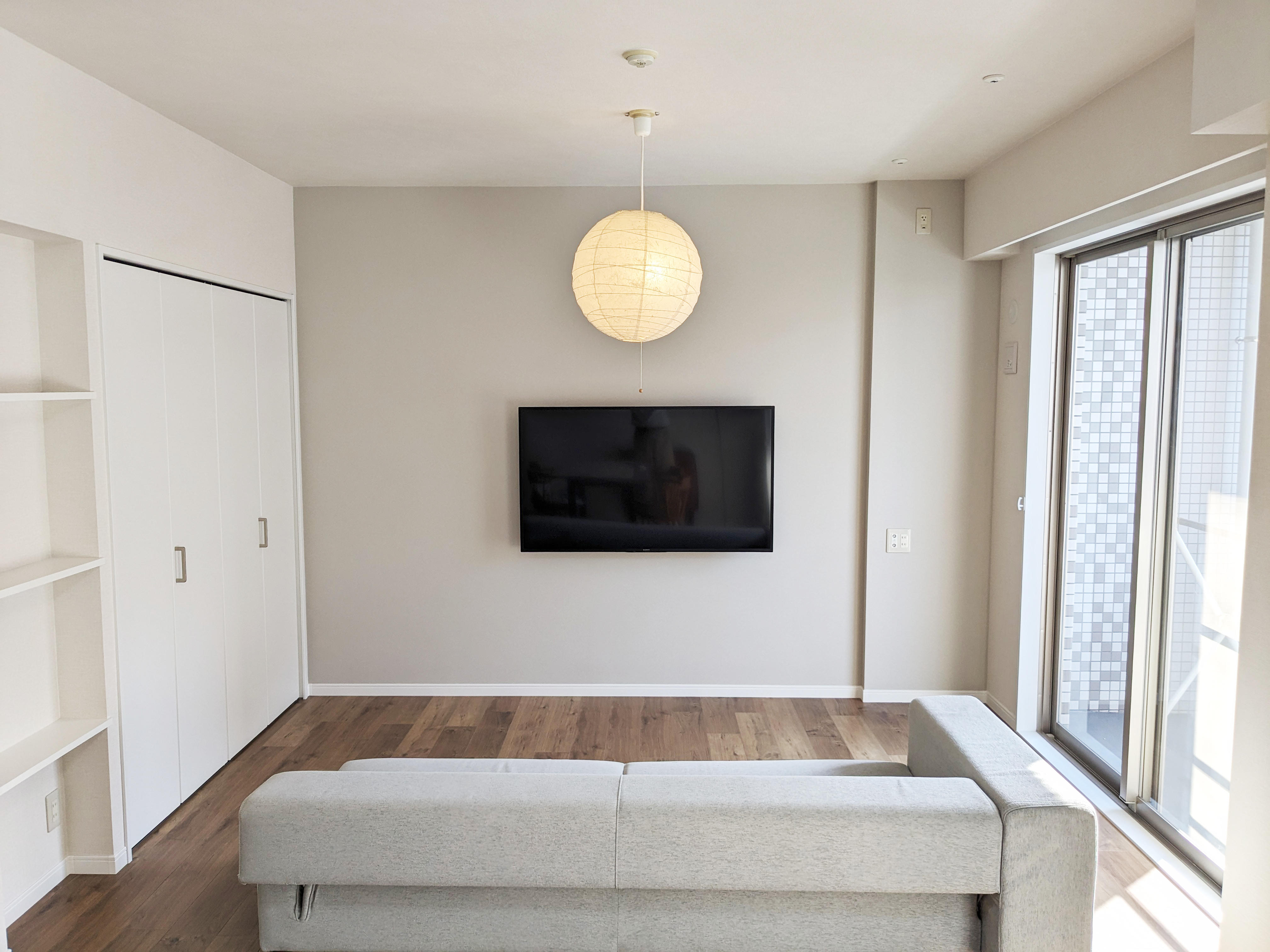 LD側に合わせてカーテンボックスを造り付けました。壁掛テレビをご希望で、壁には下地や金物を取り付け、TV端子やコンセントも上部に設置したので、配線も隠れスッキリです。