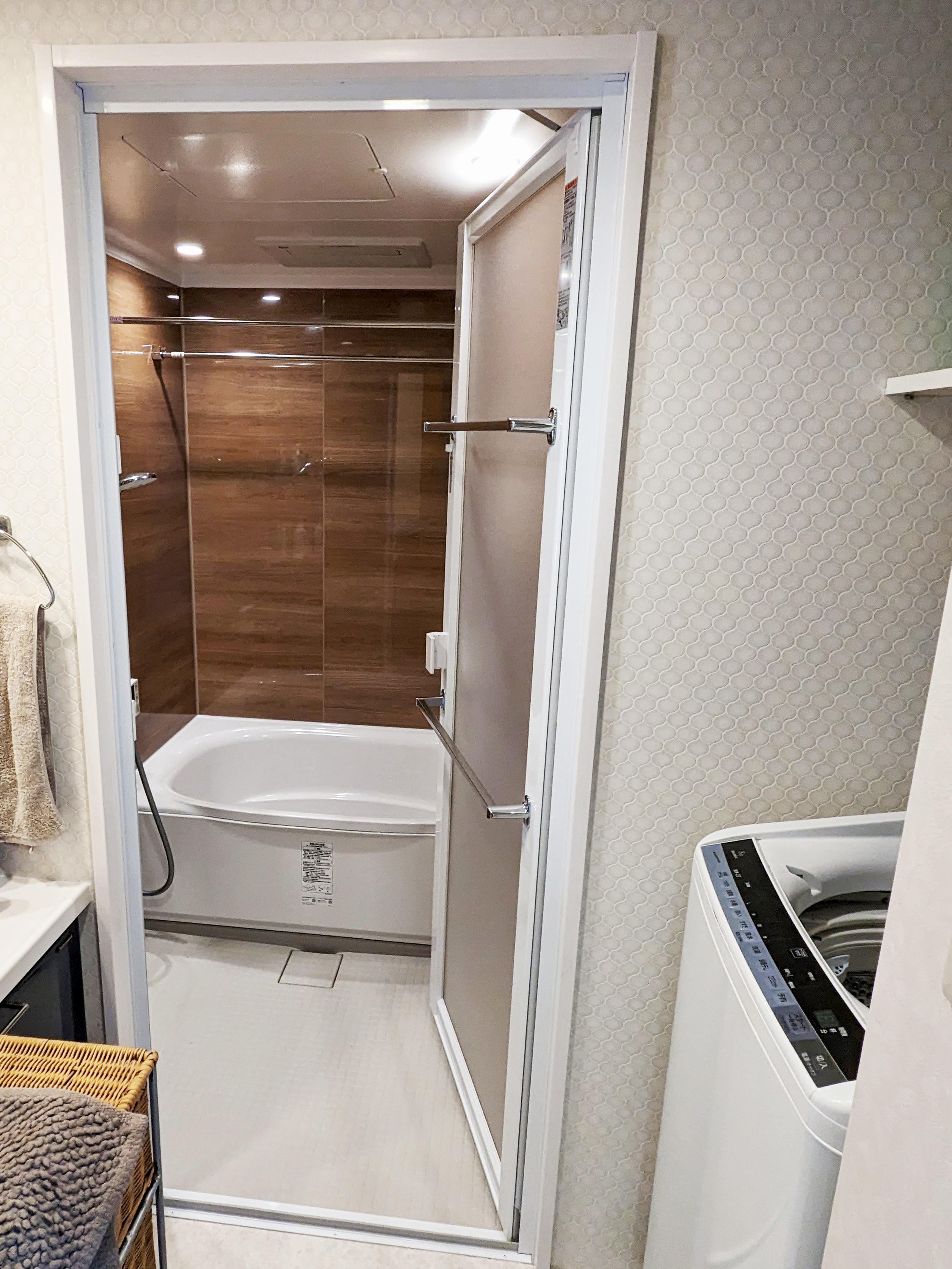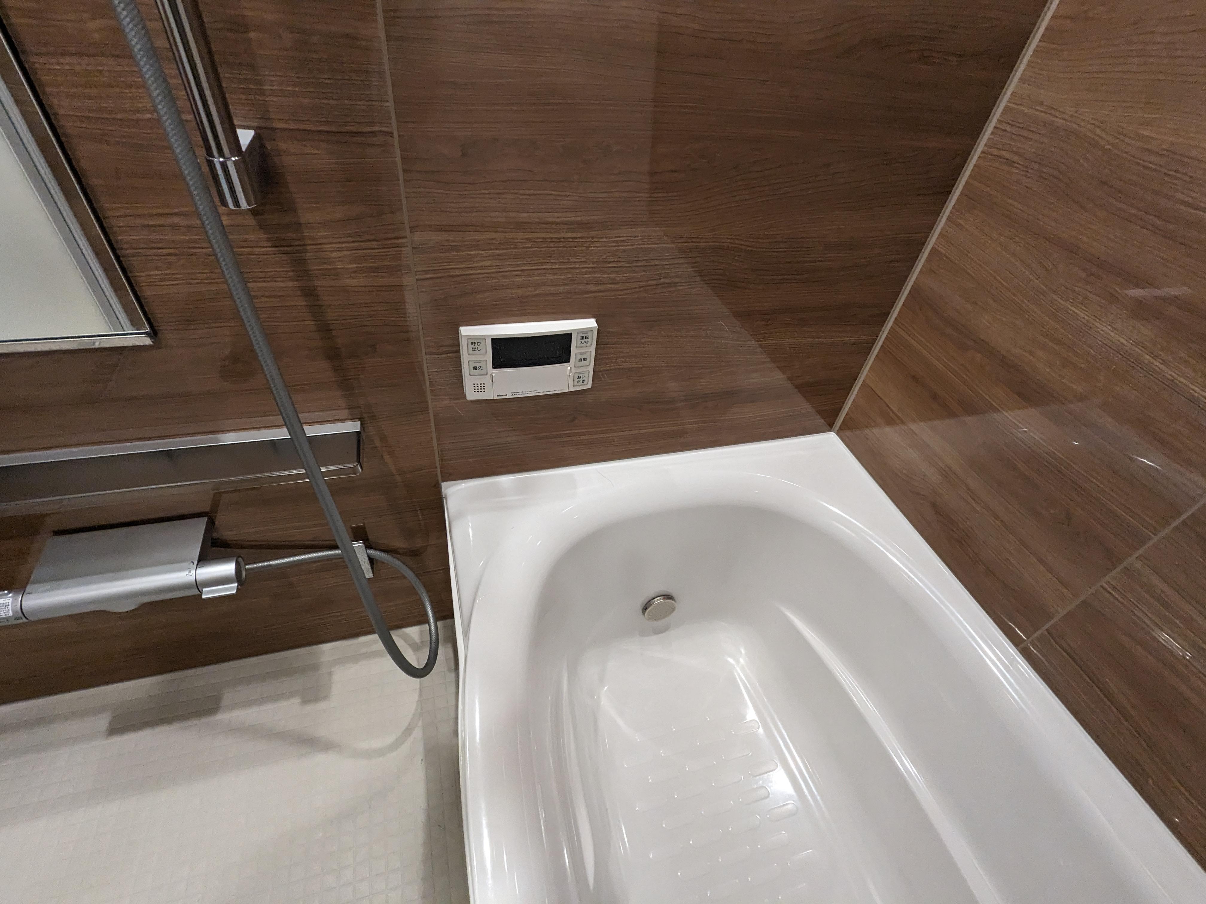 浴室もリフォームさせていただきました。木目の壁で落ち着いた印象です。取り付けたノーリツの温水式浴室乾燥機は、24時間換気機能を標準搭載し、浴室乾燥・衣類乾燥・暖房・涼風・換気機能を搭載しております。ユニットバス:LIXIL リノビオ浴室乾燥機:ノーリツ BDV-3307AUKNSC-J3-BL