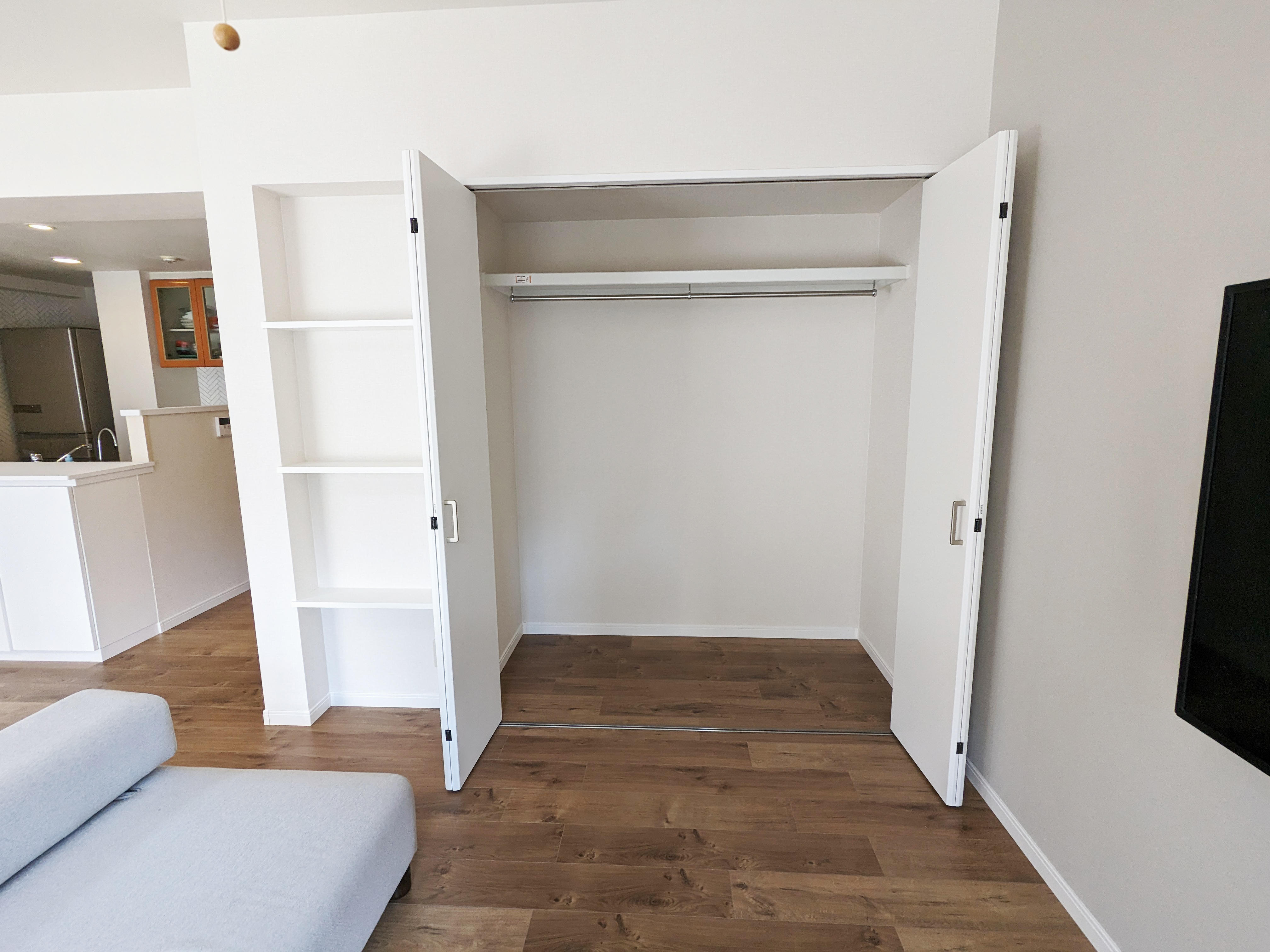 押入を枕棚やハンガーパイプを取り付けてクローゼットに造り替えました。収納折戸はLIXILラシッサSです。クローゼット横には元々の間取りを活かし、飾り棚も取り付けました。