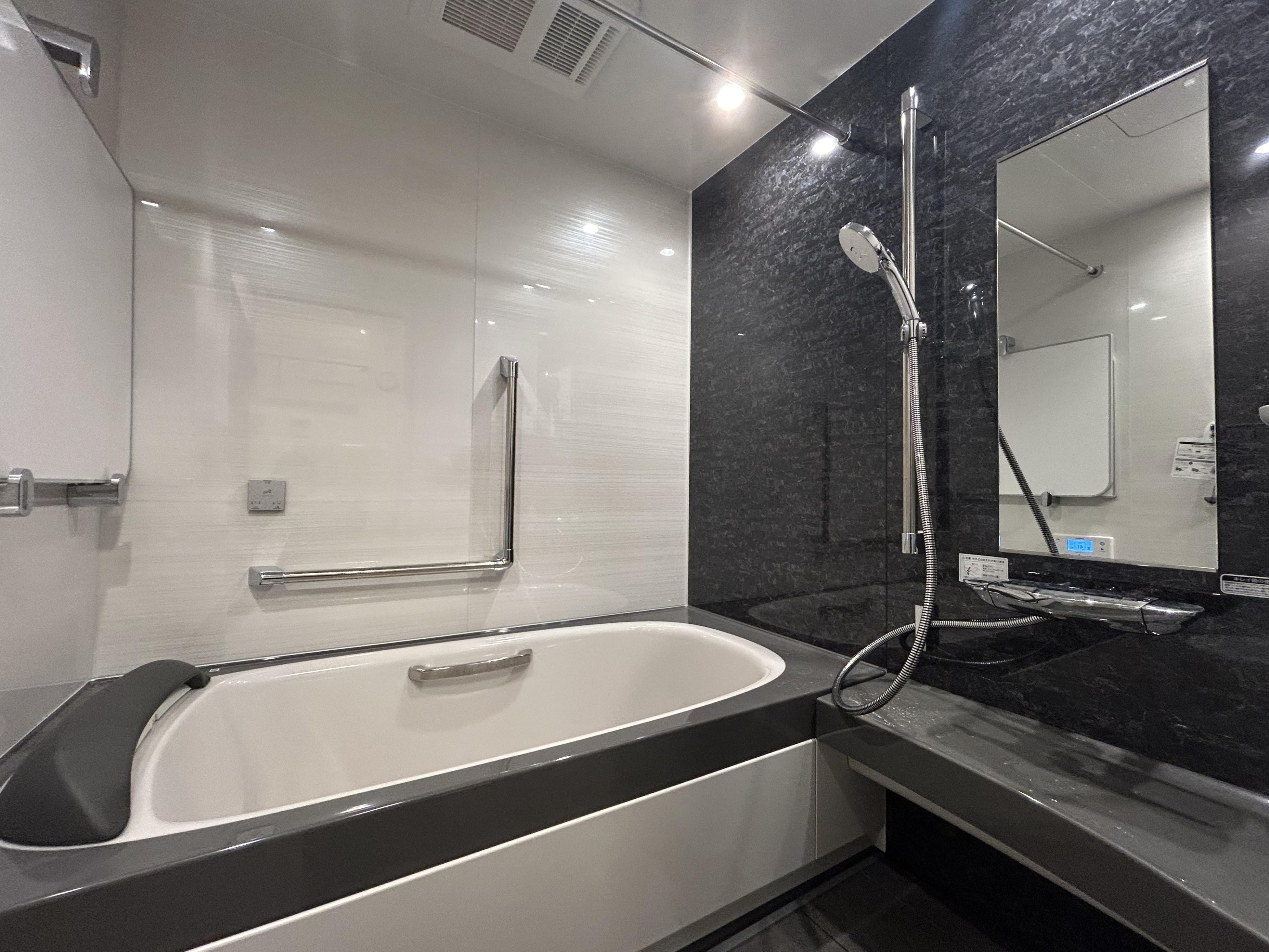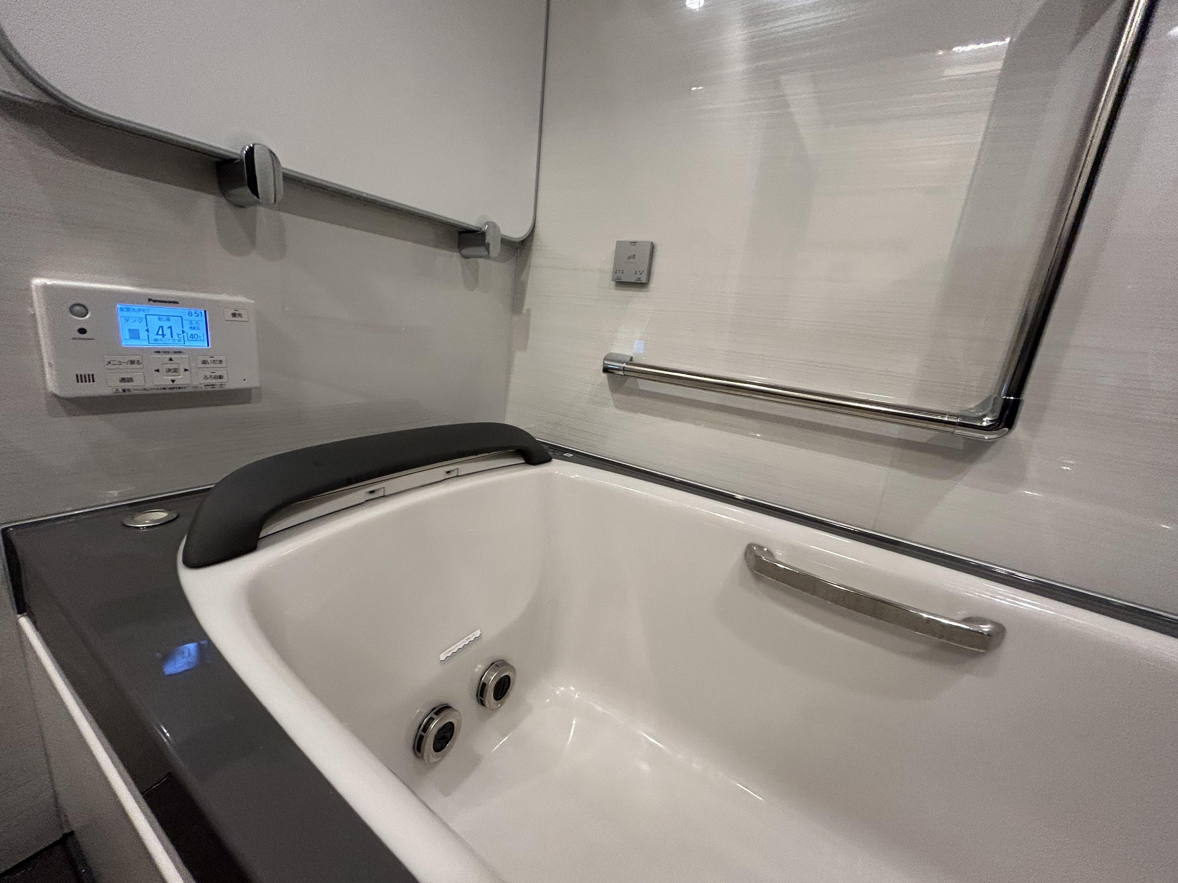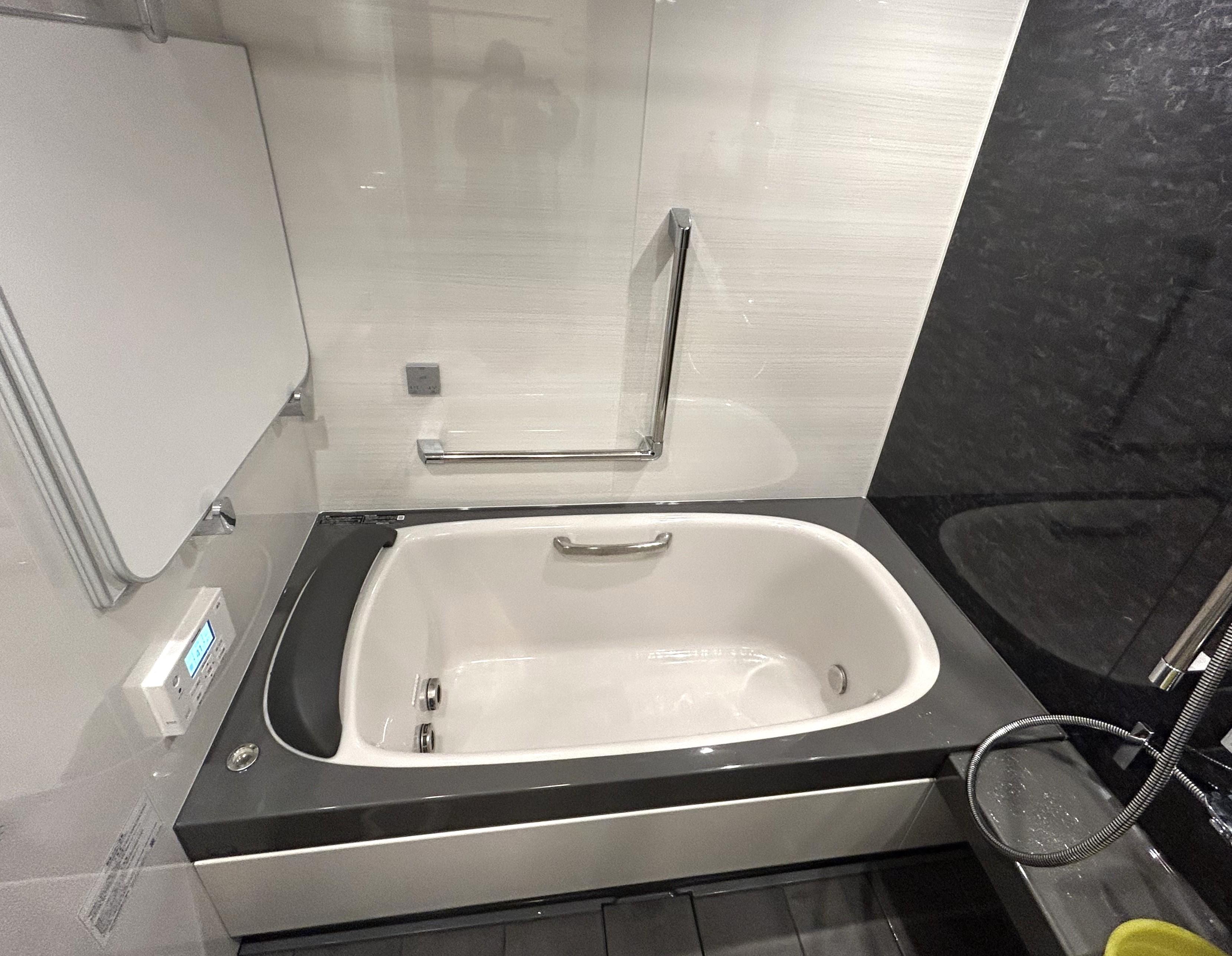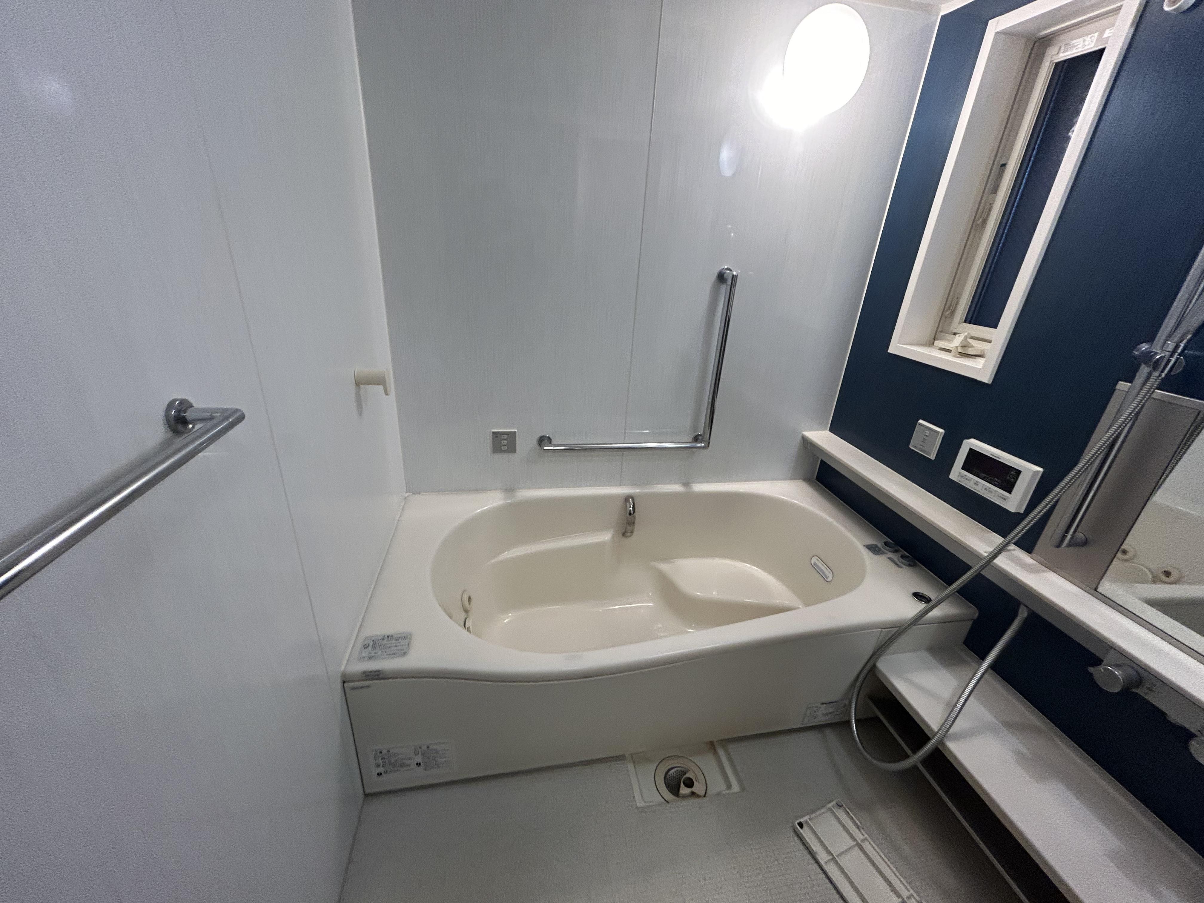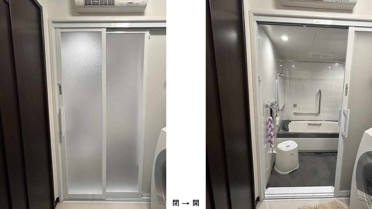 浴室の出入口のドアは2枚引き戸。間口も広く、出入りしやすいです。浴室リフォームをすると出入口が新しなり、多くの場合リフォーム前とサイズも異なるので、壁のクロスが一部なくなってしまう箇所が出てきます。今回のリフォームでは折角ならとクロスも貼り換えさせていただきました。