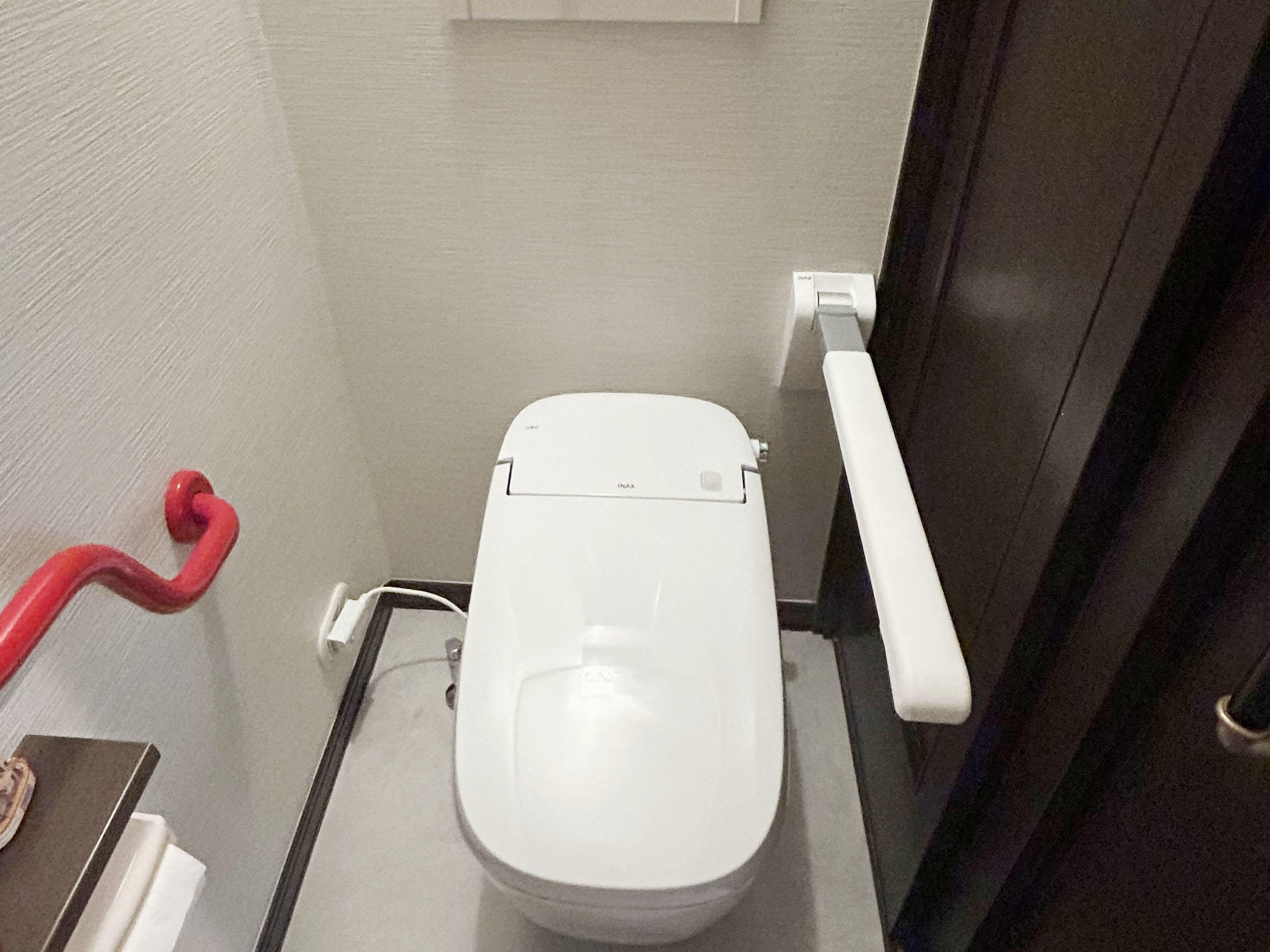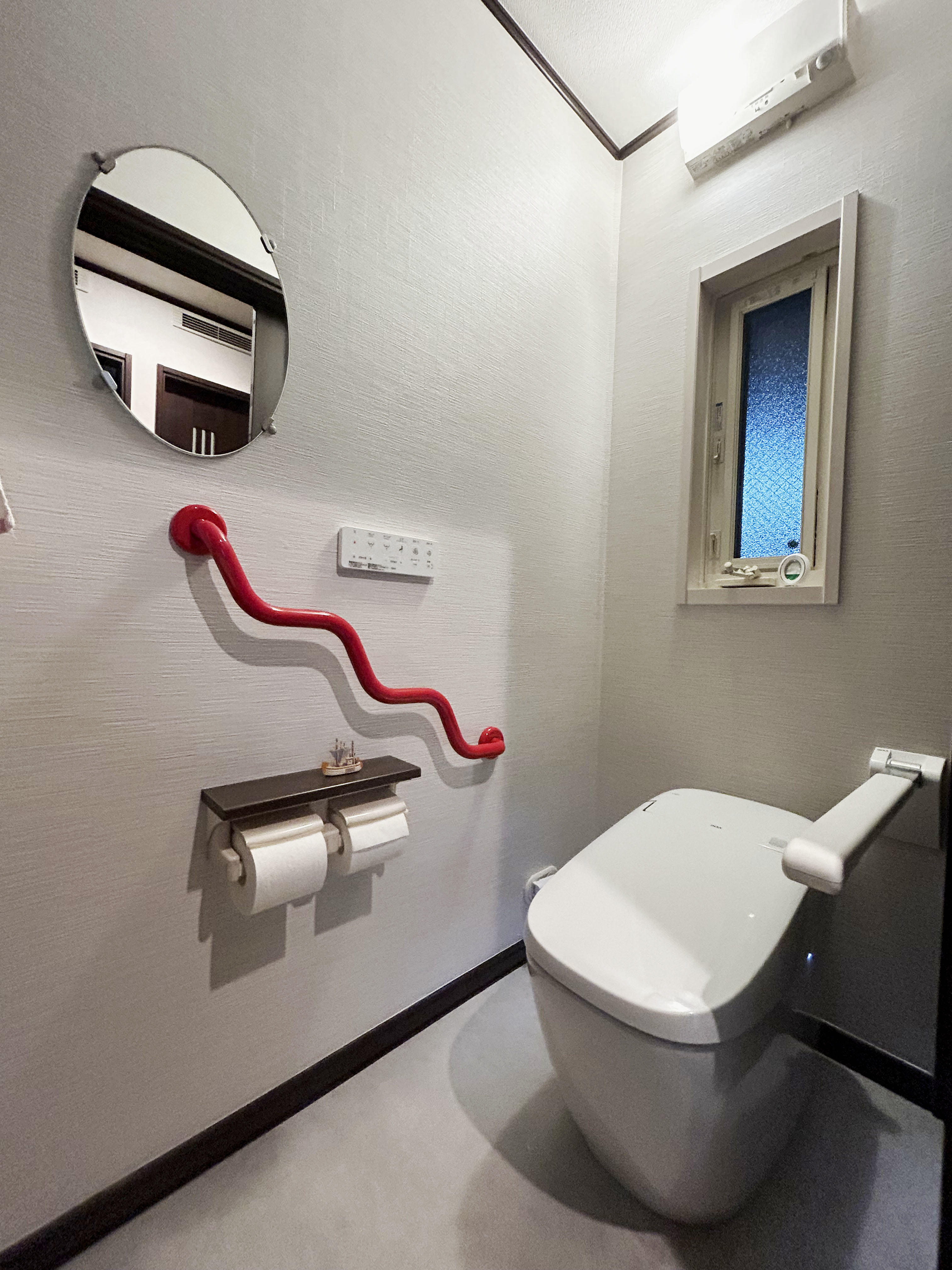座りごこちでLIXILのサティスGをお選びになりました。クロスやクッションフロアは新しく、機能性・デザイン性を兼ね備えた赤い手すりや鏡は既存の物を再利用いたしました。