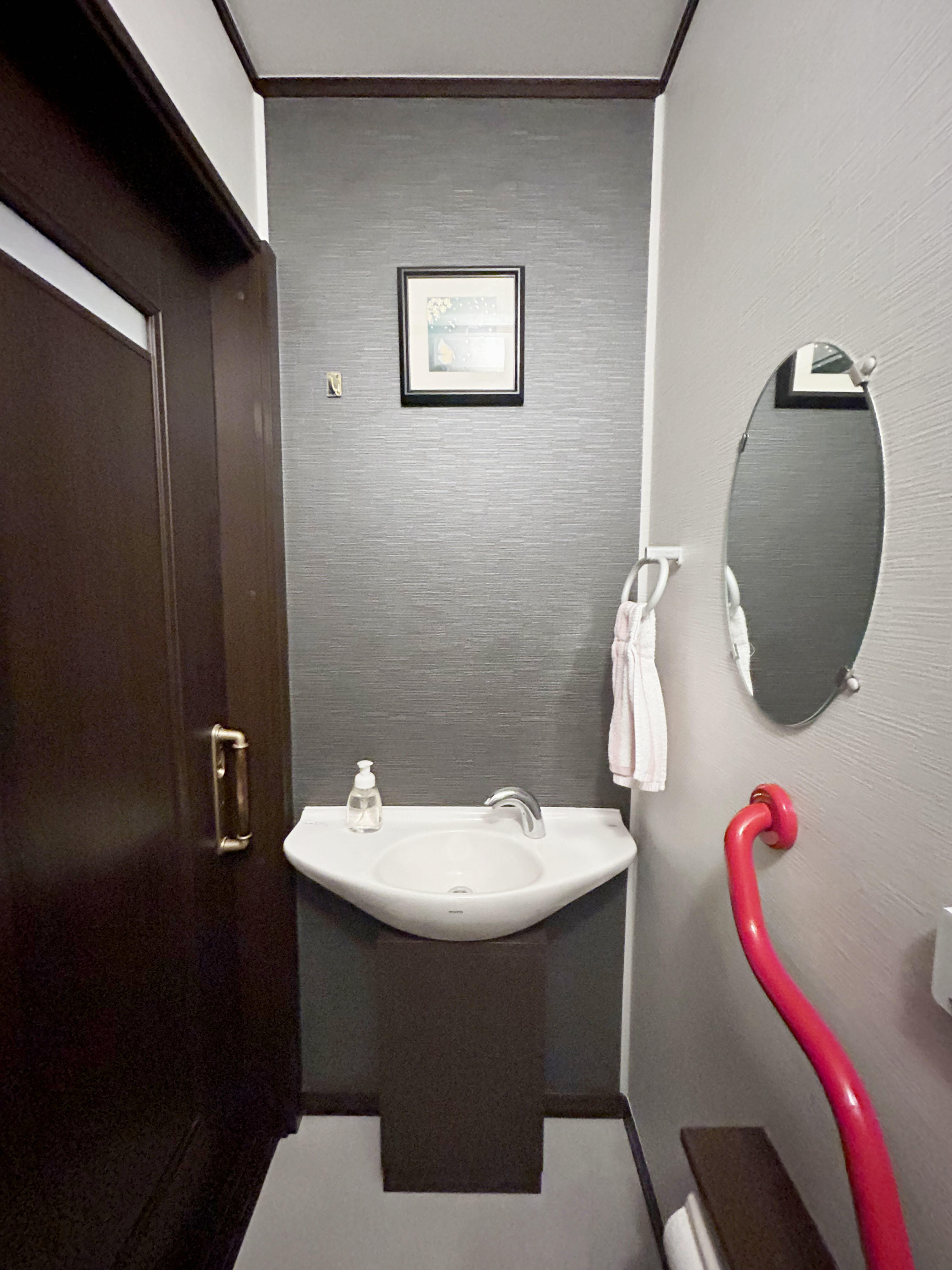 他の面と同じデザインで色違いのクロスをアクセントクロスとして用いました。トイレ手洗は既存の物を再利用です。