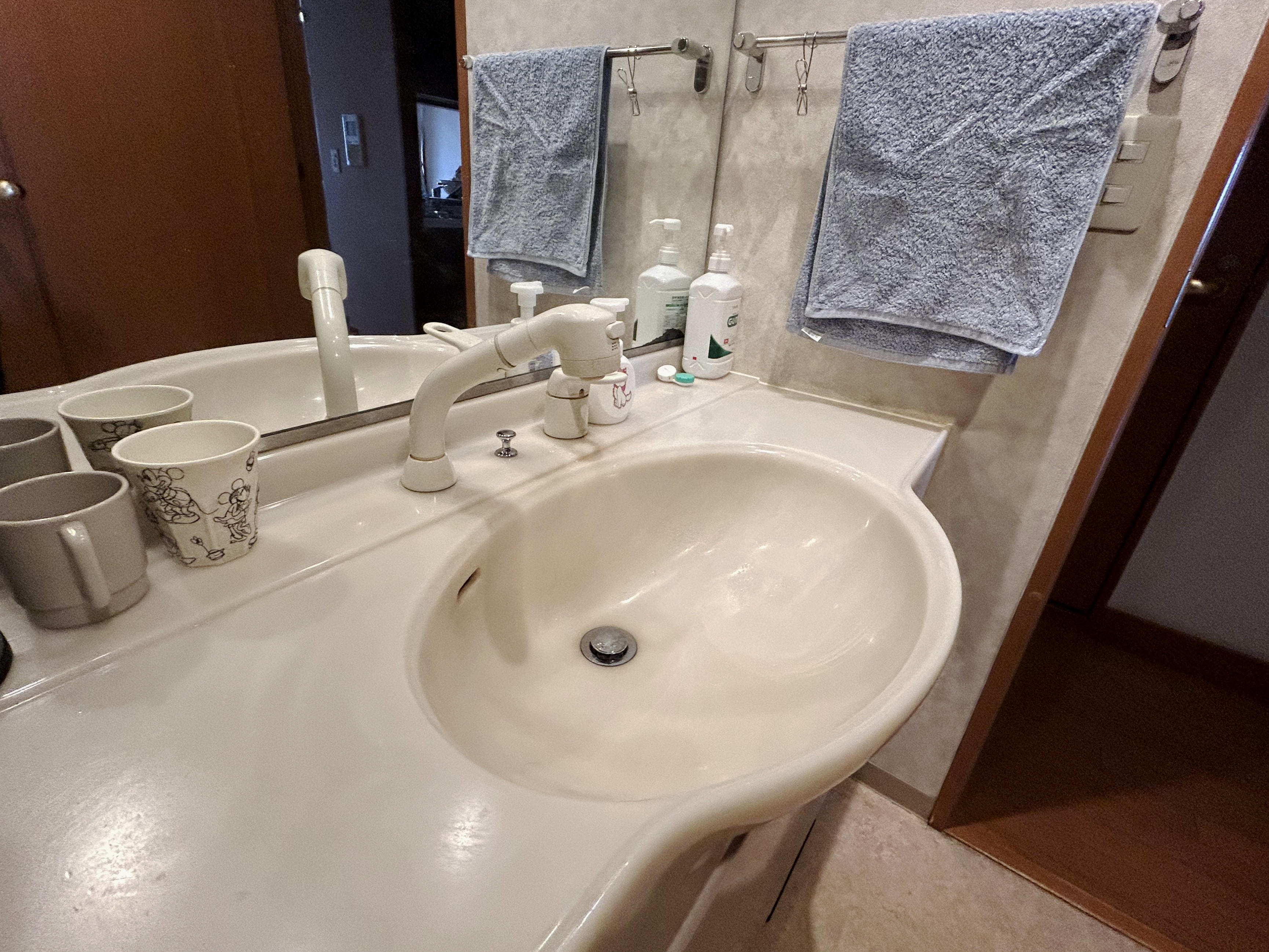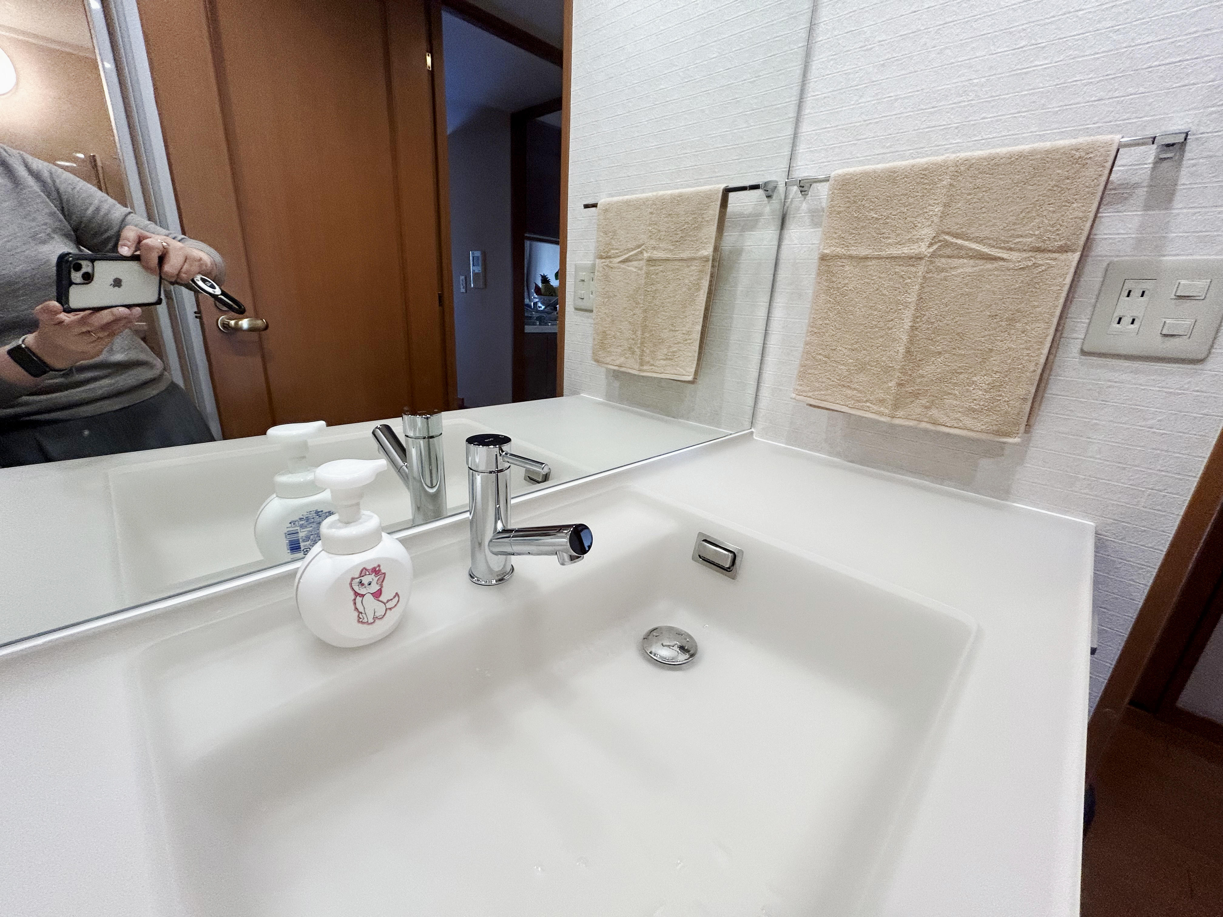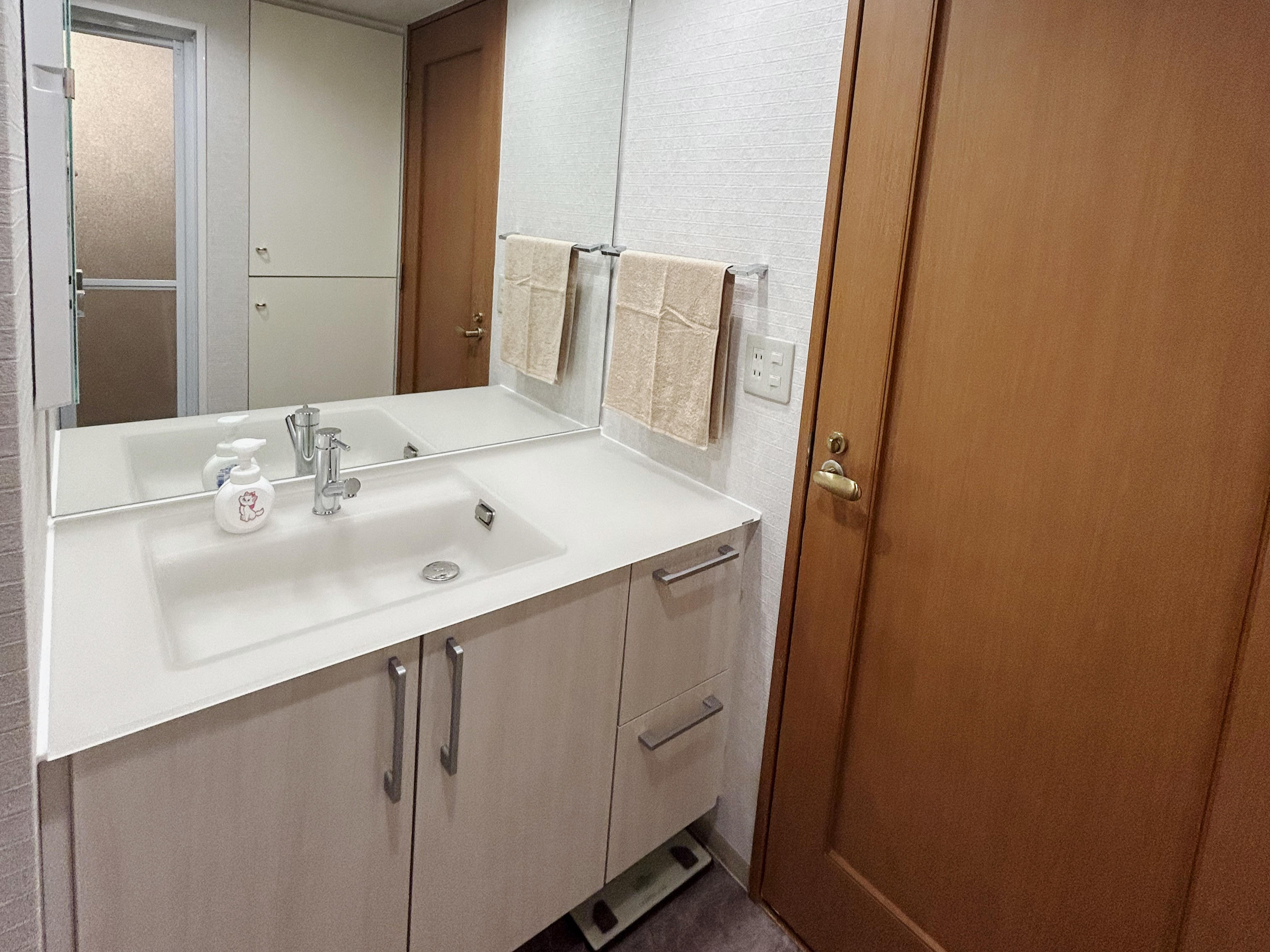 以前は中央にあった洗面ボウルが左寄せになったため、スペースのできた右側にコンセントを移設いたしました。ドライヤーなどを使う時にスペースがあると便利です。台の下には体重計を収納できるスペースも忘れずに。洗面化粧台:TOTO エスクアカウンター:CR75 クリスタルグレージュ扉:H ペアホワイトウッド