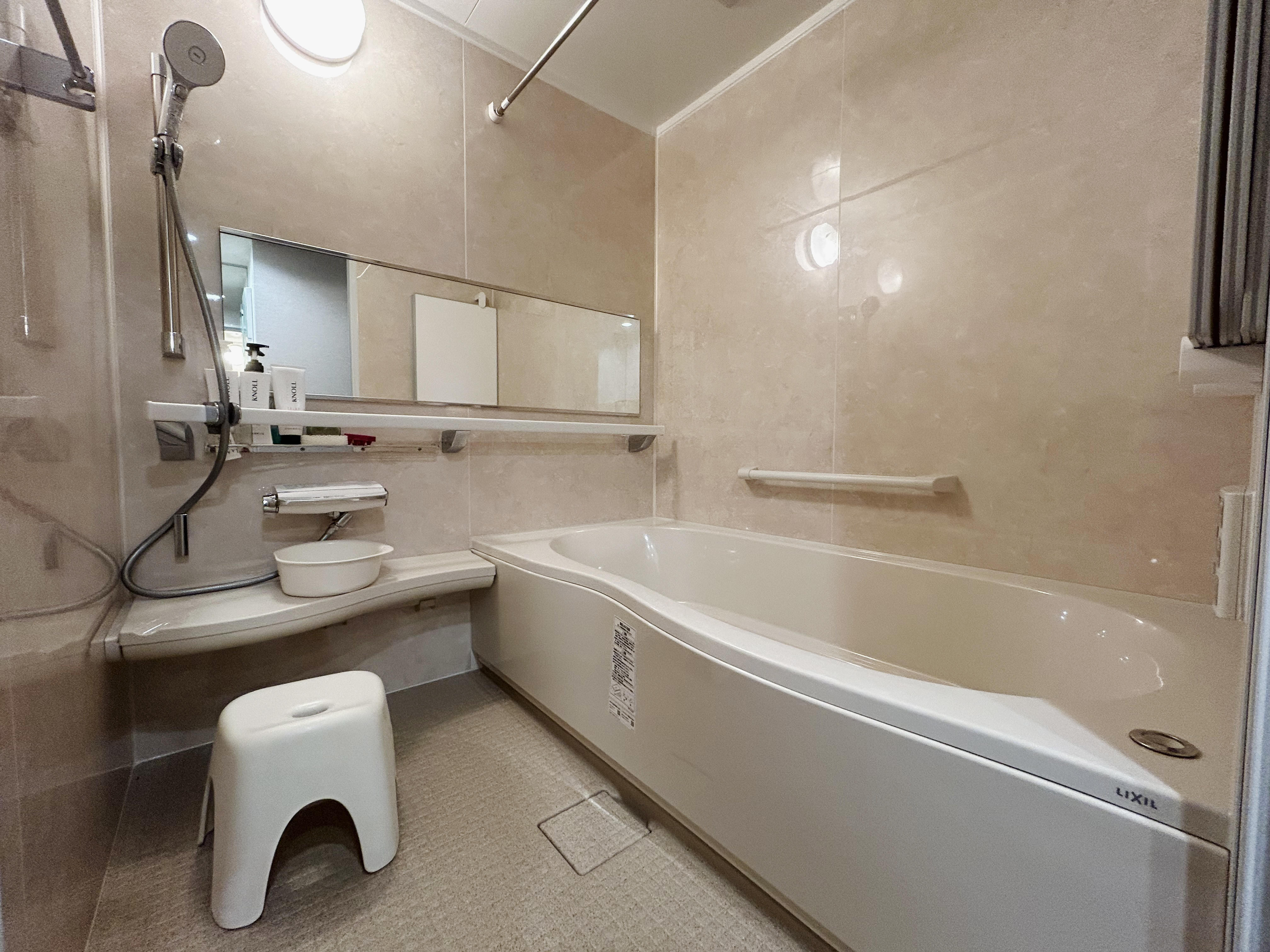 浴槽は背の高い人でも足を伸ばしてゆっくりくつろげるサイズ。さまざまな位置や角度からも操作しやすい「ワイドレバー水栓」、鏡下に設置されている洗い場での立ち・座りや洗い場から浴槽への移動をエスコートしてくれる「スマートエスコートバー」(手すり以外にも収納棚としての役割も兼備)など、選択された仕様で「皆が使いやすい」が考えられたお風呂です。浴室:LIXIL リノビオV
