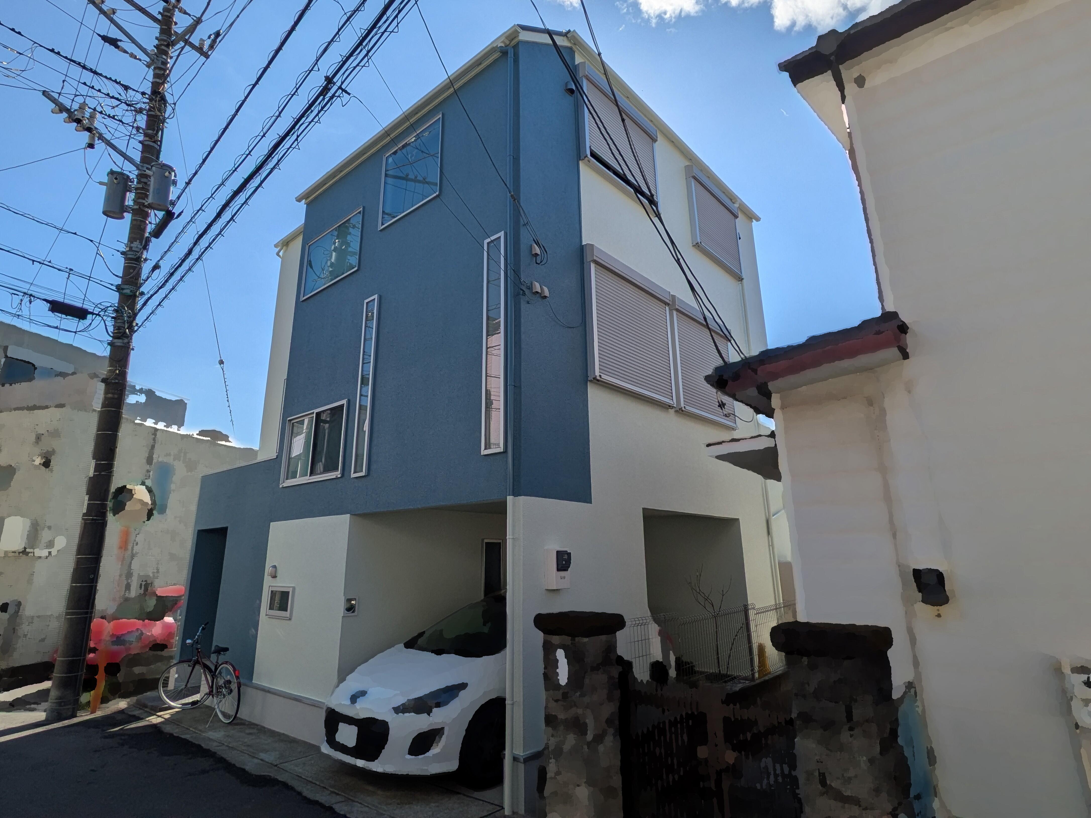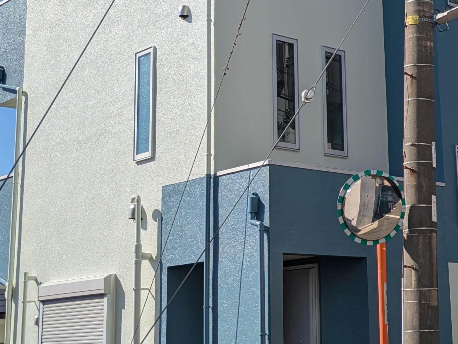 以前の外壁は、白・グレー・濃い目のグレーとシックな色合いで3色使用しておりましたが、今回は薄いグリーンと濃い目のくすみブルーの2色で爽やかで明るい仕上げりとなりました。
