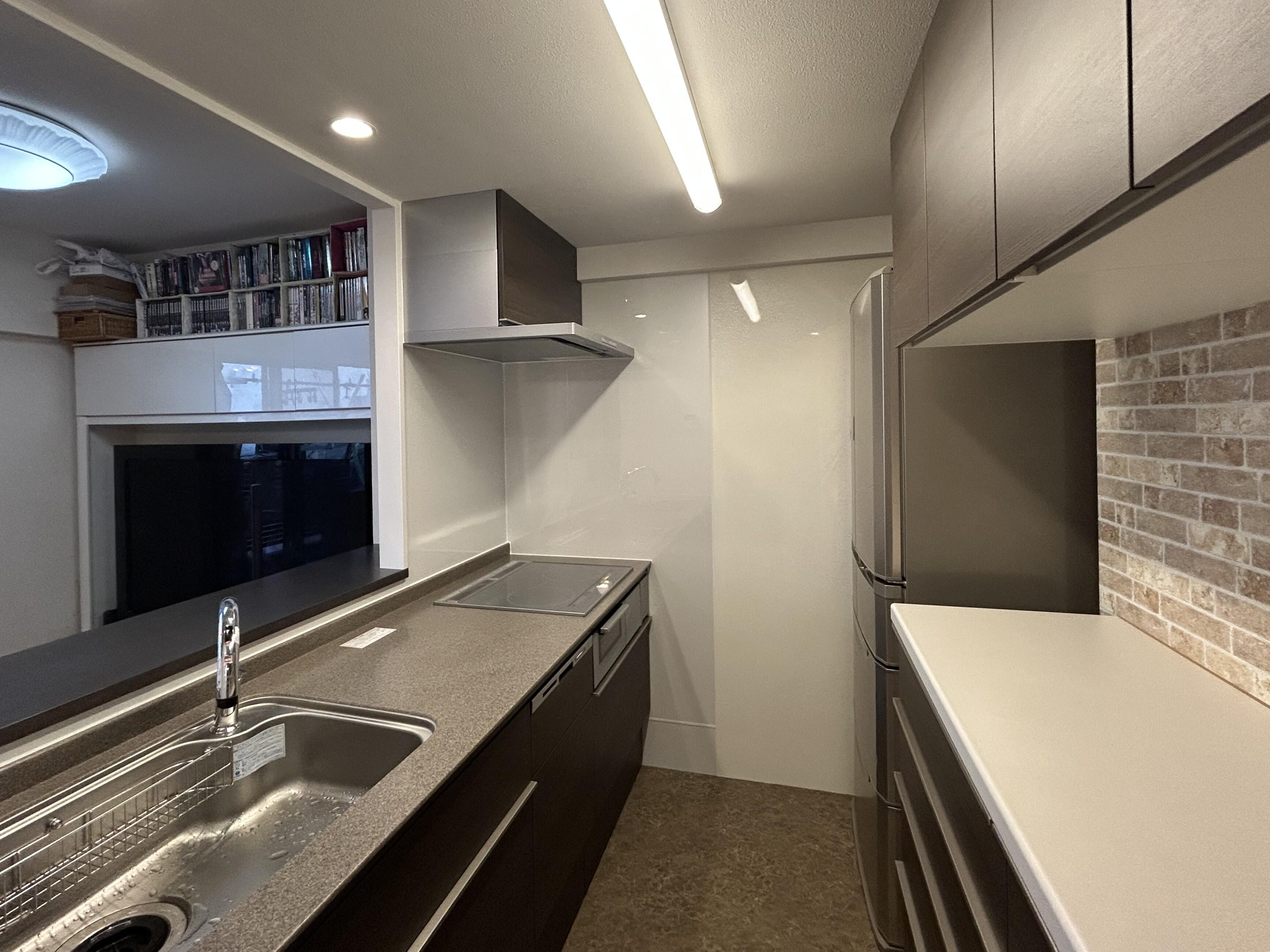 ダイニング側から見たキッチンは、落ち着いた木目の扉と明るいレンガ調の壁が調和し、色を変えて新しく仕上げたカウンターが空間に心地よいアクセントを添えています。インテリアとしても美しく、日々の家事が楽しくなるようなキッチンへと生まれ変わりました。