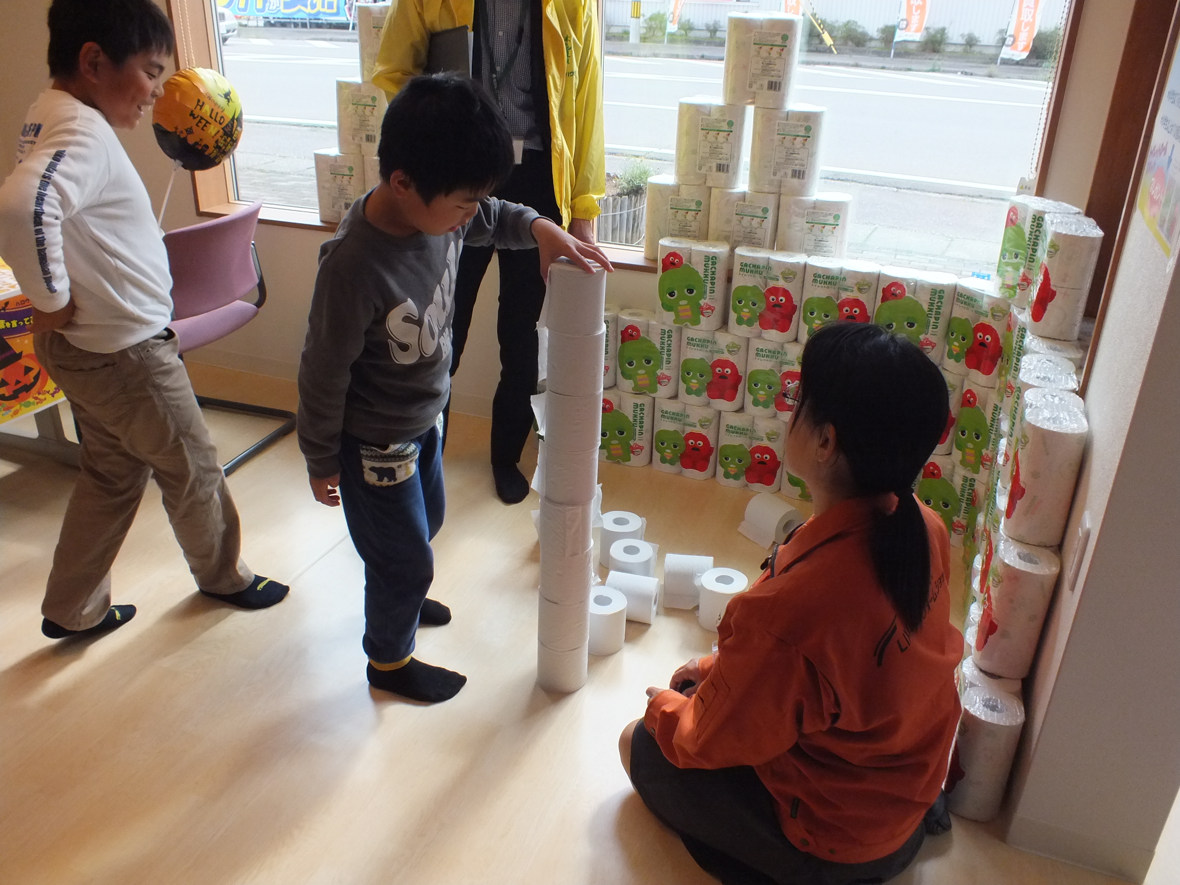 キッズコーナーで盛り上がったのは、トイレットペーパータワー積みゲームです。