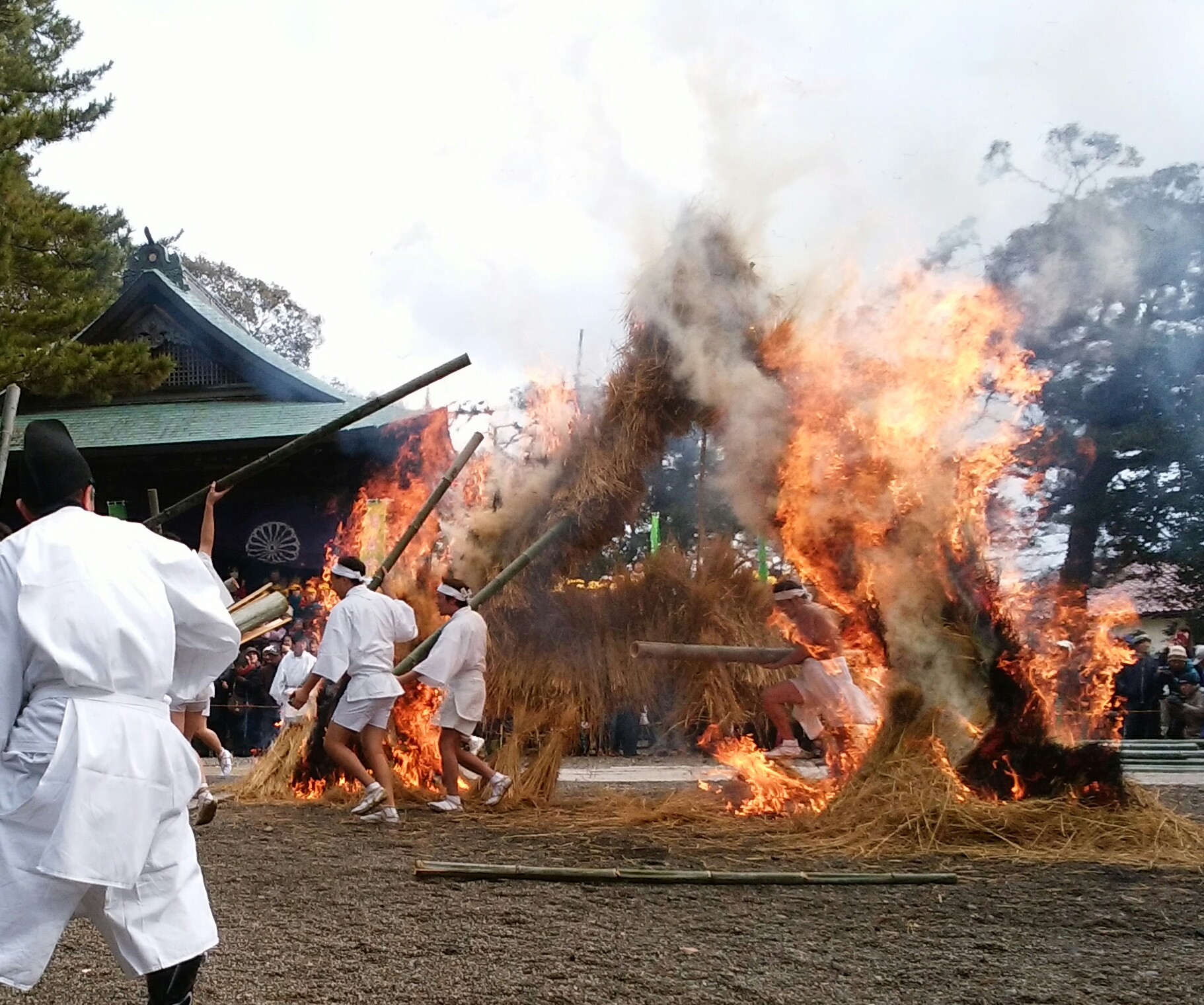 境内の中央に用意された竹組みのわらのあずまやに点火