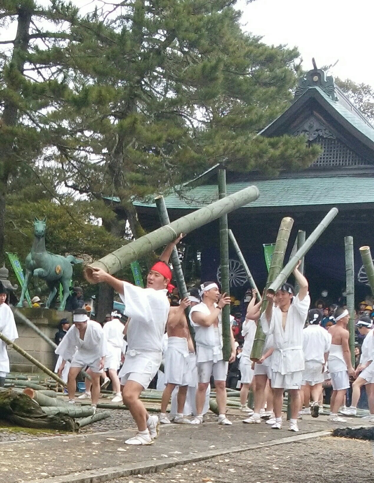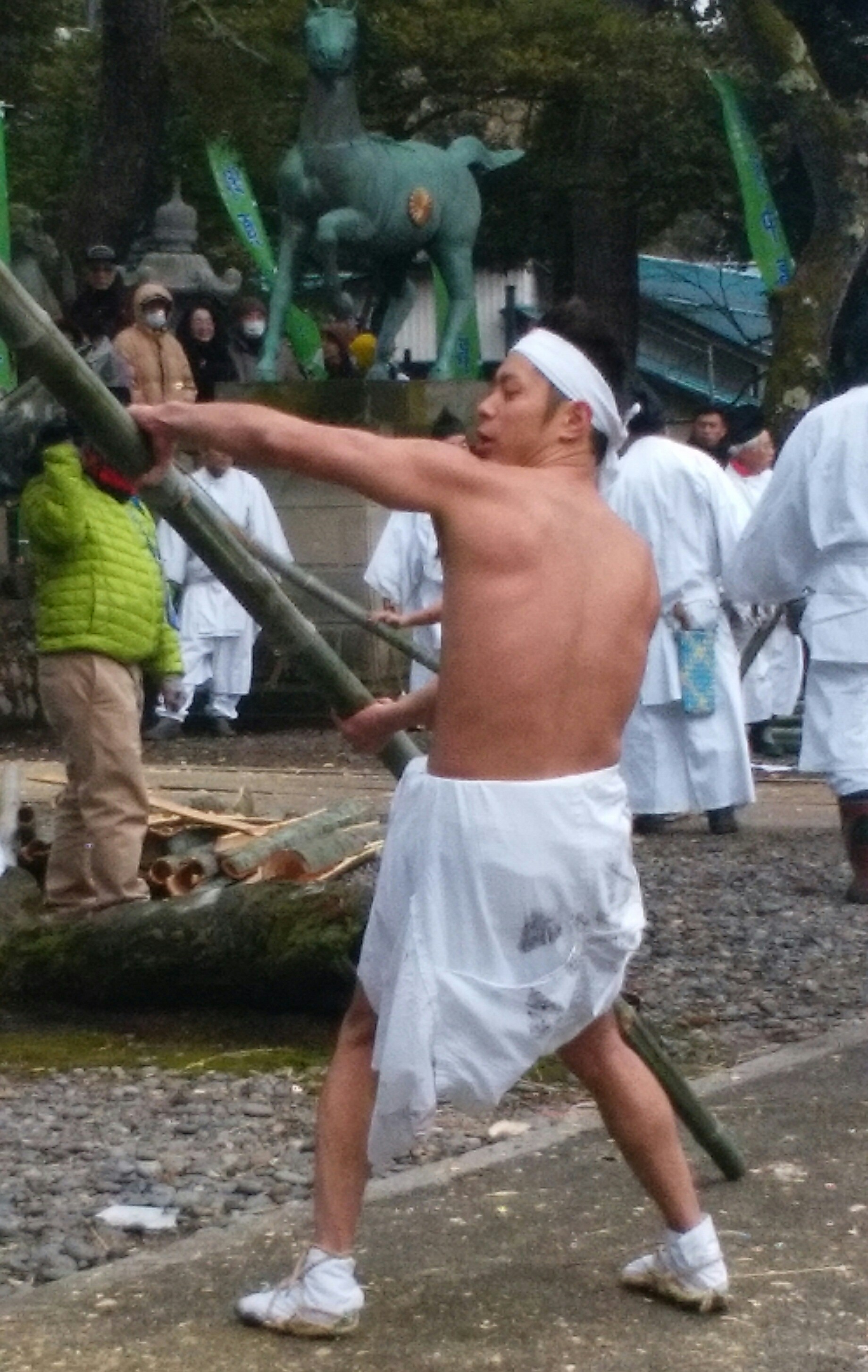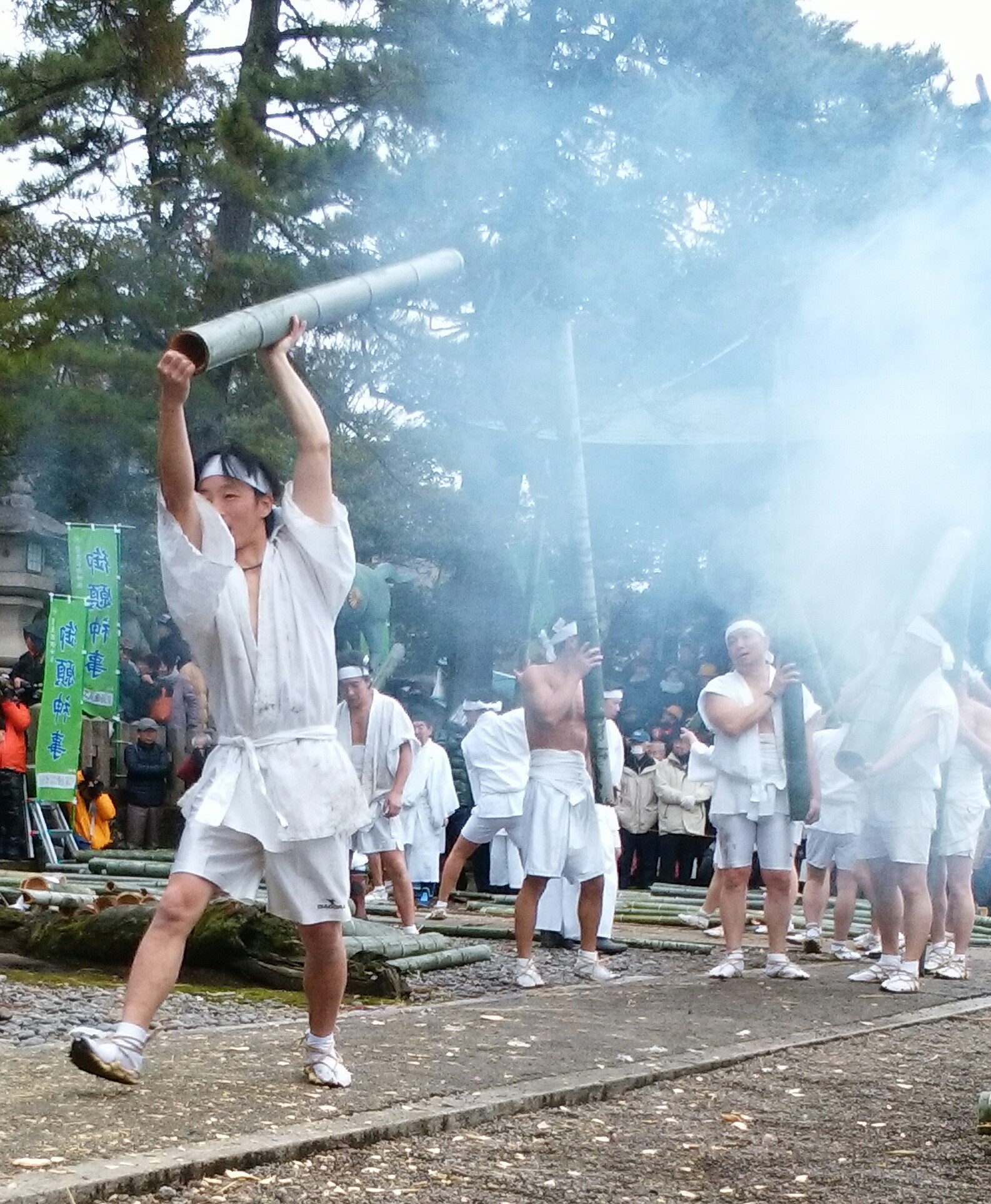 白衣をまとった岡町の青年が境内になだれ込み、石段や石畳に青竹をたたきつけて割る。