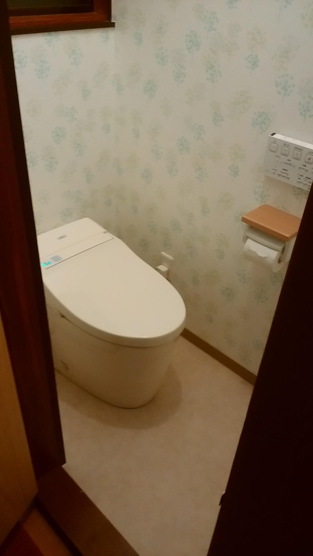 TOTOのDHシリーズです。便座に座ると、自動で便器にミスト(水道水)をふきかけて、水のクッションを作り、便器表面をツルツルにする「セフィオンテクト」との相乗効果で、便器を汚れから守ります。タンクレスでトイレが広くなり、壁紙とクッションフロアを張替えし落ち着いた空間になりました。