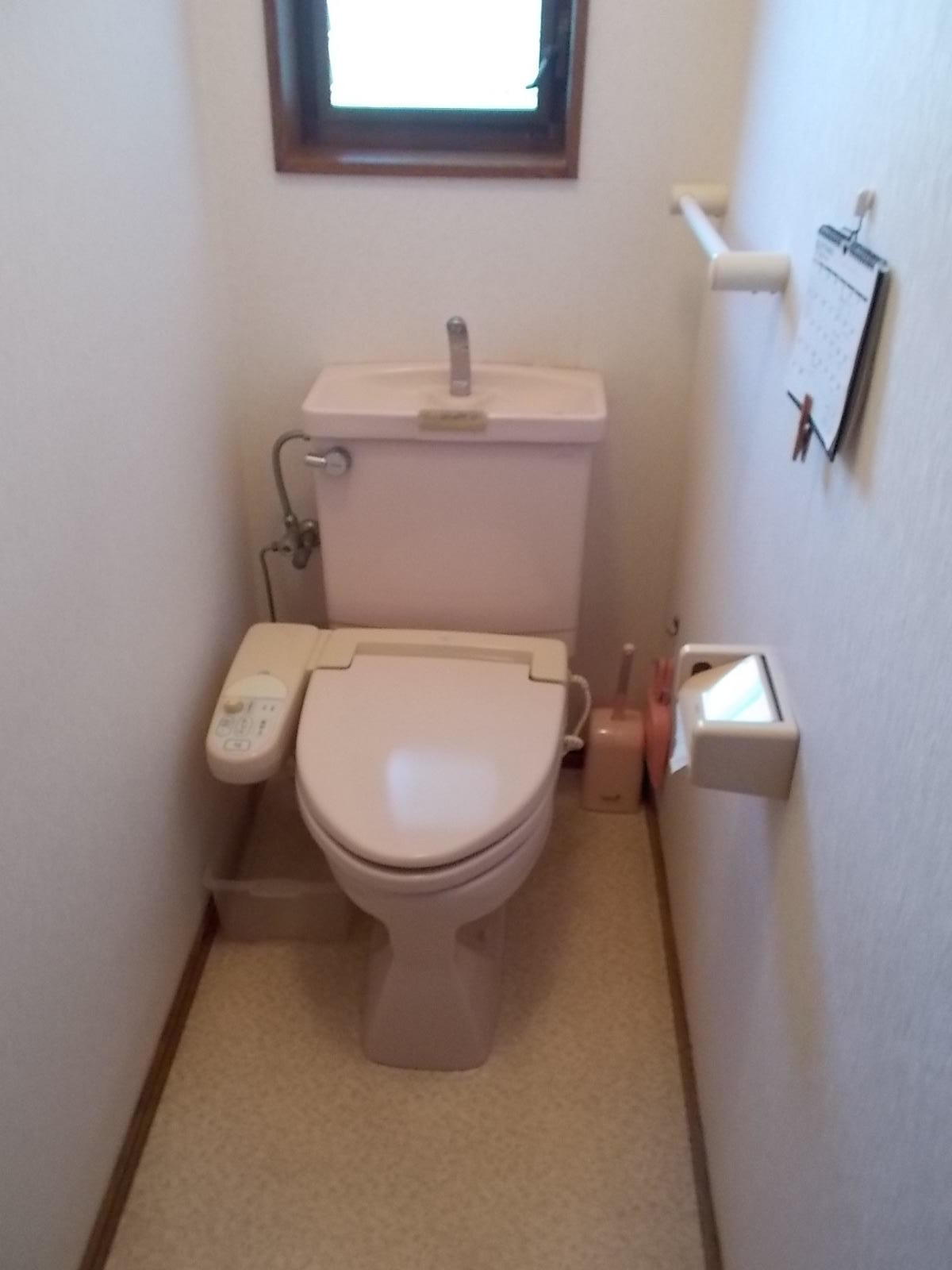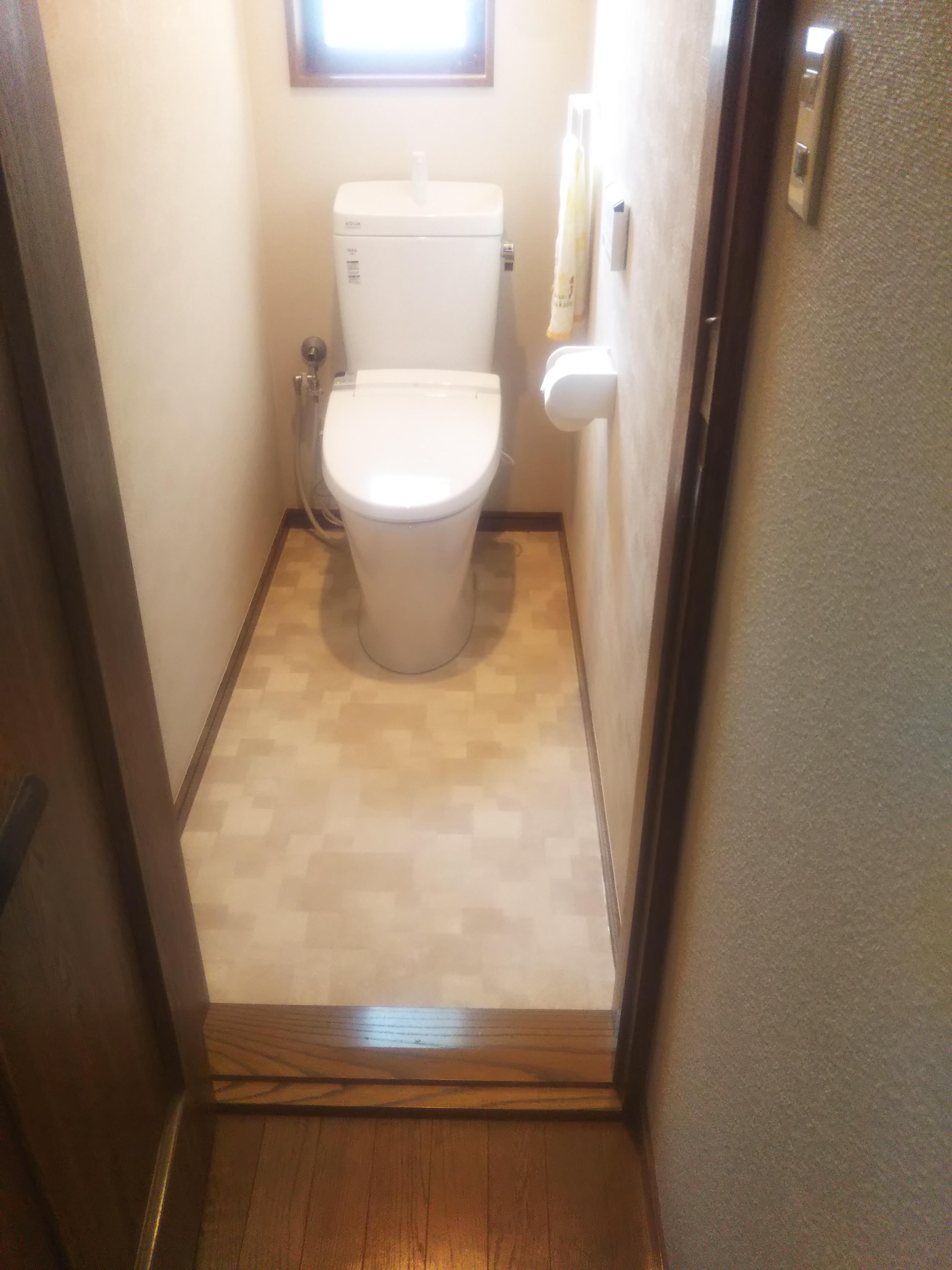石川県加賀市 M様邸 2019年 9月 25日 2Fトイレの便座部から水漏れが発生し、既存のトイレも古いことから便器、便座共に交換しました。その際、天井、壁のクロス、床のクッションフロアーも張り替えました。