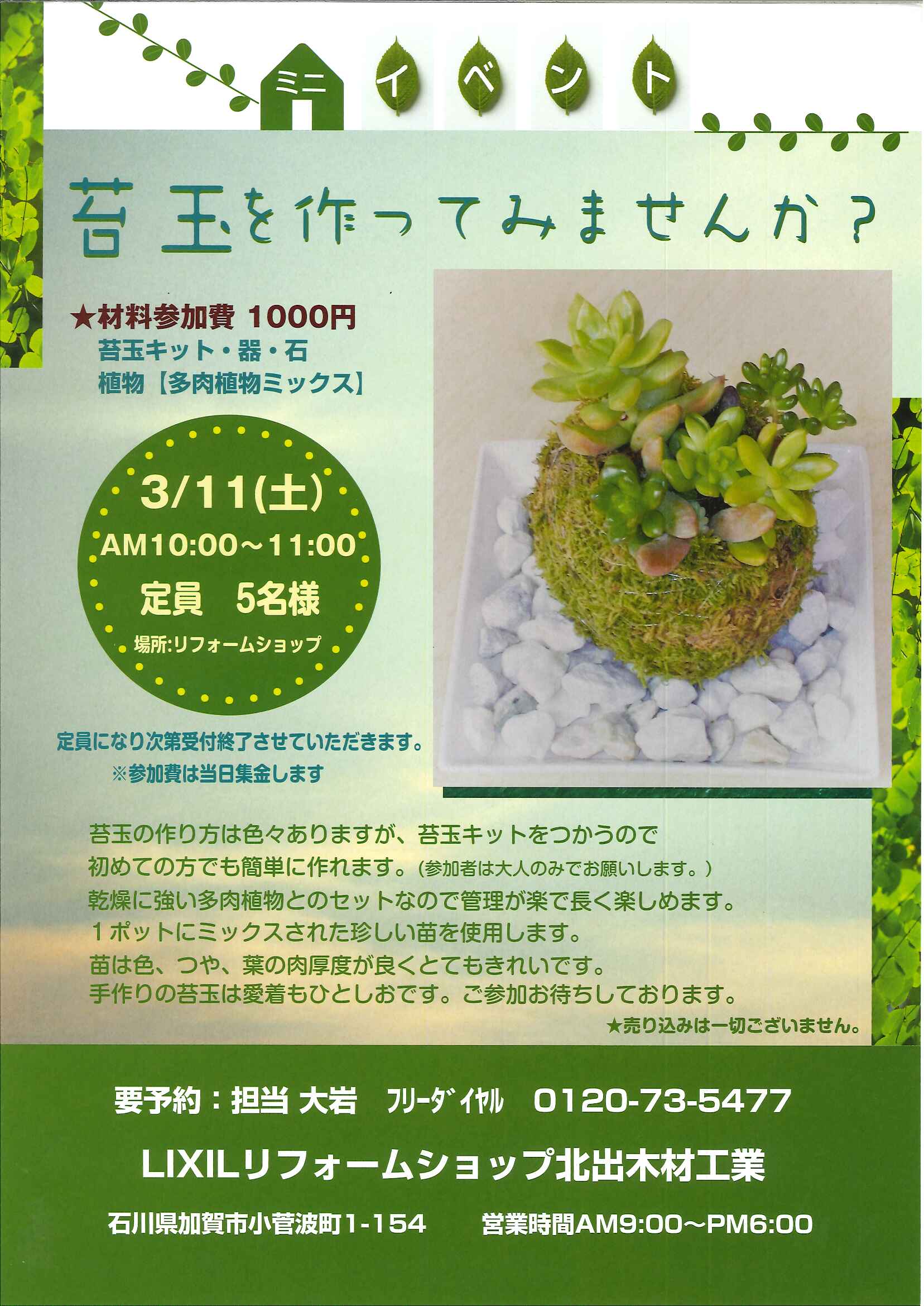 定員5名様です。お早目にご連絡お願いします。