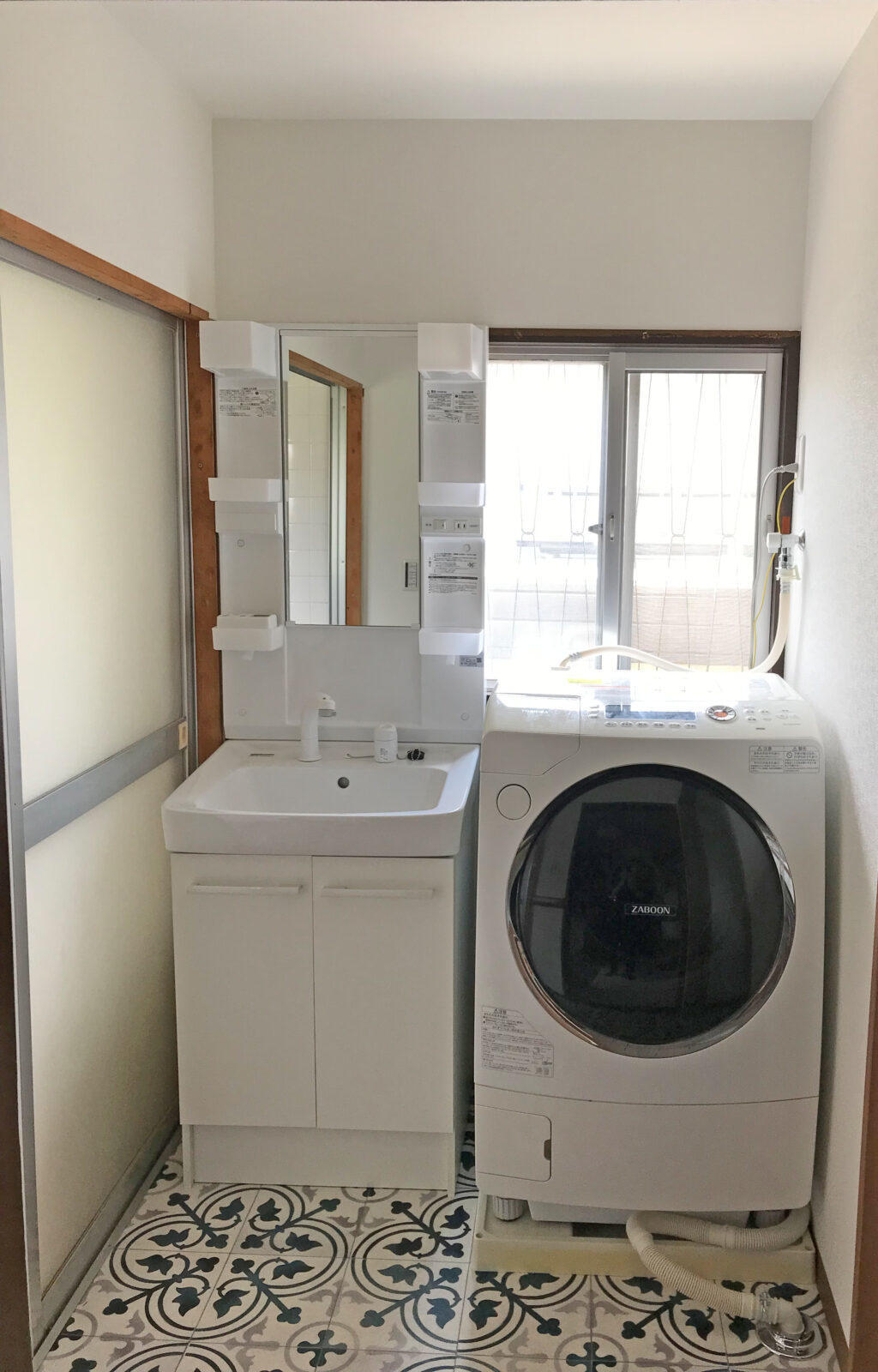 洗面台と洗濯機の位置をチェンジ。以前は水しか出なかった洗面。お湯も出る水栓に。