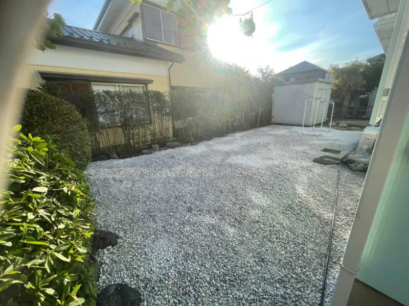 お庭に砂利を敷くことで水はけがよくなるため水たまりができることを防いでくれたり、砂利を踏むと音がなるため防犯対策にも繋がったりといった機能性も兼ね備えています。