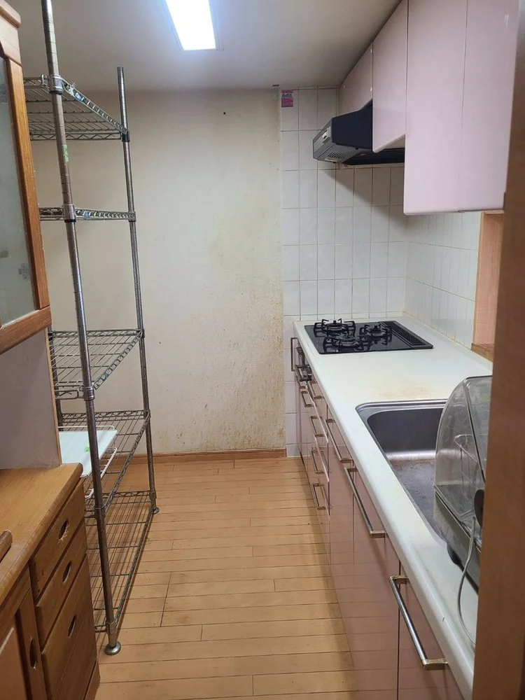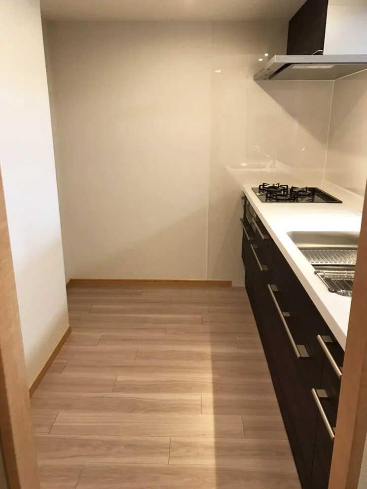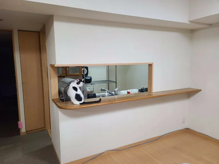 リビングと仕切られていた壁を広げて、スッキリとした空間に。 背が高いご家族のため思い切って吊戸棚を無くして、上部を気にすることなくストレスフリーで動けるようにしました。 高い部分の収納スペースは減りましたが、シンク下収納を引出しタイプにすることで効率よく収納出来るようになりました。 また、ねこちゃんの足にも優しい、滑りにくい床材に改修。 上から貼るタイプのフローリング材なので、工期短縮とコストも◎