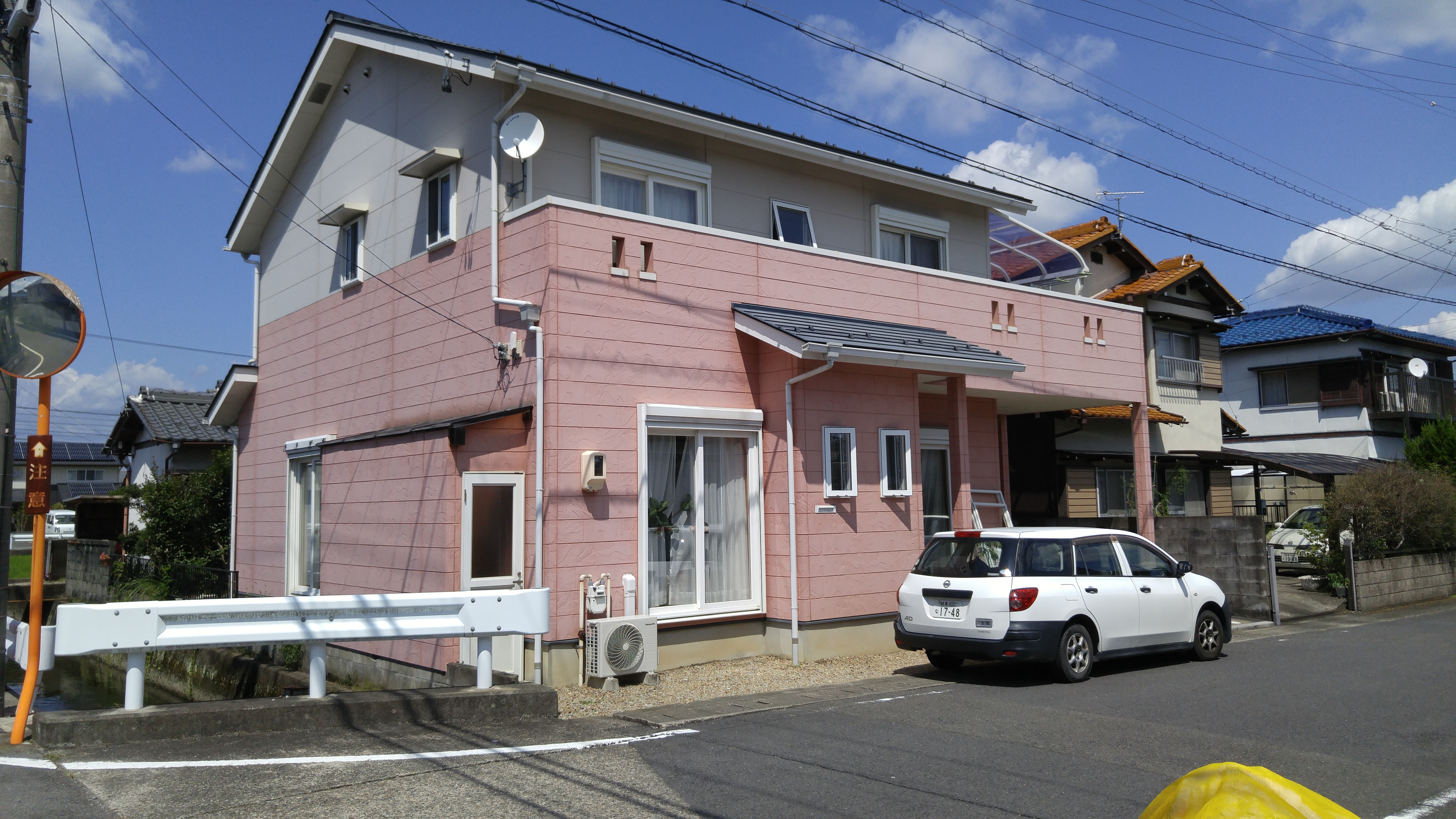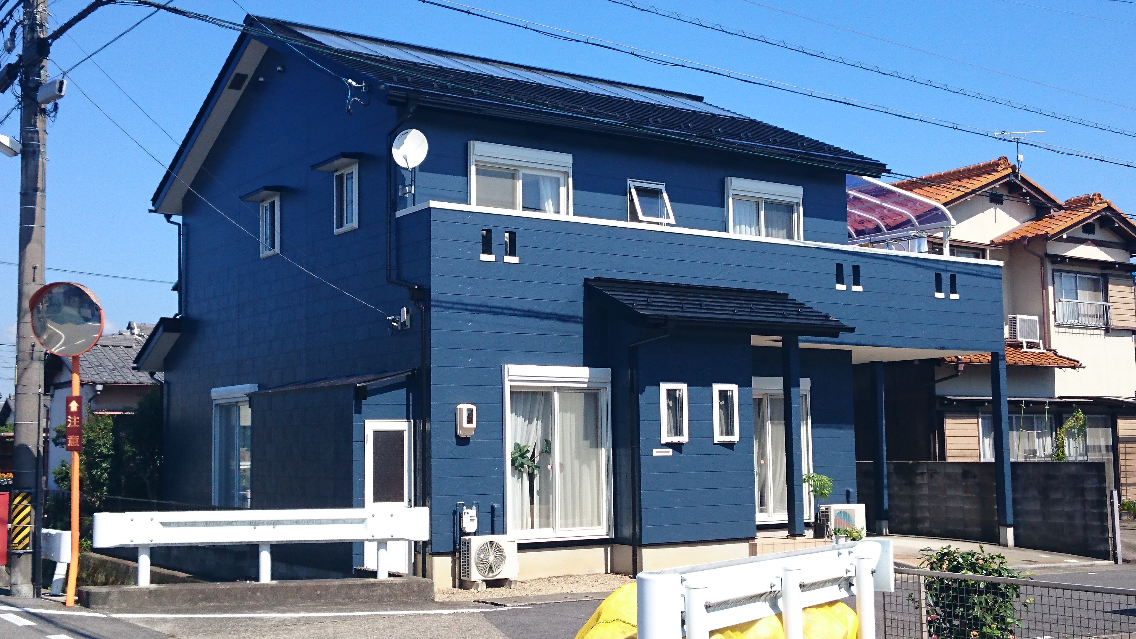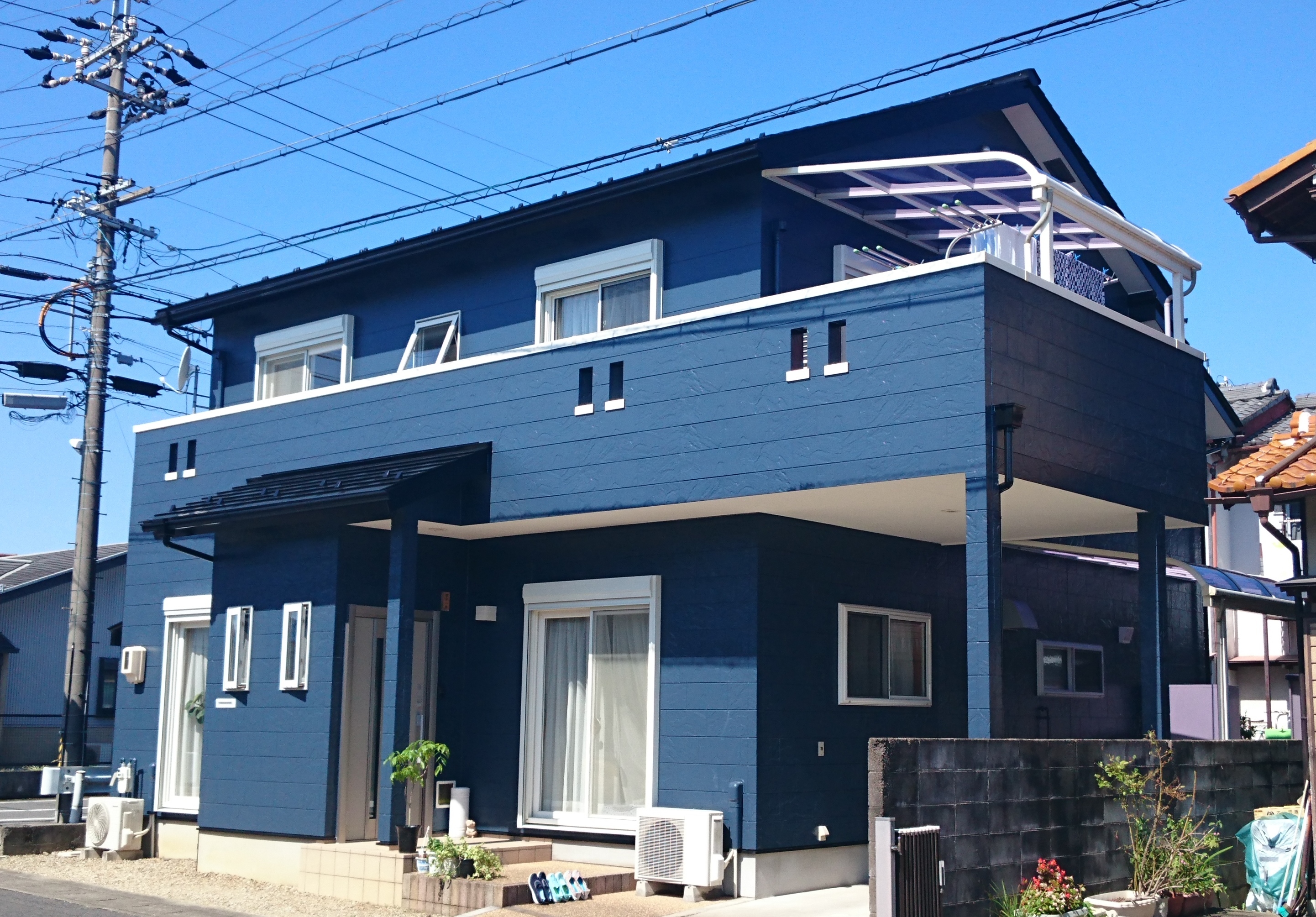 白とピンクの暖色系から一転、鮮やかなダークブルーを選ばれ、白いサッシが映えるモダンテイストな外観となりました。使用塗料は安全性と耐候性に優れた「水性シリコン塗料」です。汚染物質を洗い流す効果があり、またセラミック配合により汚れを寄せ付けにくくします。防カビ・防藻性もあり、美観を保ちます。