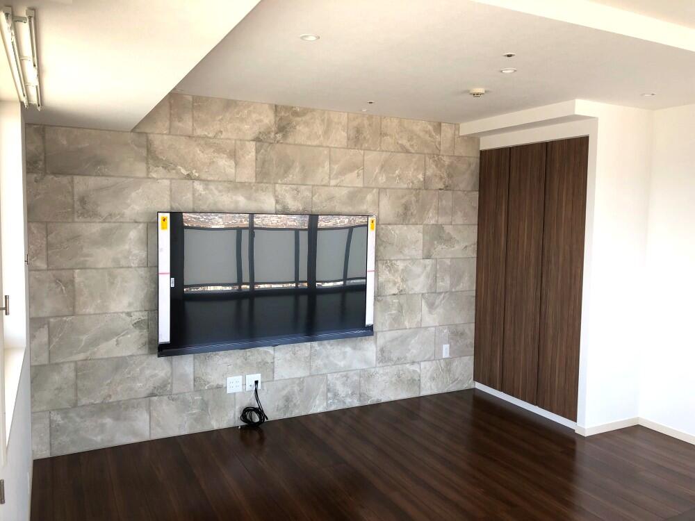 壁掛けテレビの背面には調湿・脱臭効果のある「エコカラットプラス(サンティエ/アイボリー)」を配し、清潔感と高級感を演出しました。
