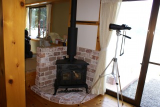 リビングの一角に設置、床と腰壁を耐火レンガで守っています。