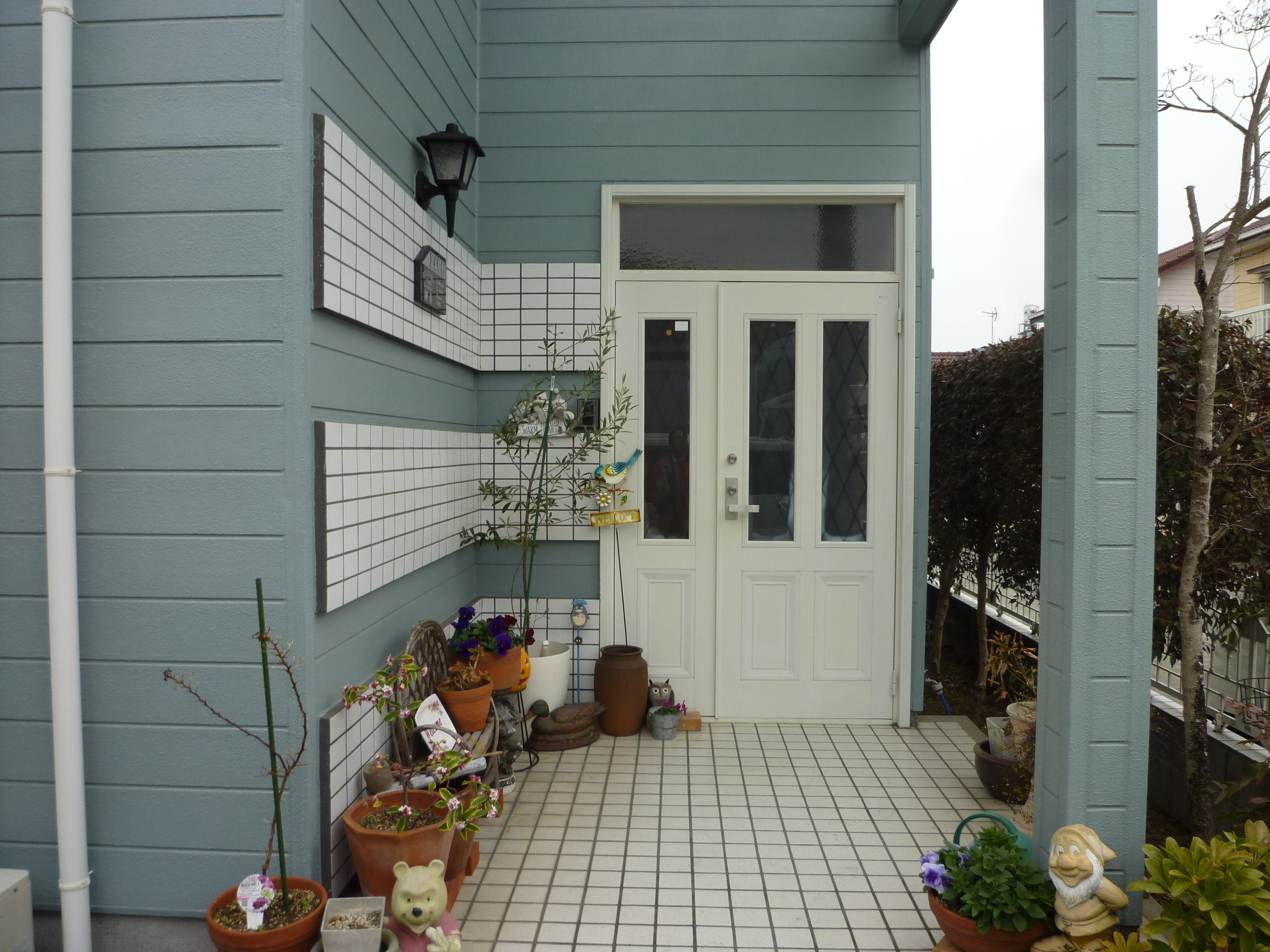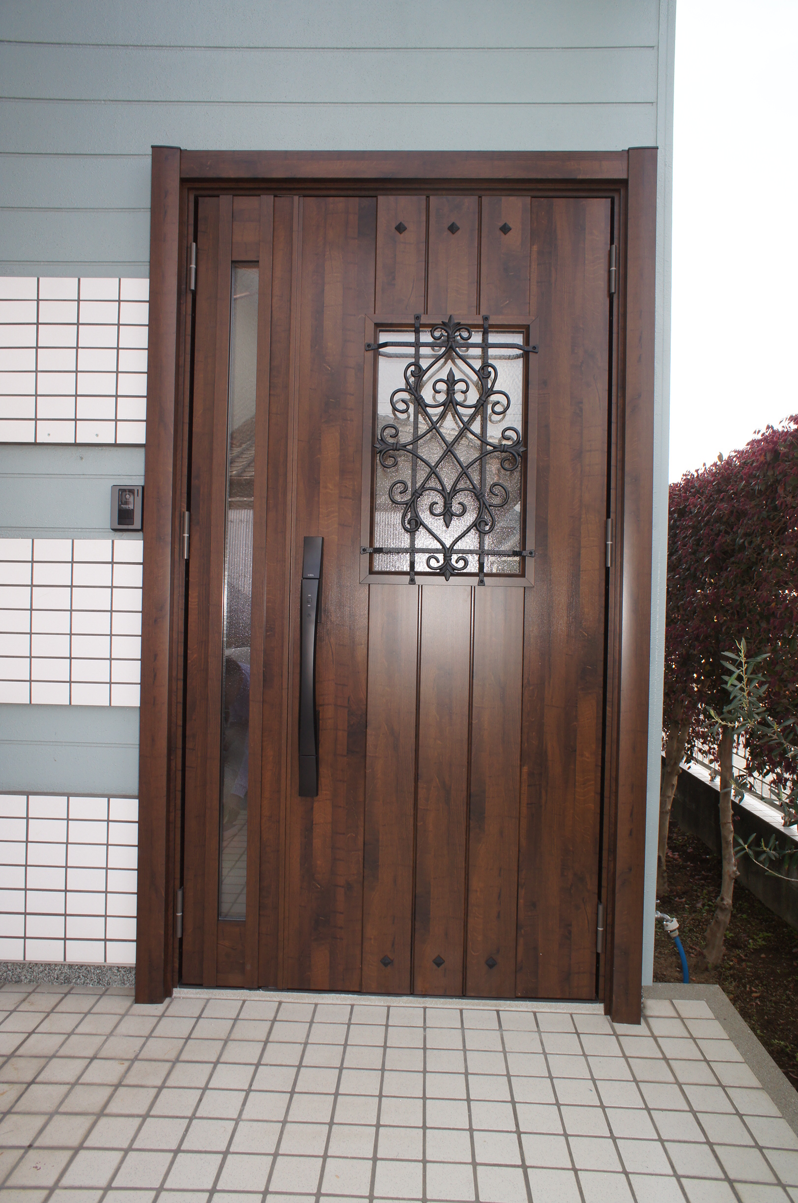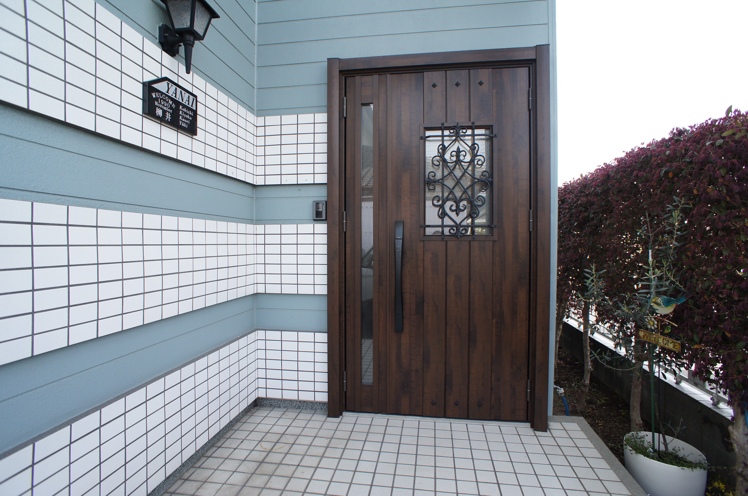 リフォーム玄関ドア『リシェント』を取り付けました。 工事は一日目で戸締りができ、二日目で仕上げをします。 落ち着きのある飾り窓つきの木調のドアは暖かみがあり 素敵な家の新しい顔になりました。