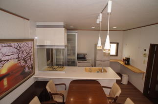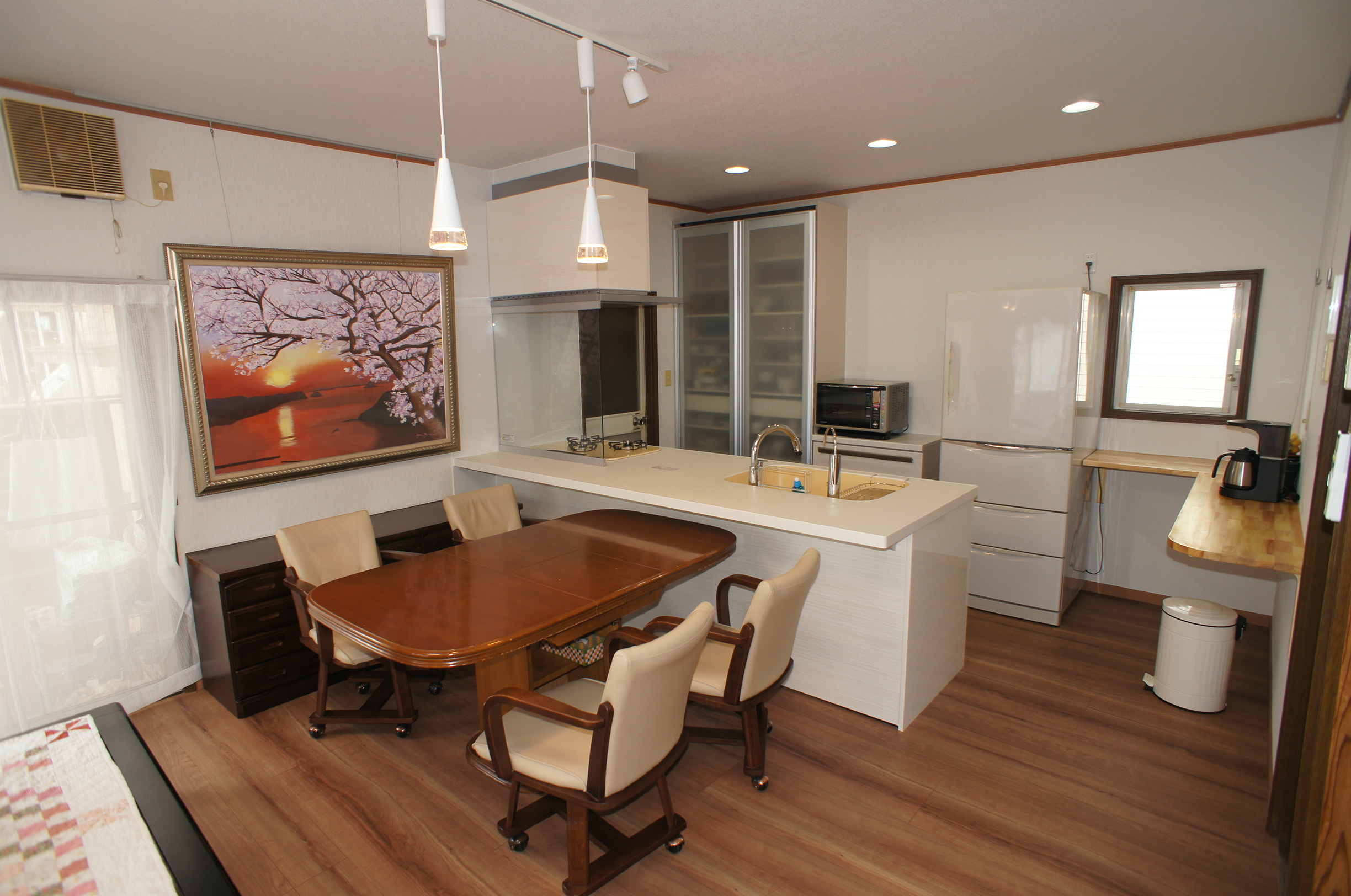 上がり壁を撤去してアイランド型のシステムキッチンを取り付け、 明るく開放感のある空間になりました。