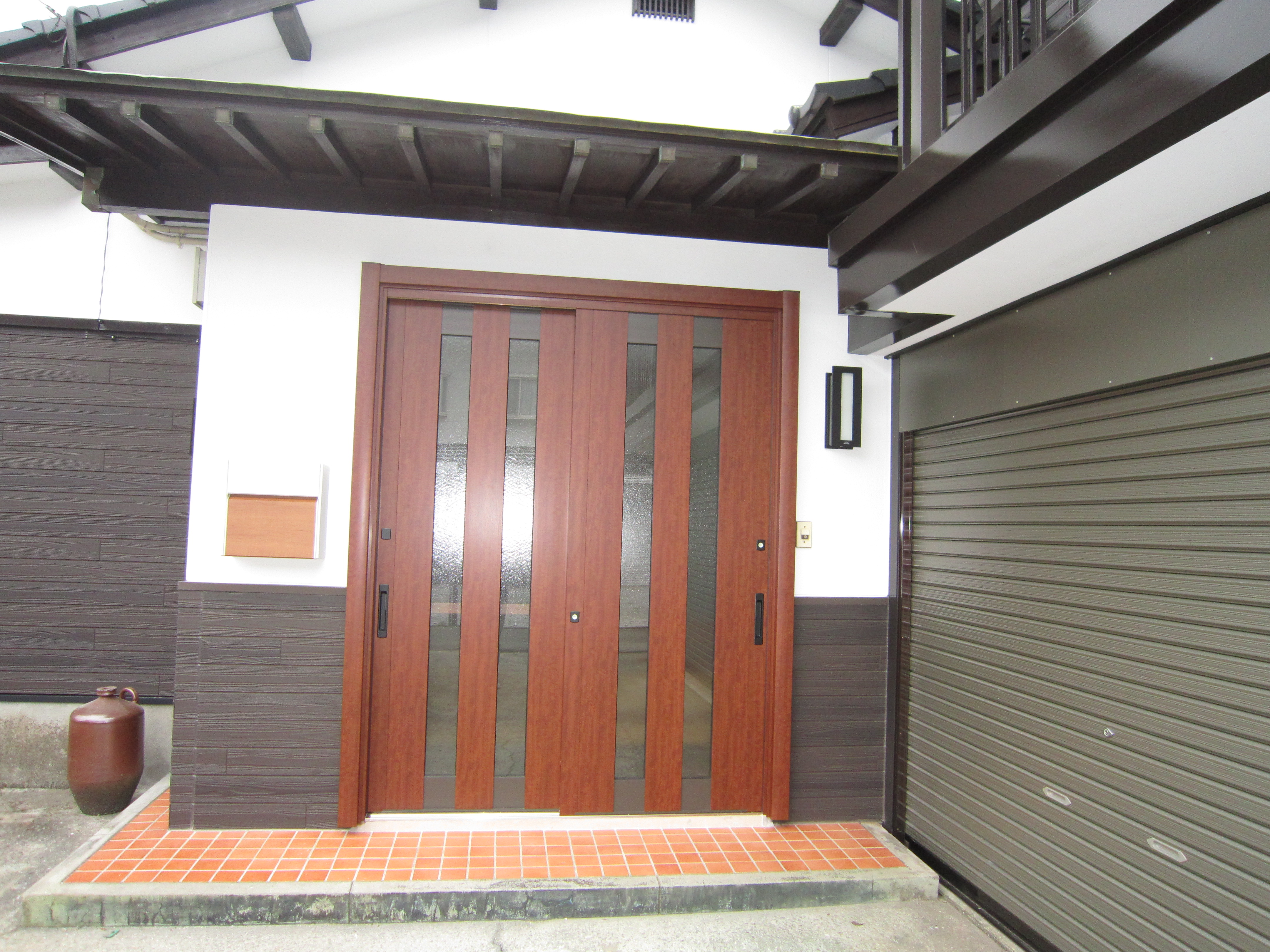 お家の顔である玄関をリフォームしました。既存の枠を残して、その上に新しい枠を取り付けるカバー工法で工事を行いました。