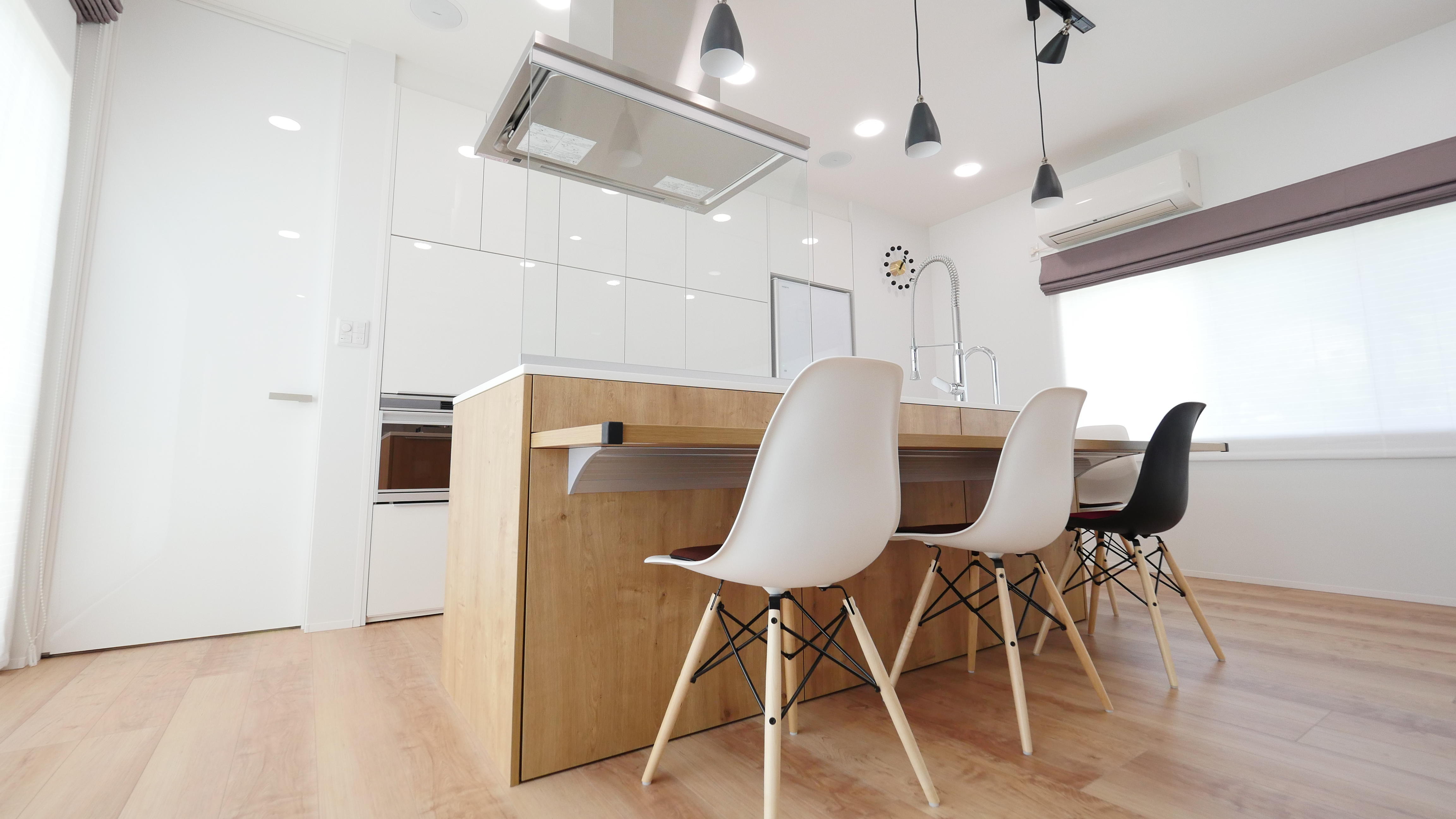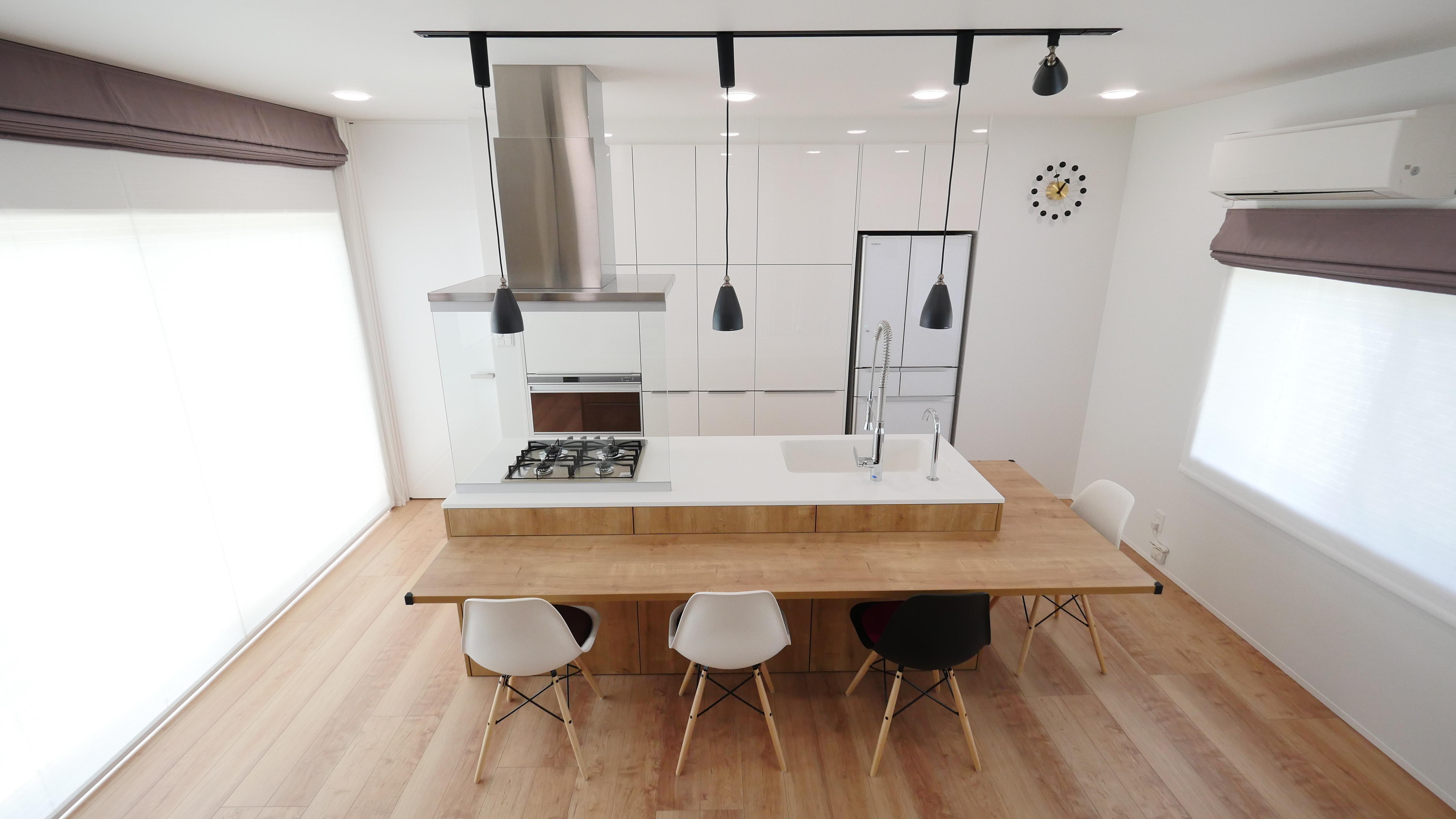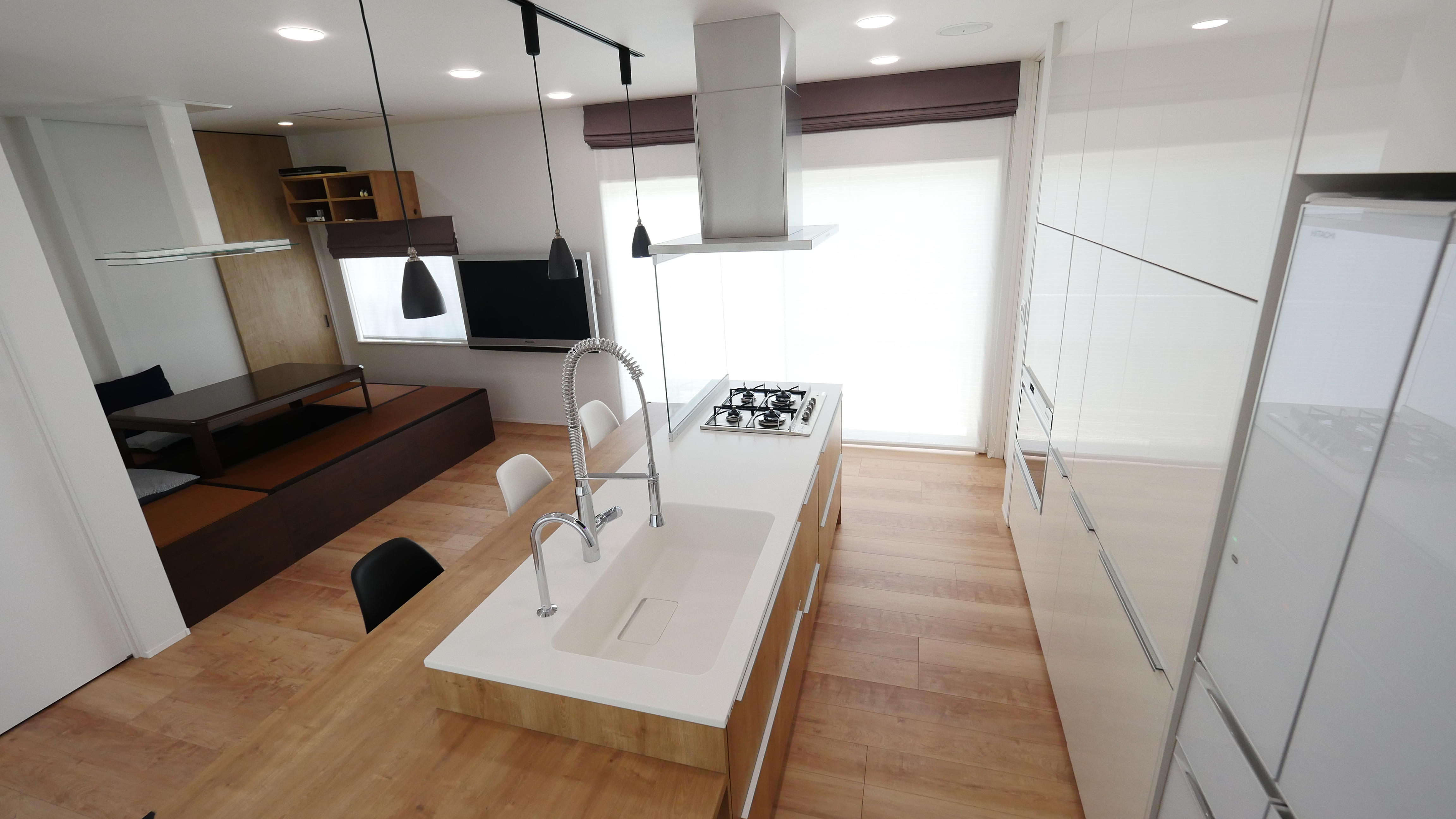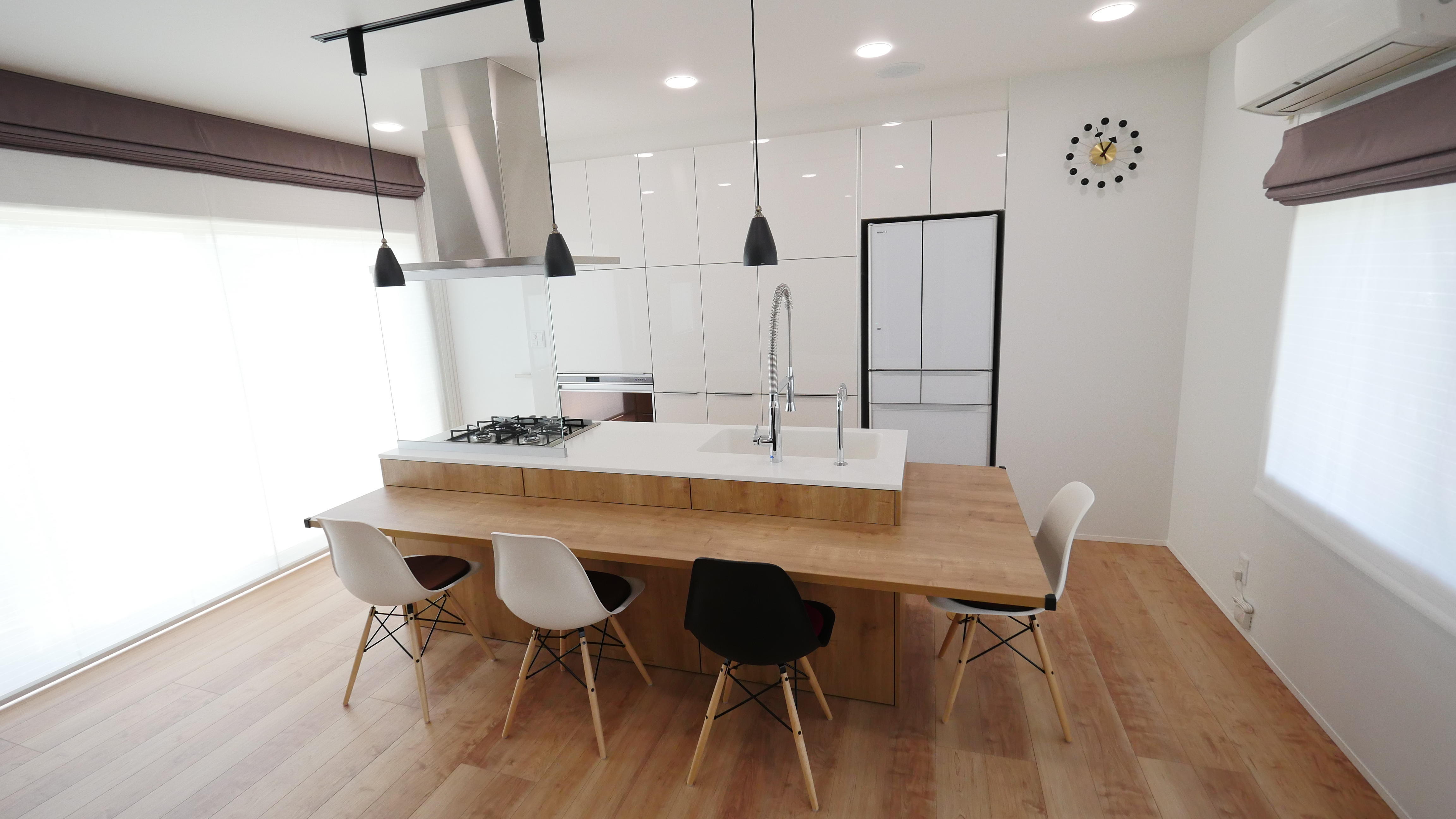 お施主様のご要望は、キッチン全体を主体としたお店のようなお部屋を作って欲しいということでした。既設キッチンの面積では十分な広さがないのでリビングとキッチンのエリアを入れ替え、”カフェ(お店)”の様に、ご家族、お客様をお迎えできる配置にしました。