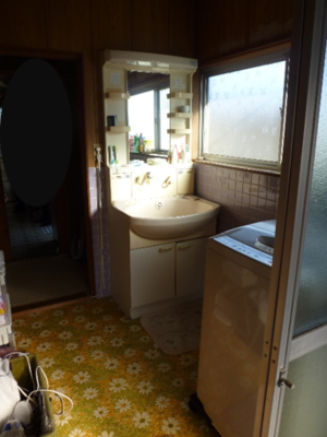 大きな窓があるのに板張り壁で暗くて寒いとお悩みだった洗面脱衣室。床も湿気であちこちがふわふわしていました。洗面化粧台は収納が少なく、日用品が出ていてスッキリしない印象・・・。