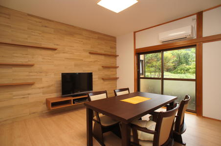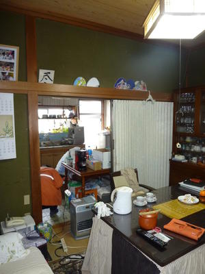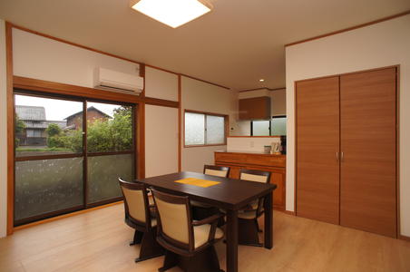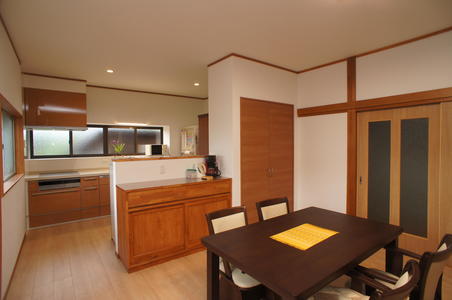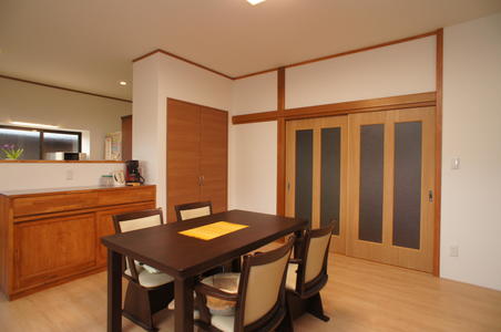 間仕切壁を撤去し、一体的な空間に生まれ変わりました。お手持ちの食器棚を配置するための壁の後ろには大容量の収納を設け、スッキリ片付く工夫をしました。想い入れのある長押は、色だけ合わせてそのまま活かしました。