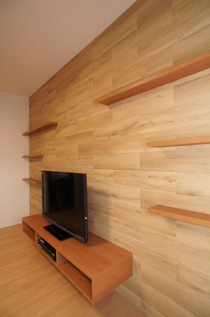 テレビボードの後ろはアクセントに木目調のタイル張り。調湿・消臭効果のある『エコカラット』は色も形も模様も様々です。アクセントにもなってお部屋の空気をきれいに・快適にしてくれる優れものです。いっぱい飾ってあったご家族の写真は、テレビまわりに飾れるように棚を設けました。
