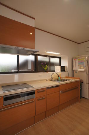 セラミックトップの『リシェルSI』はお掃除らくらく♪キズにも強い!汚れやキズを気にせず料理を楽しむことができるようになりました。タイル張りだった壁もフラットなキッチンパネルに張替え、サッと拭くだけできれいになります。扉カラーはツルッとした木目で、汚れも付きにくく落ち着いた空間になりました。
