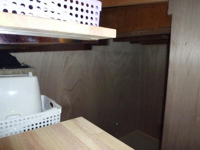 中段と天井を撤去して、階段の踏み板の高さまで使えるようにしました。横壁に可動棚板を設け、置くものの大きさによって棚を移動できるようにしました。