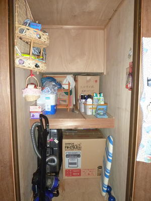階段の下なので、奥の方は天井が低くなっています。いわゆる押入れと同じように中段があり、手前の物を出さないと奥の物の出し入れができません。納めたものがどこにあるか、何があるのか一目でわかりません。